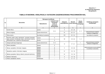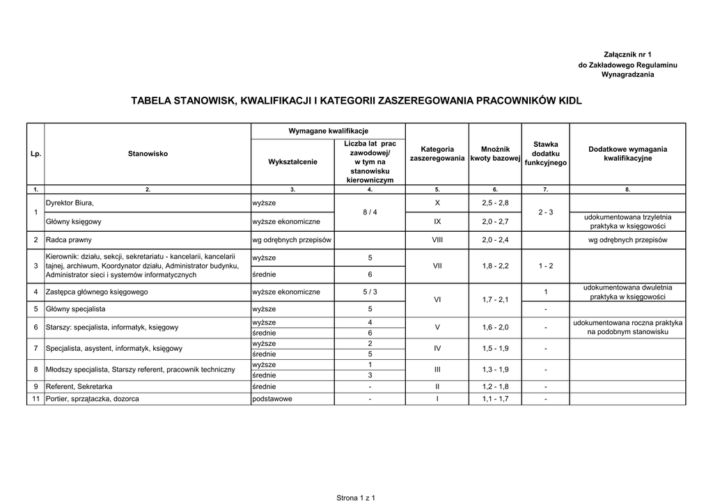 Załącznik nr 1 do Zakładowego Regulaminu Wynagradzania TABELA STANOWISK, KWALIFIKACJI I KATEGORII ZASZEREGOWANIA PRACOWNIKÓW KIDL Wymagane kwalifikacje Lp. Wykształcenie Liczba lat prac zawodowej/ w tym na stanowisku kierowniczym 3. 4. Stanowisko 1. 2. Dyrektor Biura, wyższe 1 Kategoria Mnożnik zaszeregowania kwoty bazowej 5. 6. X 2,5 - 2,8 8/4 Stawka dodatku funkcyjnego Dodatkowe wymagania kwalifikacyjne 7. 8. 2-3 Główny księgowy wyższe ekonomiczne IX 2,0 - 2,7 udokumentowana trzyletnia praktyka w księgowości 2 Radca prawny wg odrębnych przepisów VIII 2,0 - 2,4 wg odrębnych przepisów Kierownik: działu, sekcji, sekretariatu - kancelarii, kancelarii tajnej, archiwum, Koordynator działu, Administrator budynku, Administrator sieci i systemów informatycznych wyższe 5 3 VII 1,8 - 2,2 średnie 6 4 Zastępca głównego księgowego wyższe ekonomiczne 5 Główny specjalista wyższe 5 wyższe średnie wyższe średnie wyższe średnie 4 6 2 5 1 3 V 1,6 - 2,0 - IV 1,5 - 1,9 - III 1,3 - 1,9 - średnie - II 1,2 - 1,8 - podstawowe - I 1,1 - 1,7 - 5/3 1 VI 6 Starszy: specjalista, informatyk, księgowy 7 Specjalista, asystent, informatyk, księgowy 8 Młodszy specjalista, Starszy referent, pracownik techniczny 9 Referent, Sekretarka 11 Portier, sprzątaczka, dozorca Strona 1 z 1 1-2 1,7 - 2,1 udokumentowana dwuletnia praktyka w księgowości udokumentowana roczna praktyka na podobnym stanowisku