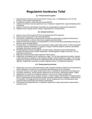 Regulamin konkursu Tefal § 1. Postanowienia ogólne 1. Organizatorem konkursu jest firma Everest Tomasz Lach, ul. Spółdzielcza 3/16, 44-190 Knurów, zwana dalej Organizatorem. 2. Fundatorem nagród w konkursie jest marka BOSCH 3. Udział w konkursie oznacza zapoznanie się z niniejszym regulaminem i jego akceptację przez Uczestnika. 4. Udział w konkursie zobowiązuje Uczestnika do przestrzegania postanowień regulaminu. 5. Regulamin jest częścią umowy między Organizatorem a Uczestnikiem. § 2. Zasady konkursu 1. Konkurs trwa od 25 września 2015 do 02 października 2015 włącznie. 2. Konkurs jest przeznaczony dla osób pełnoletnich 3. Warunkiem uczestnictwa w konkursie jest przesłanie odpowiedzi na pytanie konkursowe w formie komentarza na stronie http://www.zajadam.pl/konkurs/tefal/ 4. Zadanie konkursowe polega na przedstawieniu w formie komentarza autorskiego pomysłu na jesienne danie jednogarnkowe. 5. W komentarzu, w odpowiednim polu formularza należy podać adres email, na który laureatom przesłana zostanie wiadomość o wygranej. Drogą e-mailową ustalone zostaną z laureatami szczegóły dotyczące wysyłki nagród. 6. Rozstrzygnięcie konkursu następuje w drodze wyboru Zwycięzcy przez jednoosobową komisję. W skład komisji wchodzi Organizator. Rozstrzygnięcie nastąpi w terminie 7 dni od zakończenia konkursu. 7. Nagrodą w konkursie jest zestaw garnków Tefal Intuition. 8. Organizator skontaktuje się ze zwycięzcą w ciągu 7 dni od daty ogłoszenia wyników i poprosi o dane adresowe wymagane w celu wysłania nagród. Jeżeli zwycięzca w ciągu 7 dni od daty ogłoszenia wyników nie prześle do Organizatora danych adresowych niezbędnych do wysyłki nagrody, Organizator ma prawo przyznać nagrodę innemu z uczestników konkursu. § 3. Postanowienia końcowe 1. Organizator nie ponosi odpowiedzialności, jeśli Uczestnik dostarczy fałszywe lub niepoprawne dane kontaktowe, lub gdy nie ma możliwości skontaktowania się ze zwycięzcą. 2. Uczestnik Konkursu ma zakaz dostarczania treści o charakterze bezprawnym lub fałszywym. 3. Uczestnik oświadcza, że jest autorem zgłoszonych do konkursu odpowiedzi (tekstu I zdjęć). 4. Organizator ma prawo do odwołania konkursu z przyczyn od niego niezależnych. 5. Wszelkie ewentualne spory mogące wynikać z umowy między Uczestnikiem a Organizatorem, Strony zobowiązują się rozwiązywać przede wszystkim polubownie, działając w dobrej wierze. W przypadku nie osiągnięcia porozumienia, Strony poddają spór pod rozstrzygnięcie sądu powszechnego właściwego dla siedziby Organizatora. 6. W kwestiach nieuregulowanych w niniejszym regulaminie mają zastosowanie odpowiednie przepisy prawa.