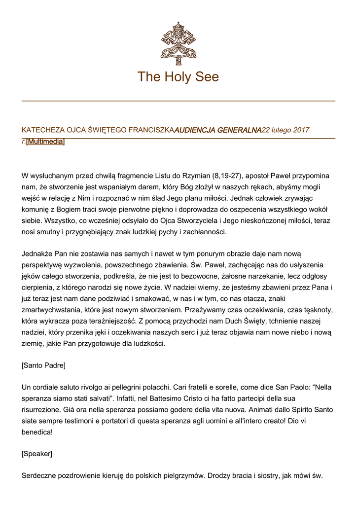 The Holy See KATECHEZA OJCA ŚWIĘTEGO FRANCISZKAAUDIENCJA GENERALNA22 lutego 2017 r.[Multimedia] W wysłuchanym przed chwilą fragmencie Listu do Rzymian (8,19-27), apostoł Paweł przypomina nam, że stworzenie jest wspaniałym darem, który Bóg złożył w naszych rękach, abyśmy mogli wejść w relację z Nim i rozpoznać w nim ślad Jego planu miłości. Jednak człowiek zrywając komunię z Bogiem traci swoje pierwotne piękno i doprowadza do oszpecenia wszystkiego wokół siebie. Wszystko, co wcześniej odsyłało do Ojca Stworzyciela i Jego nieskończonej miłości, teraz nosi smutny i przygnębiający znak ludzkiej pychy i zachłanności. Jednakże Pan nie zostawia nas samych i nawet w tym ponurym obrazie daje nam nową perspektywę wyzwolenia, powszechnego zbawienia. Św. Paweł, zachęcając nas do usłyszenia jęków całego stworzenia, podkreśla, że nie jest to bezowocne, żałosne narzekanie, lecz odgłosy cierpienia, z którego narodzi się nowe życie. W nadziei wiemy, że jesteśmy zbawieni przez Pana i już teraz jest nam dane podziwiać i smakować, w nas i w tym, co nas otacza, znaki zmartwychwstania, które jest nowym stworzeniem. Przeżywamy czas oczekiwania, czas tęsknoty, która wykracza poza teraźniejszość. Z pomocą przychodzi nam Duch Święty, tchnienie naszej nadziei, który przenika jęki i oczekiwania naszych serc i już teraz objawia nam nowe niebo i nową ziemię, jakie Pan przygotowuje dla ludzkości. [Santo Padre] Un cordiale saluto rivolgo ai pellegrini polacchi. Cari fratelli e sorelle, come dice San Paolo: “Nella speranza siamo stati salvati”. Infatti, nel Battesimo Cristo ci ha fatto partecipi della sua risurrezione. Già ora nella speranza possiamo godere della vita nuova. Animati dallo Spirito Santo siate sempre testimoni e portatori di questa speranza agli uomini e all’intero creato! Dio vi benedica! [Speaker] Serdeczne pozdrowienie kieruję do polskich pielgrzymów. Drodzy bracia i siostry, jak mówi św. 2 Paweł: „W nadziei już jesteśmy zbawieni”. Rzeczywiście przez chrzest Chrystus uczynił nas uczestnikami swego zmartwychwstania. Już teraz w nadziei możemy cieszyć się nowym życiem. Ożywiani Duchem Świętym bądźcie zawsze świadkami i nosicielami tej nadziei wobec ludzi i wobec całego stworzenia! Niech Bóg wam błogosławi! © Copyright - Libreria Editrice Vaticana