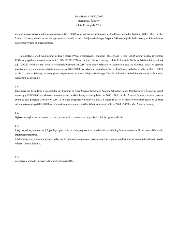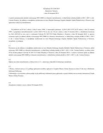 Zarządzenie Nr G/305/2015 Burmistrza Ścinawy z dnia 30 listopada 2015r. w sprawie przeznaczenia udziału wynoszącego 8991/10000 we własności nieruchomości, w skład której wchodzą działki nr 204/1 i 205/1 w obr. 2 miasta Ścinawy, do oddania w nieodpłatne użytkowanie na rzecz Miejsko-Gminnego Zespołu Zakładów Opieki Podstawowej w Ścinawie oraz ogłoszenia wykazu tej nieruchomości. Na podstawie art.30 ust.1 ustawy z dnia 8 marca 1990r. o samorządzie gminnym (t.j.Dz.U.2015.1515) art.35 ustawy z dnia 21 sierpnia 1997r. o gospodarce nieruchomościami ( t.j.Dz.U.2015.1774 ze zm.) art. 54 ust.1 ustawy z dnia 15 kwietnia 2011r. o działalności leczniczej (t.j. Dz.U.2015.618 ze zm.) oraz w wykonaniu Uchwały Nr XIV/72/15 Rady Miejskiej w Ścinawie z dnia 26 listopada 2015r. w sprawie wyrażenia zgody na oddanie udziału wynoszącego 8991/10000 we własności nieruchomości, w skład której wchodzą działki nr 204/1 i 205/1 w obr. 2 miasta Ścinawy, w nieodpłatne użytkowanie na rzecz Miejsko-Gminnego Zespołu Zakładów Opieki Podstawowej w Ścinawie, zarządzam, co następuje: § 1. Przeznacza się do oddania w nieodpłatne użytkowanie na rzecz Miejsko-Gminnego Zespołu Zakładów Opieki Podstawowej w Ścinawie, udział wynoszący 8991/10000 we własności nieruchomości, w skład której wchodzą działki nr 204/1 i 205/1 w obr. 2 miasta Ścinawy, na dalszy okres 10 lat od dnia podjęcia Uchwały Nr XIV/72/15 Rady Miejskiej w Ścinawie z dnia 26 listopada 2015r. w sprawie wyrażenia zgody na oddanie udziału wynoszącego 8991/10000 we własności nieruchomości, w skład której wchodzą działki nr 204/1 i 205/1 w obr. 2 miasta Ścinawy. § 2. Ogłasza się wykaz nieruchomości, o której mowa w § 1., stanowiący załącznik do niniejszego zarządzenia. § 3. 1.Wykaz, o którym mowa w § 2, podlega ogłoszeniu na tablicy ogłoszeń w Urzędzie Miasta i Gminy Ścinawa na okres 21 dni oraz w Biuletynie Informacji Publicznej. 2.Informację o wywieszeniu wykazu podaje się do publicznej wiadomości przez ogłoszenie w prasie lokalnej oraz na stronie internetowej Urzędu Miasta i Gminy Ścinawa. § 4. Zarządzenie wchodzi w życie z dniem 30 listopada 2015r. Załącznik do Zarządzenia Nr G/305/2015 Burmistrza Ścinawy z dnia 30 listopada 2015r. w sprawie przeznaczenia udziału wynoszącego 8991/10000 we własności nieruchomości, w skład której wchodzą działki nr 204/1 i 205/1 w obr. 2 miasta Ścinawy, do oddania w nieodpłatne użytkowanie na rzecz Miejsko-Gminnego Zespołu Zakładów Opieki Podstawowej w Ścinawie oraz ogłoszenia wykazu tej nieruchomości. Wykaz udziału wynoszącego 8991/10000 we własności nieruchomości, w skład której wchodzą działki nr 204/1 i 205/1 w obr. 2 miasta Ścinawy, przeznaczonego do oddania w nieodpłatne użytkowanie na rzecz Miejsko-Gminnego Zespołu Zakładów Opieki Podstawowej w Ścinawie: Oznaczenie udziału 8991/10000 w nieruchomości KW Ewidencja gruntów 2. 3. Lp. 1. Opis, położenie i wartość udziału we własności nieruchomości Pow. w m2 4. 5. 6. 1. LE1U/00035176/2 204/1 205/1 708 3827 Obr.2 miasta Ścinawy przy ulicy Jagiełły 2 w Ścinawie. Na gruncie posadowione są następujące budynki i budowle: budynek przychodni o pow. użytkowej 925, 96 m2 wraz z kotłownią o pow. użytkowej 108 m2.- 1021929,66 zł przyłącze wodno-kanalizacyjne o długości 412 m-12867,75 zł sieć centralnego ogrzewania o długości 90 m-10301,41 zł sieć elektryczna 20 kv (760 m) wraz oświetleniem terenu (7 punktów świetlnych)- 20628,04 zł Parking wraz z chodnikami 783,10m2 – 424775,85 zł Ogrodzenie panelowe, mocowane do słupków osadzonych na fundamentach wraz z furtką o długości 285,37 m wraz z dwiema bramami panelowymi – 78741,32 zł osłona śmietnika o konstrukcji drewnianej – 6891,10 zł grunt-42033, 88 zł Łącznie wartość nieruchomości wynosi 1.618.169,01 zł Grunt uzbrojony jest w energię elektryczną, sieć wodociągową, sieć kanalizacyjną, sieć telefoniczną. 1.Przeznaczenie nieruchomości i sposób jej zagospodarowania-zgodnie z miejscowym planem zagospodarowania przestrzennego miasta Ścinawy uchwalonym Uchwałą nr XLIII/273/2005 Rady Miejskiej w Ścinawie z dnia 30 czerwca 2005r., opublikowanym w Dzienniku Urzędowym Województwa Dolnośląskiego Nr 156 z dnia 18 sierpnia 2005r. pod poz.3023, nieruchomość położona jest na terenach: Działka nr 204/1 obręb 2 miasta Ścinawy zlokalizowana jest na terenie oznaczonym na rysunku planu (załącznik nr 1 uchwały) symbolem UZ/1 w strefie „K” ochrony krajobrazu. Działka leży na terenie określonym granicami powodzi z 1997r. oraz strefą zagrożenia powodziowego. Działka nr 205/1 obręb 2 m. Ścinawa zlokalizowana jest na terenie oznaczonym na rysunku planu (załącznik nr 1 uchwały) symbolem UZ/1, KDL w strefie „K” ochrony krajobrazu, częściowo w strefie „B” ochrony konserwatorskiej, „OW” obserwacji archeologicznej. Działka leży częściowo na terenie określonym granicami powodzi z 1997r. oraz strefą zagrożenia powodziowego. Zgodnie tekstem planu działki przeznaczone są pod: 7. UZ/1 – przeznaczenie podstawowe – tereny usług zdrowia i opieki społecznej na wydzielonych działkach, ustalone jako cele publiczne, 1) dopuszczalne kierunki przekształceń: a) modernizacja, adaptacje i przebudowy istniejących obiektów z zachowaniem dominującej funkcji usługowej, z zastrzeżeniem zgodności z obowiązującymi przepisami szczególnymi, b) zmiany rodzaju realizowanych usług na inne usługi publiczne, z zastrzeżeniem zgodności nowych funkcji z wymogami obowiązujących przepisów szczególnych, c) dopuszcza się możliwość adaptacji części obiektów na cele mieszkaniowe dla pracowników placówki, z zastrzeżeniem zgodności z obowiązującymi przepisami szczególnymi. § 6. Zasady rozwoju i funkcjonowania układu komunikacyjnego: 1. 4) a) b) c) d) e) f) g) h) i) Ustala się linie rozgraniczające przestrzeń pub