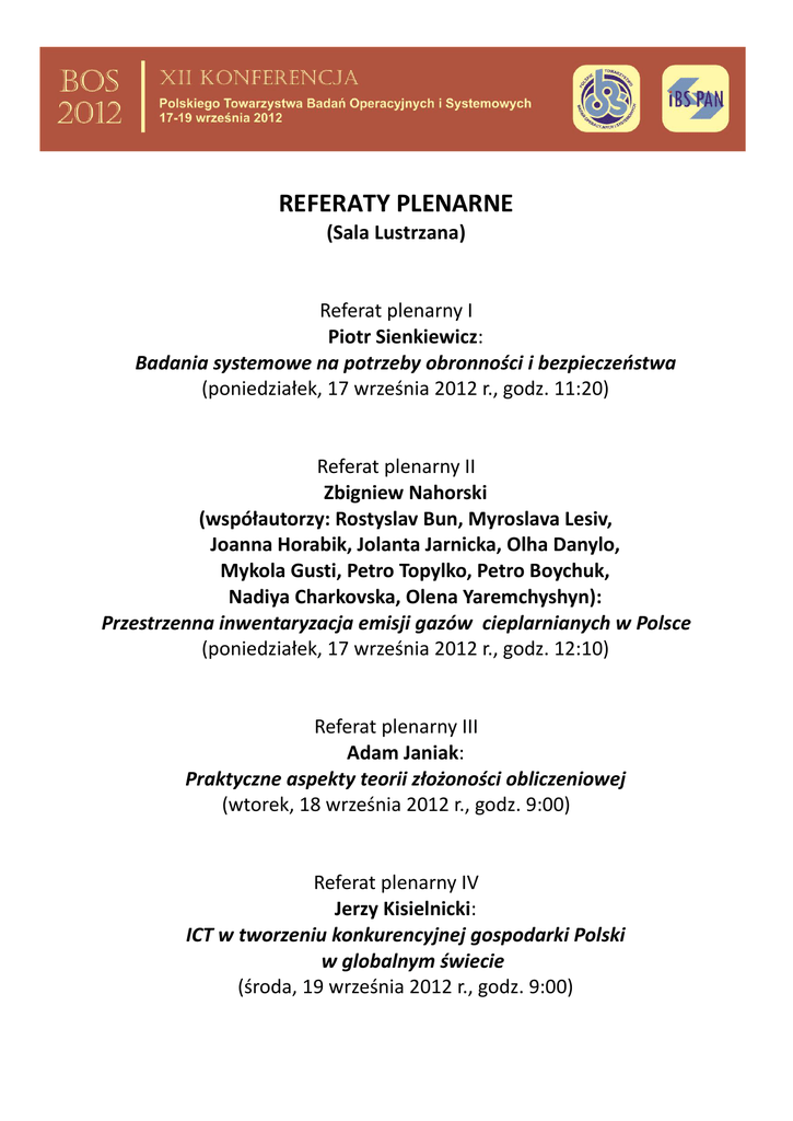 REFERATY PLENARNE (Sala Lustrzana) Referat plenarny I Piotr Sienkiewicz: Badania systemowe na potrzeby obronności i bezpieczeństwa (poniedziałek, 17 września 2012 r., godz. 11:20) Referat plenarny II Zbigniew Nahorski (współautorzy: Rostyslav Bun, Myroslava Lesiv, Joanna Horabik, Jolanta Jarnicka, Olha Danylo, Mykola Gusti, Petro Topylko, Petro Boychuk, Nadiya Charkovska, Olena Yaremchyshyn): Przestrzenna inwentaryzacja emisji gazów cieplarnianych w Polsce (poniedziałek, 17 września 2012 r., godz. 12:10) Referat plenarny III Adam Janiak: Praktyczne aspekty teorii złożoności obliczeniowej (wtorek, 18 września 2012 r., godz. 9:00) Referat plenarny IV Jerzy Kisielnicki: ICT w tworzeniu konkurencyjnej gospodarki Polski w globalnym świecie (środa, 19 września 2012 r., godz. 9:00) Sesja I: Środowisko 1. Poniedziałek, 17 września 2012 r., godz. 14:15, Sala Marii Skłodowskiej-Curie Piotr Holnicki i Zbigniew Nahorski: Air quality modeling in Warsaw metropolitan area. P. Kopka, M. Borysiewicz i A. Wawrzyńczak: Application of Bayesian inference in stochastic event reconstruction in the case of localization of the atmospheric contamination source Jacek Malinowski: Modelowanie zmienności odnawialnych źródeł energii za pomocą procesów semi-markowskich w kontekście wytwarzania energii elektrycznej Jarosław Stańczak: Agent-based evolutionary method of simulation of the CO2 emission permits market Andrzej Kałuszko: Metoda efektywnego rozdziału środków na redukcję emisji CO2 dla grupy elektrowni Jolanta Joszczuk-Januszewska: Aspekty ochrony środowiska naturalnego w chmurze obliczeniowej Sesja IA. Środowisko 2. Wtorek, 18 września 2012 r., godz. 10:30, Sala Marii Skłodowskiej-Curie Grażyna Petriczek, Lucyna Bogdan i Jan Studziński: Algorytmy modelowania komputerowego miejskich sieci kanalizacyjnych Izabela Rojek i Jan Studziński: Neural networks in failure location for water-supply networks Agnieszka Służalec: Projektowanie sieci kanalizacyjnych Aleksy Barski: Zastosowanie wskaźnika MACD w analizie przepływu oczyszczalni ścieków M. Stachura, B. Fajdek i Jan Studziński: Zarządzanie i sterowanie siecią wodociągową w oparciu o modele matematyczne Sesja II. Kapitał ludzki i intelektualny a zarządzanie. Poniedziałek, 17 września 2012 r., godz. 14:15, Sala Lustrzana Stanisław Walukiewicz: Market triple Aneta A. Wiktorzak i Stanisław Walukiewicz: Measuring human capital in education Przemysław Dominiak i Jacek Mercik: Macierz porównawcza metod pomiaru kapitału intelektualnego Grażyna Grabowska: Znaczenie bliskości emocjonalnej w tworzeniu zespołów projektowych Julia Siderska: Zastosowanie wirtualnej taśmy produkcyjnej w tworzeniu oprogramowania Sesja III. Optymalizacja 1. Poniedziałek, 17 września, godz. 14:15, Sala Stanisława Staszica Jerzy Józefczyk i Marcin Siepak: Regret based approaches for problems with interval uncertainty Mariusz Makuchowski: Perturbation algorithm for minmax regret minimum spanning tree problem Ignacy Kaliszewski i Janusz Miroforidis: Primal-dual evolutionary multiobjective optimization Lech Kruś, Jan Skorupiński i Eugeniusz Toczyłowski: Analysis of incentive compatible decisions in a multicriteria auction Maciej Wolny: About multi-criteria decision support with a game theoretical approach Hanna Borzęcka: Wielokryterialne podejmowanie decyzji z wykorzystaniem rozmytej relacji preferencji Sesja IIIA. Optymalizacja 2. Wtorek, 18 września 2012 r., godz. 10:30, Sala Stanisława Staszica Marek Antosiewicz, Grzegorz Koloch i Bogumił Kamiński: Choice of optimal metaheuristic algorithm Barbara Mażbic-Kulma, Jan W. Owsiński , Jarosław Stańczak, Krzysztof Sęp: Kernel and shell structure as a method of optimizing the graph of transportation connections Bogusz Przybysławski: Approximation algorithms for a minmax resource allocation problem Andrzej Łodziński: Metoda wyboru decyzji satysfakcjonującej w procesie negocjacji Katarzyna Jakowska-Suwalska: Multi-criteria model of order size Joanna Kołodziejczyk i Łukasz Przybyłek: Automatic dietary menu planning based on evolutionary algorithm Sesja IV. INFORMS: „Wspólne Europejskie Niebo” Wtorek, 18 września 2012 r., godz. 10:30, Sala Lustrzana: Sesja z udziałem przedstawicieli Departamentu Lotnictwa Ministerstwa Transportu, Budownictwa i Gospodarki Morskiej, Urzędu Lotnictwa Cywilnego oraz Polskiej Agencji Żeglugi Powietrznej. Sesja V. Modelowanie ekonomiczne i finansowe. Wtorek, 18 września 2012 r., godz. 10:30, Sala Okrągłego Stołu Piotr Nowak i Maciej Romaniuk: Catastrophe bond pricing for the one- and two-factor Vasicek interest rate model Jan Gadomski i Piotr Nowak: Deterministic properties of superposition of the distributed lag models Przemysław Szufel, Bogumil Kamiński i Piotr Wojownik: Controllling tree representation of parametr space in multi-agent simulation models Michał Szymczyk i Bogumił Kamiński: Dynamics of innovation diffusion with two step decision process Jacek Mercik i Anna Lamek: Zastosowanie rozwiązania konkurencyjno-kooperacyjnego dla asymetrycznego bilateralnego monopolu Mateusz Zawisza i Bogumil Kamiński: Price patterns in oligopoly with switching costand uncertain demand Sesja VI. Sesja doktorantów IBS PAN. Wtorek, 18 września 2012 r., godz. 15:45, Sala Lustrzana Sesja VII. Decyzje grupowe i głosowania. Wtorek, 18 września 2012 r., godz. 15:45, Sala Stanisława Staszica Hanna Bury i Dariusz Wagner : Synteza ocen ekspertów na podstawie macierzy marginesów przewag Leszek Klukowski: Estimators of the relations of:equivalence, tolerance and preference on the basis of pairwise comparisons with random errors Honorata Sosnowska i Krzysztof Przybyszewski: Strategie wyboru w głosowaniu aprobującym. Podejście eksperymentalne. Mariusz Mazurkiewicz, Jacek Mercik i Frantisek Turnovec: Transfer preferencji elektoratu w wyborach parlamentarnych 2005, 2007 w Polsce Helena Lindskog,Staffan Brege, Per-Olof Brehmer : Conflicts in 