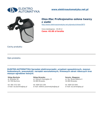 www.elektroautomatyka.net.pl Oleo-Mac Profesjonalna osłona twarzy z siatki http://www.elektroautomatyka.net.pl/product/show/2873 Cena katalogowa : 45.00 zł Cena: 45.00 zł brutto Cechy produktu Opis produktu ELEKTRO-AUTOMATYKA Sprzedaż elektronarzędzi, urządzeń spawalniczych, maszyn budowlanych, pneumatyki, narzędzi warsztatowych, firmowych ubrań roboczych oraz maszyn ogrodowo leśnych. Sklep Bochnia ul. Brzeska 50 32-700 Bochnia Sklep Brzesko ul. Szarych Szeregów 23 32-800 Brzesko Serwis, Magazyn ul. Św. Brata Alberta 4 32-800 Brzesko tel. 691 572 333 e-mail: [email protected] tel. 609 523 230 e-mail: [email protected] tel. 609 523 645 e-mail: [email protected]