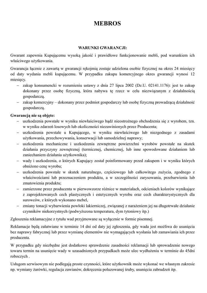 MEBROS Strona WARUNKI GWARANCJI: Gwarant zapewnia Kupującemu wysoką jakość i prawidłowe funkcjonowanie mebli, pod warunkiem ich właściwego użytkowania. Gwarancja łącznie z zawartą w gwarancji rękojmią zostaje udzielona osobie fizycznej na okres 24 miesięcy od daty wydania mebli kupującemu. W przypadku zakupu komercyjnego okres gwarancji wynosi 12 miesięcy. zakup konsumencki w rozumieniu ustawy z dnia 27 lipca 2002 (Dz.U. 02141.1176): jest to zakup dokonany przez osobę fizyczną, która nabywa tę rzecz w celu niezwiązanym z działalnością gospodarczą. zakup komercyjny – dokonany przez podmiot gospodarczy lub osobę fizyczną prowadzącą działalność gospodarczą. Gwarancją nie są objęte: uszkodzenia powstałe w wyniku niewłaściwego bądź nieostrożnego obchodzenia się z wyrobem, tzn. w wyniku zdarzeń losowych lub okoliczności niezawinionych przez Producenta; uszkodzenia powstałe u Kupującego, w wyniku niewłaściwego lub niezgodnego z zasadami użytkowania, przechowywania, konserwacji lub samodzielnej naprawy; uszkodzenia mechaniczne i uszkodzenia zewnętrzne powierzchni wyrobów powstałe na skutek działania przyczyny zewnętrznej (termicznej, chemicznej, lub inne spowodowane działaniem lub zaniechaniem działania użytkownika); wady i uszkodzenia, o których Kupujący został poinformowany przed zakupem i w wyniku których obniżono cenę wyrobu; uszkodzenia powstałe w skutek naturalnego, częściowego lub całkowitego zużycia, zgodnego z właściwościami lub przeznaczeniem produktu, a w szczególności zarysowania, przebarwienia lub zmatowienia produktu; zamierzone przez producenta w pierwowzorze różnice w materiałach, odcieniach kolorów wynikające z zaprojektowanych cech plastycznych i estetycznych wyrobu oraz cech charakterystycznych dla surowców, z których wykonano mebel, zmiany tonacji wybarwienia powłoki lakierniczej, związanej z narażeniem jej na długotrwałe działanie czynników niekorzystnych (podwyższona temperatura, dym tytoniowy itp.) Zgłoszenia reklamacyjne z tytułu wad przyjmowane są wyłącznie w formie pisemnej. Reklamacje będą załatwiane w terminie 14 dni od daty jej zgłoszenia, gdy wada jest możliwa do usunięcia bez naprawy fabrycznej lub przez wymianę elementów nie wymagających wysłania lub zamawiania ich przez producenta. W przypadku gdy niezbędne jest dodatkowe sprawdzenie zasadności reklamacji lub sprowadzenie nowego towaru termin na usunięcie wady w uzasadnionych przypadkach może ulec wydłużeniu w terminie do 45dni roboczych . Usługom serwisowym nie podlegają proste czynności, które użytkownik może wykonać we własnym zakresie np. wymiany żarówki, regulacja zawiasów, dokręcenia poluzowanej śruby, usunięcia zabrudzeń itp. Gwarant nie ponosi odpowiedzialności z tytułu nie zapoznania się klienta z niniejszymi warunkami gwarancji, użytkowania i konserwacji gdyż dokument ten jest ogólnodostępny zarówno w punkcie sprzedaży jak i na stronie internetowej producenta. WARUNKI UŻYTKOWANIA I KONSERWACJI: Blaty kuchenne z laminatów HPL. Blaty kuchenny jest najbardziej eksploatowaną częścią kuchni i dlatego materiał z jakiego jest wykonany (laminat HPL) charakteryzuje się podwyższoną odpornością na uszkodzenia mechaniczne, podwyższoną temperaturę, wilgoć i promieniowanie UV. Pomimo tego blaty nie są niezniszczalne. Zbyt długi kontakt z wodą, bardzo wysoką temperaturą (np. garnek postawiony prosto z ognia) oraz niektórymi środkami chemicznymi może spowodować nieodwracalne uszkodzenia, które w takim wypadku nie są objęte gwarancją. W szczególności należy unikać: narażania blatu na długotrwały kontakt z wodą, szczególnie w miejscach łączeń, przy zlewozmywaku i na krawędziach blatu. stawiania gorących garnków, patelni i naczyń na powierzchni blatu bez użycia właściwych podkładek. cięcia, szlifowania i uderzania zarówno tępymi jak i ostrymi narzędziami bezpośrednio na powierzchni blatu. otwierania zmywarki w trakcie trwania oraz tuż po zakończeniu programu zmywania (zmywarka powinna być opróżniana minimum 15 minut po zakończeniu programu), gorąca para wodna może nieodwracalnie zniszczyć blat (puchnięcie blatu, odchodzenie krawędzi). czyszczenia blatu środkami agresywnymi oraz zawierającymi elementy ścierne. Czyszczenie i konserwacja większość typowych zabrudzeń może być z powodzeniem usunięta suchą lub wilgotną szmatką. Można stosować także płyn do mycia naczyń, płyn do mycia szyb, nie rysujące mleczka do czyszczenia. Zawsze po użyciu środków chemicznych należy powierzchnię blatu zmyć czystą wodą. Fronty meblowe melaminowane. Jest to podstawowy materiał do produkcji mebli kuchennych charakteryzujący się wyjątkowo bogatą ofertą kolorystyczną. Fronty me laminowane wykazują dużą odporność na promieniowanie UV co zapewnia wysoką trwałość kolorystyczną w długim odstępie czasu, oraz umiarkowaną odporność na uszkodzenia mechaniczne. Przystosowane one do używania w pomieszczeniach zamkniętych, wentylowanych o normalnej temperaturze i wilgotności powietrza. Niedopuszczalne jest używanie ich na zewnątrz. narażania frontów na długotrwały kontakt z wilgocią oraz gorącą parą wodną. niedopuszczalne jest zanurzanie elementów MDF/PVC w wodzie. niedopuszczalny jest kontakt powierzchni foliowanych przedmiotami ostrymi lub szorstkimi, rozpuszczalnikami, substancjami barwiącymi. niedopuszczalne jest używanie rozpuszczalników, środków szorujących o właściwościach ściernych (proszków, kremów), nie rozcieńczonych lub skoncentrowanych środków czyszczących, w szczególności barwnych. nie należy pozostawiać plam do zaschnięcia, gdyż mogą one na stałe przebarwić powierzchnię. nie należy stosować szczotek o twardym włosiu, a także mocnych środków szorujących i wybielających nie należy gotować bez włączonego wyciągu w okapie kuchennym. Czyszczenie i 