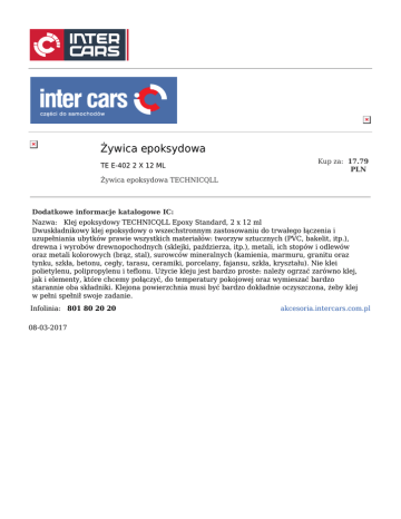 Żywica epoksydowa TE E-402 2 X 12 ML Kup za: 17.79 PLN Żywica epoksydowa TECHNICQLL Dodatkowe informacje katalogowe IC: Nazwa: Klej epoksydowy TECHNICQLL Epoxy Standard, 2 x 12 ml Dwuskładnikowy klej epoksydowy o wszechstronnym zastosowaniu do trwałego łączenia i uzupełniania ubytków prawie wszystkich materiałów: tworzyw sztucznych (PVC, bakelit, itp.), drewna i wyrobów drewnopochodnych (sklejki, paździerza, itp.), metali, ich stopów i odlewów oraz metali kolorowych (brąz, stal), surowców mineralnych (kamienia, marmuru, granitu oraz tynku, szkła, betonu, cegły, tarasu, ceramiki, porcelany, fajansu, szkła, kryształu). Nie klei polietylenu, polipropylenu i teflonu. Użycie kleju jest bardzo proste: należy ogrzać zarówno klej, jak i elementy, które chcemy połączyć, do temperatury pokojowej oraz wymieszać bardzo starannie oba składniki. Klejona powierzchnia musi być bardzo dokładnie oczyszczona, żeby klej w pełni spełnił swoje zadanie. Infolinia: 801 80 20 20 08-03-2017 akcesoria.intercars.com.pl