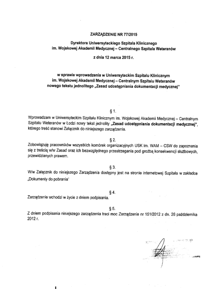 spadkobiercy w zakresie prowadzonego postępowania przed wojewódzką komisją do spraw orzekania o zdarzeniach medycznych (ich upoważnienie ma źródło ustawowe i nie jest uzależnione od upoważnienia udzielonego za życia przez pacjenta); osoby wykonujące czynności kontrolne na podstawie art. 39 ust. 1 ustawy z dnia 28 kwietnia 2011 r. o systemie informacji w ochronie zdrowia (Dz. U. z 2011 r., Nr 113, poz. 657 z późn. zm.), w zakresie niezbędnym do ich przeprowadzenia; szkole wyższej lub jednostce badawczo-rozwojowej do wykorzystania dla celów naukowych, bez ujawniania nazwiska i innych danych umożliwiających identyfikację osoby, której dokumentacja dotyczy. Podmiotem upoważnionym do wglądu w dokumentację medyczną po śmierci pacjenta jest osoba upoważniona przez pacjenta za życia do uzyskiwania wglądu w dokumentację w przypadku jego śmierci. Pacjent może udzielić upoważnienia konkretnej osobie do odbioru kserokopii jego dokumentacji medycznej. Udostępniając dokumentację na podstawie pisemnego upoważnienia należy zachować dla celów dowodowych w dokumentacji oświadczenie pacjenta o udzieleniu takiego upoważnienia. Dokumentacja medyczna jest udostępniana na wniosek uprawnionego podmiotu (wzór w załączeniu), w następujący sposób: 1) do wglądu w siedzibie podmiotu udzielającego świadczeń zdrowotnych; 2) poprzez sporządzenie jej wyciągów, odpisów lub kopii; 3) poprzez wydanie oryginału za pokwitowaniem odbioru i z zastrzeżeniem zwrotu po wykorzystaniu, jeśli uprawniony organ lub podmiot żąda udostępnienia oryginałów tej dokumentacji. Wyżej wskazane sposoby udostępniania dokumentacji medycznej dotyczą również przypadku udostępnienia dokumentacji po śmierci pacjenta osobie przez niego upoważnionej za życia. W przypadku udostępnienia dokumentacji poprzez wydanie oryginału za pokwitowaniem odbioru i z zastrzeżeniem zwrotu po wykorzystaniu, jeżeli uprawniony organ lub podmiot żąda udostępnienia oryginałów tej dokumentacji, należy pozostawić kopię lub pełny odpis wydanej dokumentacji. Podmiot udzielający świadczeń zdrowotnych może pobierać opłatę za udostępnienie dokumentacji medycznej prowadzonej w przedsiębiorstwie podmiotu leczniczego poprzez sporządzenie jej wyciągów, odpisów lub kopii, zgodnie z aktualnym cennikiem określonym w zarządzeniu Dyrektora. Osoba odbierająca wniosek od podmiotu uprawnionego do udostępnienia jej dokumentacji medycznej obowiązana jest poinformować ten podmiot o wysokości powyższych opłat. Udostępnienie dokumentacji do wglądu w siedzibie podmiotu udzielającego świadczeń zdrowotnych lub poprzez wydanie oryginału na żądanie uprawnionego organu lub podmiotu (z zastrzeżeniem zwrotu i za pokwitowaniem odbioru) jest nieodpłatne. Załącznik do Zasad udostępniania dokumentacji medycznej …………………………………………….. (miejscowość, data) …………………………………………….. (imię i nazwisko) …………………………………………….. (adres zamieszkania) …………………………………………….. (PESEL) …………………………………………….. (telefon) Dyrektor Uniwersyteckiego Szpitala Klinicznego im. Wojskowej Akademii Medycznej Uniwersytetu Medycznego w Łodzi - Centralnego Szpitala Weteranów w Łodzi Wniosek o udostępnienie dokumentacji medycznej Wnioskuję o udostępnienie dokumentacji medycznej pacjenta ……………………………………………………………………………………………………………………………………………………………. (imię i nazwisko, PESEL) z leczenia w …………………………………………………………………………………………………………………………………………. (nazwa kliniki, oddziału, poradni) w okresie …………………………………………………………………………………………………………………………………………….. (data pobytu lub okres, z jakiego dokumentacja ma być udostępniana) w formie …………………………………………………………………………………………………………………………………………….. (m. in. wgląd, kserokopia)* Oświadczam, iż ze względu na zachowanie poufności i ochrony danych osobowych akceptuję tryb udostępniania dokumentacji medycznej oraz zobowiązuję się do pokrycia w całości kosztu wykonania powyższej dokumentacji stosownie do ustawy z dnia 15 kwietnia 2011 r. o działalności leczniczej (Dz. U. Nr 112 poz. 654 z późn. zm.) oraz ustawy z dnia 6 listopada 2008 r. o prawach pacjenta i Rzeczniku Praw Pacjenta (Dz. U. z 2012 r. poz. 159 z późn. zm.), zgodnie z cennikiem udostępniania dokumentacji medycznej USK im. WAM. ……………………………………………………. (podpis Wnioskodawcy) * W przypadku żądania wydania dokumentacji medycznej w postaci kserokopii, należy jednoznacznie określić jej rodzaj – kserokopia czy kserokopia uwierzytelniona Wydano: ..……………………….……………………………… (data wydania dokumentacji) 1. Tożsamość osoby odbierającej dokumentację medyczną stwierdzono na podstawie ………………………………………………………………………………………………………………………………………….…………… (nazwa dokumentu tożsamości i jego numer) 2. Pobrano opłatę w wysokości …………………………………………… za …………………………. stron dokumentacji medycznej. Potwierdzam odbiór dokumentacji medycznej. ………………………………..……………………….. (data i czytelny podpis osoby odbierającej)