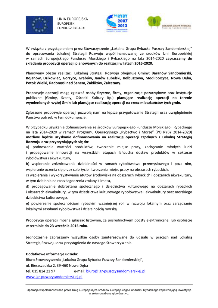 UNIA EUROPEJSKA EUROPEJSKI FUNDUSZ RYBACKI W związku z przystąpieniem przez Stowarzyszenie „Lokalna Grupa Rybacka Puszczy Sandomierskiej” do opracowania Lokalnej Strategii Rozwoju współfinansowanej ze środków Unii Europejskiej w ramach Europejskiego Funduszu Morskiego i Rybackiego na lata 2014-2020 zapraszamy do składania propozycji operacji planowanych do realizacji w latach 2016-2020. Planowany obszar realizacji Lokalnej Strategii Rozwoju obejmuje Gminy: Baranów Sandomierski, Bojanów, Dzikowiec, Gorzyce, Grębów, Janów Lubelski, Kolbuszowa, Modliborzyce, Nowa Dęba, Potok Wielki, Radomyśl nad Sanem, Zaklików, Zaleszany. Propozycje operacji mogą zgłaszać osoby fizyczne, firmy, organizacje pozarządowe oraz instytucje publiczne (Gminy, Szkoły, Ośrodki Kultury itp.) planujące realizację operacji na terenie wymienionych wyżej Gmin lub planujące realizację operacji na rzecz mieszkańców tych gmin. Zgłoszone propozycje operacji pozwolą nam na lepsze przygotowanie Strategii oraz uwzględnienie Państwa potrzeb w tym dokumencie. W przypadku uzyskania dofinansowania ze środków Europejskiego Funduszu Morskiego i Rybackiego na lata 2014-2020 w ramach Programu Operacyjnego „Rybactwo i Morze” (PO RYBY 2014-2020) możliwe będzie uzyskanie dofinansowania na realizację operacji zgodnych z Lokalną Strategią Rozwoju oraz przyczyniających się do: a) podnoszenia wartości produktów, tworzenie miejsc pracy, zachęcanie młodych ludzi i propagowanie innowacji na wszystkich etapach łańcucha dostaw produktów w sektorze rybołówstwa i akwakultury, b) wspieranie zróżnicowania działalności w ramach rybołówstwa przemysłowego i poza nim, wspieranie uczenia się przez całe życie i tworzenia miejsc pracy na obszarach rybackich, c) wspieranie i wykorzystywanie atutów środowiska na obszarach rybackich i obszarach akwakultury, w tym działania na rzecz łagodzenia zmiany klimatu, d) propagowanie dobrostanu społecznego i dziedzictwa kulturowego na obszarach rybackich i obszarach akwakultury, w tym dziedzictwa kulturowego rybołówstwa i akwakultury oraz morskiego dziedzictwa kulturowego, e) powierzenie społecznościom rybackim ważniejszej roli w rozwoju lokalnym oraz zarządzaniu lokalnymi zasobami rybołówstwa i działalnością morską. Propozycje operacji można zgłaszać listownie, za pośrednictwem poczty elektronicznej lub osobiście w terminie do 23 września 2015 roku. Jednocześnie zapraszamy wszystkie osoby zainteresowane do udziału w pracach nad Lokalną Strategią Rozwoju oraz przystąpienia do naszego Stowarzyszenia. Dodatkowe informacje udziela: Biuro Stowarzyszenia „Lokalna Grupa Rybacka Puszczy Sandomierskiej”, ul. Bieszczadzka 2, 39-460 Nowa Dęba tel. 015 814 21 97 e-mail: [email protected] www.lgr-puszczysandomierskiej.pl Operacja współfinansowana przez Unię Europejską ze środków Europejskiego Funduszu Rybackiego zapewniającą inwestycje w zrównoważone rybołówstwo.