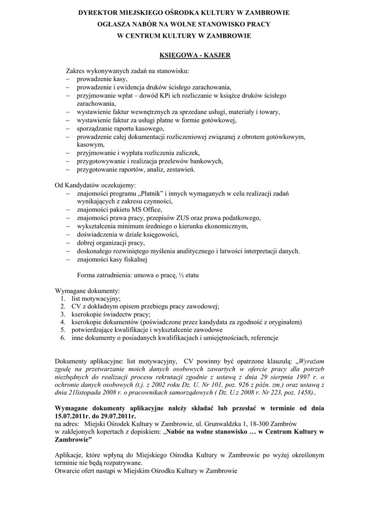 DYREKTOR MIEJSKIEGO OŚRODKA KULTURY W ZAMBROWIE OGŁASZA NABÓR NA WOLNE STANOWISKO PRACY W CENTRUM KULTURY W ZAMBROWIE KSIĘGOWA - KASJER Zakres wykonywanych zadań na stanowisku: − prowadzenie kasy, − prowadzenie i ewidencja druków ścisłego zarachowania, − przyjmowanie wpłat – dowód KPi ich rozliczanie w książce druków ścisłego zarachowania, − wystawienie faktur wewnętrznych za sprzedane usługi, materiały i towary, − wystawienie faktur za usługi płatne w formie gotówkowej, − sporządzanie raportu kasowego, − prowadzenie całej dokumentacji rozliczeniowej związanej z obrotem gotówkowym, kasowym, − przyjmowanie i wypłata rozliczenia zaliczek, − przygotowywanie i realizacja przelewów bankowych, − przygotowanie raportów, analiz, zestawień. Od Kandydatów oczekujemy: − znajomości programu „Płatnik” i innych wymaganych w celu realizacji zadań wynikających z zakresu czynności, − znajomości pakietu MS Office, − znajomości prawa pracy, przepisów ZUS oraz prawa podatkowego, − wykształcenia minimum średniego o kierunku ekonomicznym, − doświadczenia w dziale księgowości, − dobrej organizacji pracy, − doskonałego rozwiniętego myślenia analitycznego i łatwości interpretacji danych. − znajomości kasy fiskalnej Forma zatrudnienia: umowa o pracę, ½ etatu Wymagane dokumenty: 1. list motywacyjny; 2. CV z dokładnym opisem przebiegu pracy zawodowej; 3. kserokopie świadectw pracy; 4. kserokopie dokumentów (poświadczone przez kandydata za zgodność z oryginałem) 5. potwierdzające kwalifikacje i wykształcenie zawodowe 6. inne dokumenty o posiadanych kwalifikacjach i umiejętnościach, referencje Dokumenty aplikacyjne: list motywacyjny, CV powinny być opatrzone klauzulą: „Wyrażam zgodę na przetwarzanie moich danych osobowych zawartych w ofercie pracy dla potrzeb niezbędnych do realizacji procesu rekrutacji zgodnie z ustawą z dnia 29 sierpnia 1997 r. o ochronie danych osobowych (t.j. z 2002 roku Dz. U. Nr 101, poz. 926 z późn. zm.) oraz ustawą z dnia 21listopada 2008 r. o pracownikach samorządowych ( Dz. U.z 2008 r. Nr 223, poz. 1458).. Wymagane dokumenty aplikacyjne należy składać lub przesłać w terminie od dnia 15.07.2011r. do 29.07.2011r. na adres: Miejski Ośrodek Kultury w Zambrowie, ul. Grunwaldzka 1, 18-300 Zambrów w zaklejonych kopertach z dopiskiem: „Nabór na wolne stanowisko … w Centrum Kultury w Zambrowie” Aplikacje, które wpłyną do Miejskiego Ośrodka Kultury w Zambrowie po wyżej określonym terminie nie będą rozpatrywane. Otwarcie ofert nastąpi w Miejskim Ośrodku Kultury w Zambrowie Kandydaci spełniający wymagania formalne zostaną dopuszczeni do II etapu. O terminie rozmowy kwalifikacyjnej zostaną poinformowani telefonicznie i drogą mailową. Informacja o wyniku naboru będzie umieszczona na tablicy informacyjnej Miejskiego Ośrodka Kultury w Zambrowie na ul. Grunwaldzkiej 1.