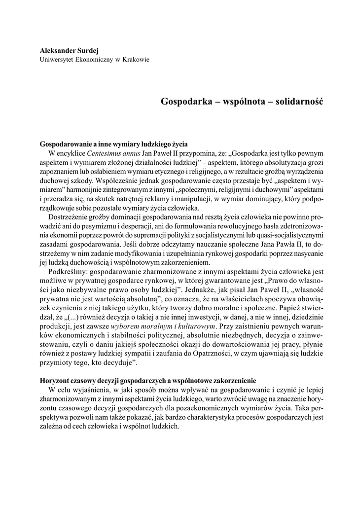 204 Aleksander Surdej Uniwersytet Ekonomiczny w Krakowie Gospodarka wspólnota solidarnoæ Gospodarowanie a inne wymiary ludzkiego ¿ycia W encyklice Centesimus annus Jan Pawe³ II przypomina, ¿e: Gospodarka jest tylko pewnym aspektem i wymiarem z³o¿onej dzia³alnoci ludzkiej aspektem, którego absolutyzacja grozi zapoznaniem lub os³abieniem wymiaru etycznego i religijnego, a w rezultacie grob¹ wyrz¹dzenia duchowej szkody. Wspó³czenie jednak gospodarowanie czêsto przestaje byæ aspektem i wymiarem harmonijnie zintegrowanym z innymi spo³ecznymi, religijnymi i duchowymi aspektami i przeradza siê, na skutek natrêtnej reklamy i manipulacji, w wymiar dominuj¹cy, który podporz¹dkowuje sobie pozosta³e wymiary ¿ycia cz³owieka. Dostrze¿enie groby dominacji gospodarowania nad reszt¹ ¿ycia cz³owieka nie powinno prowadziæ ani do pesymizmu i desperacji, ani do formu³owania rewolucyjnego has³a zdetronizowania ekonomii poprzez powrót do supremacji polityki z socjalistycznymi lub quasi-socjalistycznymi zasadami gospodarowania. Jeli dobrze odczytamy nauczanie spo³eczne Jana Paw³a II, to dostrze¿emy w nim zadanie modyfikowania i uzupe³niania rynkowej gospodarki poprzez nasycanie jej ludzk¹ duchowoci¹ i wspólnotowym zakorzenieniem. Podkrelmy: gospodarowanie zharmonizowane z innymi aspektami ¿ycia cz³owieka jest mo¿liwe w prywatnej gospodarce rynkowej, w której gwarantowane jest Prawo do w³asnoci jako niezbywalne prawo osoby ludzkiej. Jednak¿e, jak pisa³ Jan Pawe³ II, w³asnoæ prywatna nie jest wartoci¹ absolutn¹, co oznacza, ¿e na w³acicielach spoczywa obowi¹zek czynienia z niej takiego u¿ytku, który tworzy dobro moralne i spo³eczne. Papie¿ stwierdza³, ¿e (...) równie¿ decyzja o takiej a nie innej inwestycji, w danej, a nie w innej, dziedzinie produkcji, jest zawsze wyborem moralnym i kulturowym. Przy zaistnieniu pewnych warunków ekonomicznych i stabilnoci politycznej, absolutnie niezbêdnych, decyzja o zainwestowaniu, czyli o daniu jakiej spo³ecznoci okazji do dowartociowania jej pracy, p³ynie równie¿ z postawy ludzkiej sympatii i zaufania do Opatrznoci, w czym ujawniaj¹ siê ludzkie przymioty tego, kto decyduje. Horyzont czasowy decyzji gospodarczych a wspólnotowe zakorzenienie W celu wyjanienia, w jaki sposób mo¿na wp³ywaæ na gospodarowanie i czyniæ je lepiej zharmonizowanym z innymi aspektami ¿ycia ludzkiego, warto zwróciæ uwagê na znaczenie horyzontu czasowego decyzji gospodarczych dla pozaekonomicznych wymiarów ¿ycia. Taka perspektywa pozwoli nam tak¿e pokazaæ, jak bardzo charakterystyka procesów gospodarczych jest zale¿na od cech cz³owieka i wspólnot ludzkich. 205 Gospodarka wspólnota solidarnoæ Tab. 1. Czynniki rozwoju gospodarczego w zale¿noci od horyzontu czasowego Czynniki Teorie najlepiej wyjaniaj¹ce rozwój gospodarczy 10100 tradycja, to¿samoæ, lojalnoæ, zaufanie 110 przywództwo, zdolnoæ do organizowania siê i wspó³pracy wielkoæ bud¿etu, inwestycje, zarz¹dzanie ekonomia instytucjonalna (w tym jej ga³¹ k³ad¹ca nacisk na rolê wiedzy i ludzkiego poznania) teorie dzia³añ zbiorowych i teorie kosztów transakcyjnych teorie organizacji i teoria pryncypa³ agent Horyzont czasowy (w latach) 01 ród³o: opracowanie autora na podstawie: Williamson (2000). Jeli pamiêtamy, ¿e proces rozwoju gospodarczego przebiega na wielu poziomach i z ró¿n¹ prêdkoci¹, to dostrze¿emy pewn¹ komplementarnoæ pomiêdzy podejciem, które wskazuje na znaczenie takich czynników, jak po³o¿enie geograficzne (w szczególnoci na znaczenie odleg³oci od centrum rozwoju) lub wyposa¿enie w zasoby naturalne, a podejciem podkrelaj¹cym wagê czynników spo³ecznych, takich jak si³a wiêzi spo³ecznej i miêdzyludzkie zaufanie lub jakoæ polityk publicznych. Przyjêcie perspektywy krótkookresowej prowadzi do uwypuklania takich czynników, jak wielkoæ dostêpnych rodków bud¿etowych czy jakoæ zarz¹dzaj¹cych. W krótkim okresie, pod presj¹ ograniczeñ, silniej odczuwamy konflikt celów (czy dostêpne rodki przeznaczyæ na edukacjê, czy na ochronê zdrowia) i konflikt sposobów dzia³ania (czy dzia³aæ szybko poprzez narzêdzia administracyjnego przymusu, czy te¿ wolniej przez cierpliw¹ edukacjê). Taki konflikt jest widoczny z ca³¹ si³¹ w gospodarce zarówno na poziomie przedsiêbiorstwa, gdy przedsiêbiorca pragnie sfinansowaæ inwestycje daj¹ce szanse na przysz³y rozwój kosztem zmniejszenia (lub ograniczenia wzrostu) p³ac zatrudnionych, jak i w skali ca³ej gospodarki, gdy presja na wzrost p³ac ogranicza mo¿liwoci sfinansowania inwestycji ze rodków w³asnych przedsiêbiorstw. W istocie rzeczy problem znalezienia optymalnego sposobu rozdzia³u rodków pomiêdzy cele krótkookresowe a d³ugookresowe, pomiêdzy p³ace a zyski jest problemem spo³ecznego zaufania. Jeli szanowany i wiarygodny dla swoich pracowników przedsiêbiorca zobowi¹zuje siê, ¿e zwiêkszone zyski zainwestuje w rozwój firmy, to roszczenia p³acowe prawdopodobnie bêd¹ ograniczane, gdy¿ pracownicy rozumiej¹, ¿e powiêcenie zostanie zrekompensowane rozwojem przedsiêbiorstwa (w formie zwiêkszonej pewnoci zatrudnienia albo w formie przysz³ego wzrostu p³ac). Jeli lider polityczny apeluje o ograniczenie ¿¹dañ p³acowych, gdy¿ grozi to inflacj¹ i pogorszeniem miêdzynarodowej konkurencyjnoci kraju, to jego wezwania znajd¹ pos³uch tylko wtedy, gdy jest on osob¹ obdarzan¹ spo³ecznym zaufaniem. Brak lub niski poziom zaufania sprawia, ¿e nie podejmuje siê zadañ s³u¿¹cych realizacji d³ugookresowych celów, ¿e spo³eczne interakcje mog¹ staæ siê wojnami wszystkich ze wszystkimi konfliktami, w których gin¹ z pola widzenia szanse mo¿liwe dziêki d³ugookresowo zorientowanej kooperacji. Z tej perspektywy wyranie widaæ, ¿e problem d³ugookresowego rozwoju to w mniejszym stopniu problem obiektywnych ograniczeñ zasobowych, a w wiêkszym problem wzorców wspó³dzia³ania w rodowisku spo³ecznym. Wspólnotowa orientac