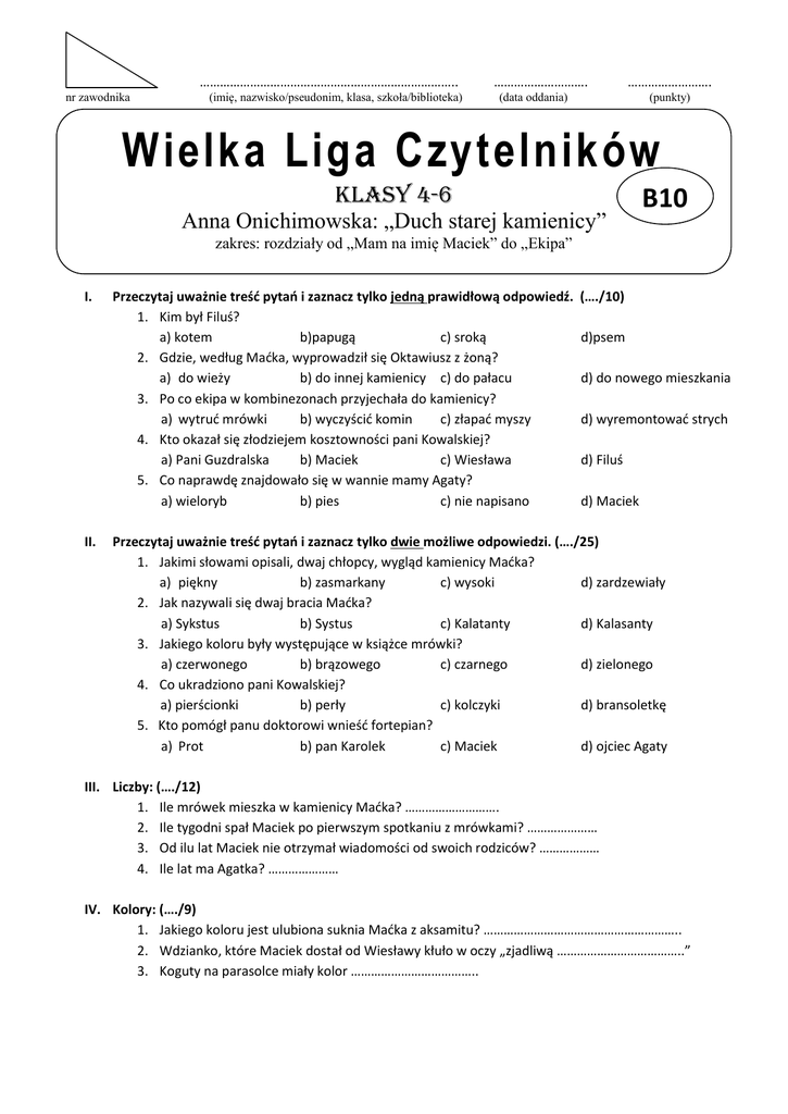………………………………………………………………….. nr zawodnika (imię, nazwisko/pseudonim, klasa, szkoła/biblioteka) ………………………. ……………………. (data oddania) (punkty) Wielka Liga Czytelników KLASY 4-6 Anna Onichimowska: „Duch starej kamienicy” B10 zakres: rozdziały od „Mam na imię Maciek” do „Ekipa” I. II. Przeczytaj uważnie treść pytań i zaznacz tylko jedną prawidłową odpowiedź. 1. Kim był Filuś? a) kotem b)papugą c) sroką 2. Gdzie, według Maćka, wyprowadził się Oktawiusz z żoną? a) do wieży b) do innej kamienicy c) do pałacu 3. Po co ekipa w kombinezonach przyjechała do kamienicy? a) wytruć mrówki b) wyczyścić komin c) złapać myszy 4. Kto okazał się złodziejem kosztowności pani Kowalskiej? a) Pani Guzdralska b) Maciek c) Wiesława 5. Co naprawdę znajdowało się w wannie mamy Agaty? a) wieloryb b) pies c) nie napisano (…./10) d)psem d) do nowego mieszkania d) wyremontować strych d) Filuś d) Maciek Przeczytaj uważnie treść pytań i zaznacz tylko dwie możliwe odpowiedzi. (…./25) 1. Jakimi słowami opisali, dwaj chłopcy, wygląd kamienicy Maćka? a) piękny b) zasmarkany c) wysoki d) zardzewiały 2. Jak nazywali się dwaj bracia Maćka? a) Sykstus b) Systus c) Kalatanty d) Kalasanty 3. Jakiego koloru były występujące w książce mrówki? a) czerwonego b) brązowego c) czarnego d) zielonego 4. Co ukradziono pani Kowalskiej? a) pierścionki b) perły c) kolczyki d) bransoletkę 5. Kto pomógł panu doktorowi wnieść fortepian? a) Prot b) pan Karolek c) Maciek d) ojciec Agaty III. Liczby: (…./12) 1. Ile mrówek mieszka w kamienicy Maćka? ………………………. 2. Ile tygodni spał Maciek po pierwszym spotkaniu z mrówkami? ………………… 3. Od ilu lat Maciek nie otrzymał wiadomości od swoich rodziców? ……………… 4. Ile lat ma Agatka? ………………… IV. Kolory: (…./9) 1. Jakiego koloru jest ulubiona suknia Maćka z aksamitu? ………………………………………………….. 2. Wdzianko, które Maciek dostał od Wiesławy kłuło w oczy „zjadliwą ………………………………..” 3. Koguty na parasolce miały kolor ……………………………….. V. Rozwiąż krzyżówkę: (…./14) 1. Np. ……………….faraona 2. Kryjówka bliźniaków. 3. Sroka strzelała z pestek używając… 4. Podobno był w wannie u Agaty. 5. Imię sroki, współlokatorki Maćka. 6. Prot IV jest zwierzęciem. Jest to… 1. 2. 3. 4. 5. Hasło: ………………………………………… 6. VI. Korzystając ze słowników, leksykonów lub encyklopedii w wersji papierowej przetłumacz na język angielski oraz napisz tytuł książki, z której korzystałeś (źródło). (…/6) 1. duch- ……………………………………… 2. strych - …………………………........... Źródło: …………………………………………………………………………………………………….. VII. Korzystając ze słownika frazeologicznego w wersji papierowej podaj znaczenie związku frazeologicznego oraz napisz tytuł książki, z której korzystałeś (źródło): (…./10) 1. pracowity jak mrówka: ……………………………………………………………………………………………………………… 2. chwytać wiatr w żagle: ……………………………………………………………………………………………………………… Źródło:…………………………………………………………………………………………………………….. VIII. Rozwiąż zadanie matematyczne: (…./6) W czterech etapach wyścigu samochodowego uczestnicy pokonali następujące odległości: 1693 km, 248 km, 756 km, 368 km. Ile kilometrów liczyła trasa tego wyścigu? Działanie: …………………………………………………………………………………………………………………………………………… Odpowiedź: ………………………………………………………………………………………………………………………………………… IX. Wypisz imiona hetmanów wielkich koronnych, którzy w latach 1500-1550 dowodzili wojskami Królestwa Polskiego: (…./6) 1. ……………………………………… Kamieniecki 2. ………………………………………… Firlej 3. ……………………………………………Tarnowski X. Czy uważasz, że zachowanie Marka i Jarka w książce Anny Onichimowskiej było właściwe? Odpowiedz pełnym zdaniem uzasadniając swoją wypowiedź. (…./2) …………………………………………………………………………………………………………………………………………………………… …………………………………………………………………………………………………………………………………………………………… …………………………………………………………………………………………………………………………………………………………… ZIARENKO MĄDROŚCI: „Czytanie książek to najpiękniejsza zabawa, jaką sobie ludzkość wymyśliła”. Wisława Szymborska WIELKA LIGA CZYTELNIKÓW — KL. 4-6 www.WielkaLiga.pl FORMULARZ NR B10 – wersja: 1.0, autor: Katarzyna Antosz, wersja: 2.0, autor: Anna Tompolska Data oprac. wrzesień 2016r.