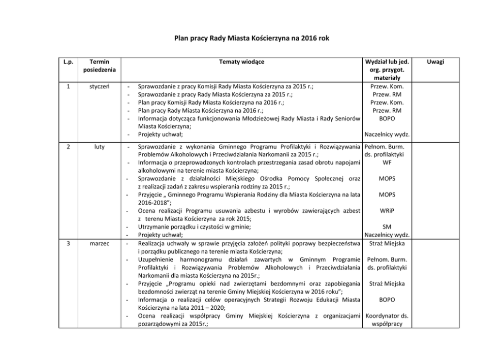 Plan pracy Rady Miasta Kościerzyna na 2016 rok L.p. Termin posiedzenia 1 styczeń Tematy wiodące - 2 luty - 3 marzec - - Wydział lub jed. org. przygot. materiały Sprawozdanie z pracy Komisji Rady Miasta Kościerzyna za 2015 r.; Przew. Kom. Sprawozdanie z pracy Rady Miasta Kościerzyna za 2015 r.; Przew. RM Plan pracy Komisji Rady Miasta Kościerzyna na 2016 r.; Przew. Kom. Plan pracy Rady Miasta Kościerzyna na 2016 r.; Przew. RM Informacja dotycząca funkcjonowania Młodzieżowej Rady Miasta i Rady Seniorów BOPO Miasta Kościerzyna; Projekty uchwał; Naczelnicy wydz. Sprawozdanie z wykonania Gminnego Programu Profilaktyki i Rozwiązywania Problemów Alkoholowych i Przeciwdziałania Narkomanii za 2015 r.; Informacja o przeprowadzonych kontrolach przestrzegania zasad obrotu napojami alkoholowymi na terenie miasta Kościerzyna; Sprawozdanie z działalności Miejskiego Ośrodka Pomocy Społecznej oraz z realizacji zadań z zakresu wspierania rodziny za 2015 r.; Przyjęcie „ Gminnego Programu Wspierania Rodziny dla Miasta Kościerzyna na lata 2016-2018”; Ocena realizacji Programu usuwania azbestu i wyrobów zawierających azbest z terenu Miasta Kościerzyna za rok 2015; Utrzymanie porządku i czystości w gminie; Projekty uchwał; Realizacja uchwały w sprawie przyjęcia założeń polityki poprawy bezpieczeństwa i porządku publicznego na terenie miasta Kościerzyna; Uzupełnienie harmonogramu działań zawartych w Gminnym Programie Profilaktyki i Rozwiązywania Problemów Alkoholowych i Przeciwdziałania Narkomanii dla miasta Kościerzyna na 2015r.; Przyjęcie „Programu opieki nad zwierzętami bezdomnymi oraz zapobiegania bezdomności zwierząt na terenie Gminy Miejskiej Kościerzyna w 2016 roku”; Informacja o realizacji celów operacyjnych Strategii Rozwoju Edukacji Miasta Kościerzyna na lata 2011 – 2020; Ocena realizacji współpracy Gminy Miejskiej Kościerzyna z organizacjami pozarządowymi za 2015r.; Pełnom. Burm. ds. profilaktyki WF MOPS MOPS WRiP SM Naczelnicy wydz. Straż Miejska Pełnom. Burm. ds. profilaktyki Straż Miejska BOPO Koordynator ds. współpracy Uwagi - 4 kwiecień - 5 maj - 6 czerwiec 7 lipiec 8 sierpień 9 wrzesień - Zatwierdzenie „Wieloletniego planu rozwoju i modernizacji urządzeń wodociągowych i urządzeń kanalizacyjnych na lata 2016 – 2018”; Projekty uchwał; Informacja z działalności LOT SERCE KASZUB; Ocena realizacji za 2015 r. Strategii Rozwoju Społeczno – Gospodarczego na lata 2014-2020; Raport z monitoringu „Planu działań na rzecz zrównoważonej energii dla miasta Kościerzyna”; Ocena zasobów Pomocy Społecznej; Projekty uchwał; Zatwierdzenie taryfy dla zbiorowego zaopatrzenia w wodę i zbiorowego odprowadzania ścieków na terenie miasta Kościerzyna; Sprawozdanie z gospodarowania zasobem mieszkaniowym; Wręczenie nagród dla twórców i działaczy kultury oraz dla sportowców i działaczy sportowych za wybitne osiągnięcia; Informacja z działalności Związku Gmin Wierzyca; Projekty uchwał; Sprawozdanie z wykonania budżetu Miasta Kościerzyna za 2015r. oraz udzielenie absolutorium Burmistrzowi Miasta; Przygotowanie miasta do sezonu letniego; Projekty uchwał; Informacja z działalności spółek z udziałem kapitału miasta za 2015r.; Projekty uchwał; KOS – EKO Naczelnicy wydz. WRiP WRiP WRiP MOPS Naczelnicy wydz. KOS-EKO WSOS Przewodniczący Kapituły ZGW Naczelnicy wydz. WF KDK, KOSiR Naczelnicy wydz. Spółki Naczelnicy wydz. Informacja o przygotowaniu szkół miejskich do roku szkolnego 2016 – 2017; BOPO Projekty uchwał; Naczelnicy wydz. Informacja z wykonania budżetu miasta za I półrocze 2016 r.; WF Informacja z realizacji inwestycji miejskich; WIZP Sprawozdanie z wykonania zadań i działalności Kościerskiego Domu Kultury KDK, KOSiR i Kościerskiego Ośrodka Sportu i Rekreacji w okresie sezonu letniego; WIZP Aktualizacja Planu Zaopatrzenia w Ciepło, Energię Elektryczną i Paliwa Gazowe Gminy Miejskiej Kościerzyna; Przewod. RM Analiza oświadczeń majątkowych; Burmistrz Ustalenie stawek podatkowych na rok 2017: WF - od nieruchomości, - od środków transportowych, 2 10 październik - - opłaty targowej, Projekty uchwał; Naczelnicy wydz. Uroczysta sesja Rady Miasta z okazji Dnia Edukacji Narodowej; BOPO Wręczenie nagród Burmistrza nauczycielom za wybitne osiągnięcia w pracy BOPO z dziećmi i młodzieżą; 11 listopad - Informacja z wykonania zadań oświatowych w roku szkolnym 2015/2016; 12 grudzień - Uchwalenie budżetu miasta oraz wieloletniej prognozy finansowej na 2017 r.; WF Przyjęcie Gminnego Programu Profilaktyki i Rozwiązywania Problemów Pełnom. Burm. Alkoholowych oraz Przeciwdziałania Narkomanii dla miasta Kościerzyna na 2017 r.; ds. profilaktyki Przew. Kom. Sprawozdanie z pracy Komisji Rady Miasta Kościerzyna za 2016 r.; Przew. RM Sprawozdanie z pracy Rady Miasta Kościerzyna za 2016 r. - BOPO Przewodniczący Rady Miasta Kościerzyna Teresa Preis Uwaga! Planuje się, że sesje zwoływane będą na ostatnią środę miesiąca za wyjątkiem sesji nadzwyczajnych i sesji zwyczajnych nie przewidzianych w planie pracy, ale zwołanych w zwykłym trybie. 3