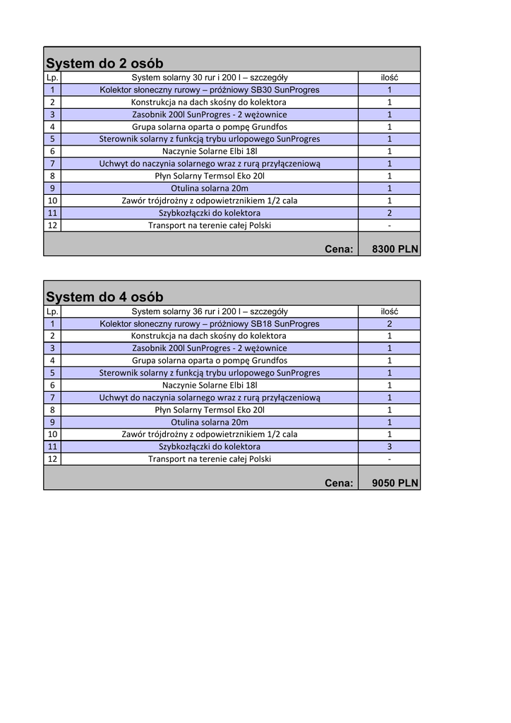 System do 2 osób Lp. 1 System solarny 30 rur i 200 l – szczegóły Kolektor słoneczny rurowy – próżniowy SB30 SunProgres ilość 1 2 3 4 5 6 7 8 9 10 11 12 Konstrukcja na dach skośny do kolektora Zasobnik 200l SunProgres ‐ 2 wężownice Grupa solarna oparta o pompę Grundfos Sterownik solarny z funkcją trybu urlopowego SunProgres Naczynie Solarne Elbi 18l Uchwyt do naczynia solarnego wraz z rurą przyłączeniową Płyn Solarny Termsol Eko 20l Otulina solarna 20m Zawór trójdrożny z odpowietrznikiem 1/2 cala Szybkozłączki do kolektora Transport na terenie całej Polski 1 1 1 1 1 1 1 1 1 2 ‐ Cena: 8300 PLN System do 4 osób Lp. 1 System solarny 36 rur i 200 l – szczegóły Kolektor słoneczny rurowy – próżniowy SB18 SunProgres ilość 2 2 3 4 5 6 7 8 9 10 11 12 Konstrukcja na dach skośny do kolektora Zasobnik 200l SunProgres ‐ 2 wężownice Grupa solarna oparta o pompę Grundfos Sterownik solarny z funkcją trybu urlopowego SunProgres Naczynie Solarne Elbi 18l Uchwyt do naczynia solarnego wraz z rurą przyłączeniową Płyn Solarny Termsol Eko 20l Otulina solarna 20m Zawór trójdrożny z odpowietrznikiem 1/2 cala Szybkozłączki do kolektora Transport na terenie całej Polski 1 1 1 1 1 1 1 1 1 3 ‐ Cena: 9050 PLN System do 5 osób Lp. 1 System solarny 36 rur i 300 l – szczegóły Kolektor słoneczny rurowy – próżniowy SB18 SunProgres ilość 2 2 3 4 5 6 7 8 9 10 11 12 Konstrukcja na dach skośny do kolektora Zasobnik 300l SunProgres ‐ 2 wężownice Grupa solarna oparta o pompę Grundfos Sterownik solarny z funkcją trybu urlopowego SunProgres Naczynie Solarne Elbi 18l Uchwyt do naczynia solarnego wraz z rurą przyłączeniową Płyn Solarny Termsol Eko 20l Otulina solarna 20m Zawór trójdrożny z odpowietrznikiem 1/2 cala Szybkozłączki do kolektora Transport na terenie całej Polski 1 1 1 1 1 1 1 1 1 3 ‐ Cena: 9500 PLN System do 6 osób Lp. 1 System solarny 44 rur i 300 l – szczegóły Kolektor słoneczny rurowy – próżniowy SB22 SunProgres ilość 2 2 3 4 5 6 7 8 9 10 11 12 Konstrukcja na dach skośny do kolektora Zasobnik 300l SunProgres ‐ 2 wężownice Grupa solarna oparta o pompę Grundfos Sterownik solarny z funkcją trybu urlopowego SunProgres Naczynie Solarne Elbi 18l Uchwyt do naczynia solarnego wraz z rurą przyłączeniową Płyn Solarny Termsol Eko 20l Otulina solarna 20m Zawór trójdrożny z odpowietrznikiem 1/2 cala Szybkozłączki do kolektora Transport na terenie całej Polski 1 1 1 1 1 1 1 1 1 3 ‐ Cena: 10250 PLN System do 8 osób Lp. 1 System solarny 48 rur i 400 l – szczegóły Kolektor słoneczny rurowy–próżniowy SB30+18 SunProgres ilość 1 2 3 4 5 6 7 8 9 10 11 12 Konstrukcja na dach skośny do kolektora Zasobnik 400l SunProgres ‐ 2 wężownice Grupa solarna oparta o pompę Grundfos Sterownik solarny z funkcją trybu urlopowego SunProgres Naczynie Solarne Elbi 24l Uchwyt do naczynia solarnego wraz z rurą przyłączeniową Płyn Solarny Termsol Eko 20l Otulina solarna 20m Zawór trójdrożny z odpowietrznikiem 1/2 cala Szybkozłączki do kolektora Transport na terenie całej Polski 4 1 1 1 1 1 1 1 1 3 ‐ Cena: 12300 PLN System do 8 osób Lp. 1 System solarny 54 rur i 400 l – szczegóły Kolektor słoneczny rurowy–próżniowy SB18 SunProgres ilość 3 2 3 4 5 6 7 8 9 10 11 12 Konstrukcja na dach skośny do kolektora Zasobnik 400l SunProgres ‐ 2 wężownice Grupa solarna oparta o pompę Grundfos Sterownik solarny z funkcją trybu urlopowego SunProgres Naczynie Solarne Elbi 24l Uchwyt do naczynia solarnego wraz z rurą przyłączeniową Płyn Solarny Termsol Eko 20l Otulina solarna 20m Zawór trójdrożny z odpowietrznikiem 1/2 cala Szybkozłączki do kolektora Transport na terenie całej Polski 4 1 1 1 1 1 1 1 1 4 ‐ Cena: 13050 PLN System do 10 osób Lp. 1 System solarny 60 rur i 500 l – szczegóły Kolektor słoneczny rurowy – próżniowy SB30 SunProgres ilość 2 2 3 4 5 6 7 8 9 10 11 12 Konstrukcja na dach skośny do kolektora Zasobnik 500l SunProgres ‐ 2 wężownice Grupa solarna oparta o pompę Grundfos Sterownik solarny z funkcją trybu urlopowego SunProgres Naczynie Solarne Elbi 24l Uchwyt do naczynia solarnego wraz z rurą przyłączeniową Płyn Solarny Termsol Eko 20l Otulina solarna 20m Zawór trójdrożny z odpowietrznikiem 1/2 cala Szybkozłączki do kolektora Transport na terenie całej Polski 2 1 1 1 1 1 1 1 1 3 ‐ Cena: 15000 PLN System do 10 osób Lp. 1 System solarny 66 rur i 500 l – szczegóły Kolektor słoneczny rurowy – próżniowy SB22 SunProgres ilość 3 2 3 4 5 6 7 8 9 10 11 12 Konstrukcja na dach skośny do kolektora Zasobnik 500l SunProgres ‐ 2 wężownice Grupa solarna oparta o pompę Grundfos Sterownik solarny z funkcją trybu urlopowego SunProgres Naczynie Solarne Elbi 24l Uchwyt do naczynia solarnego wraz z rurą przyłączeniową Płyn Solarny Termsol Eko 20l Otulina solarna 20m Zawór trójdrożny z odpowietrznikiem 1/2 cala Szybkozłączki do kolektora Transport na terenie całej Polski 2 1 1 1 1 1 1 1 1 4 ‐ Cena: 15750 PLN System do 4 osób + C.O. Lp. 1 System solarny 66 rur i 500/160 l – szczegóły Kolektor słoneczny rurowy – próżniowy SB22 SunProgres ilość 3 2 3 4 5 6 7 8 9 10 11 12 Konstrukcja na dach skośny do kolektora Zasobnik 500/150l SunProgres ‐ 2 wężownice Grupa solarna oparta o pompę Grundfos Sterownik solarny z funkcją trybu urlopowego SunProgres Naczynie Solarne Elbi 24l Uchwyt do naczynia solarnego wraz z rurą przyłączeniową Płyn Solarny Termsol Eko 20l Otulina solarna 20m Zawór trójdrożny z odpowietrznikiem 1/2 cala Szybkozłączki do kolektora Transport na terenie całej Polski 2 1 1 1 1 1 1 1 1 4 ‐ Cena: 18000 PLN System do 6 osób + C.O. Lp. 1 System solarny 110 rur i 800/200 l – szczegóły Kolektor słoneczny rurowy – próżniowy SB22 SunProgres ilość 5 2 3 4 5 6 7 8 9 10 11 12 Konstrukcja na dach skośny do kolektora Zasobnik 800/200 SunProgres ‐ 2 wężownice Grupa solarna oparta o pompę Grundf