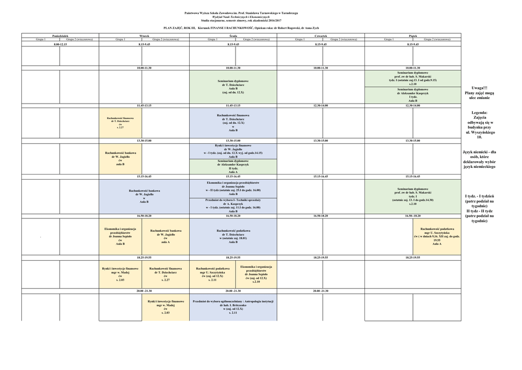 Państwowa Wyższa Szkoła Zawodowa im. Prof. Stanisława Tarnowskiego w Tarnobrzegu Wydział Nauk Technicznych i Ekonomicznych Studia stacjonarne, semestr zimowy, rok akademicki 2016/2017 PLAN ZAJĘĆ, ROK III, Kierunek FINANSE I RACHUNKOWOŚĆ, Opiekun roku: dr Robert Rogowski, dr Anna Zych Grupa 1 Poniedziałek Grupa 2 (wieczorowa) Środa Wtorek Grupa 1 Grupa 2 (wieczorowa) 8.00-12.15 Grupa 2 (wieczorowa) Grupa 1 Grupa 2 (wieczorowa) 8.15-9.45 8.15-9.45 8.15-9.45 10.00-11.30 10.00-11.30 10.00-11.30 Grupa 2 (wieczorowa) 8.15-9.45 10.00-11.30 Seminarium dyplomowe dr Aleksander Kasprzyk I tydz. Aula B 12.30-14.00 13.30-15.00 13.30-15.00 15.15-16.45 Rynki i inwestycje finansowe dr W. Jagiełło w - I tydz. (zaj. od dn. 12.X wyj. od godz.14.15) Aula B Seminarium dyplomowe dr Aleksander Kasprzyk II tydz. Aula A 15.15-16.45 Rachunkowość bankowa dr W. Jagiełło ćw aula B Rachunkowość bankowa dr W. Jagiełło w Aula B 16.50-18.20 Legenda: Zajęcia odbywają się w budynku przy ul. Wyszyńskiego 10. Ekonomika i organizacja przedsiębiorstw dr Joanna Sepioło ćw Aula B Rachunkowość bankowa dr W. Jagiełło ćw aula A 18.25-19.55 Rynki i inwestycje finansowe mgr w. Madej ćw s. 2.03 Rachunkowość finansowa dr T. Dziechciarz ćw s. 2.27 20.00 -21.30 Rynki i inwestycje finansowe mgr w. Madej ćw s. 2.03 13.30-15.00 15.15-16.45 16.50-18.20 18.25-19.55 Ekonomika i organizacja przedsiębiorstw dr Joanna Sepioło ćw (zaj. od 12.X) s.2.10 20.00 -21.30 Przedmiot do wyboru ogólnouczelniany : Antropologia instytucji dr hab. I. Britczenko w (zaj. od 12.X) s. 2.11 16.50--18.20 Rachunkowość podatkowa mgr U. Szczytyńska ćw ( w dniach 9,16. XII zaj. do godz. 19.55 Aula A Rachunkowość podatkowa dr T. Dziechciarz w (ostatnie zaj. 18.01) Aula B Rachunkowość podatkowa mgr U. Szczytyńska ćw (zaj. od 12.X) s. 2.11 15.15-16.45 Seminarium dyplomowe prof. zw dr hab. S. Makarski tydz. I (ostatnie zaj. 13. I do godz.14.30) s.2.10 Przedmiot do wyboru I- Techniki sprzedaży dr A. Kasprzyk w - I tydz. (ostatnie zaj. 11.I do godz. 16.00) Aula B 18.25-19.55 13.30-15.00 Język niemicki - dla osób, które deklarowały wybór język niemieckiego Ekonomika i organizacja przedsiębiorstw dr Joanna Sepioło w - II tydz (ostatnie zaj. 25.I do godz. 16.00) Aula B 16.50-18.20 Uwaga!!! Plany zajęć mogą ulec zmianie 12.30-14.00 Rachunkowość finansowa dr T. Dziechciarz (zaj. od dn. 12.X) w Aula B Rachunkowość finansowa dr T. Dziechciarz ćw s. 2.27 . 11.45-13.15 Grupa 1 Seminarium dyplomowe prof. zw dr hab. S. Makarski tydz. I (ostatnie zaj.13. I od godz.9.15) s.2.10 Seminarium dyplomowe dr T. Dziechciarz Aula B (zaj. od dn. 12.X) 11.45-13.15 Piątek Czwartek Grupa 1 20.00 -21.30 18.25-19.55 I tydz. - I tydzień (patrz podział na tygodnie) II tydz - II tydz (patrz podział na tygodnie)