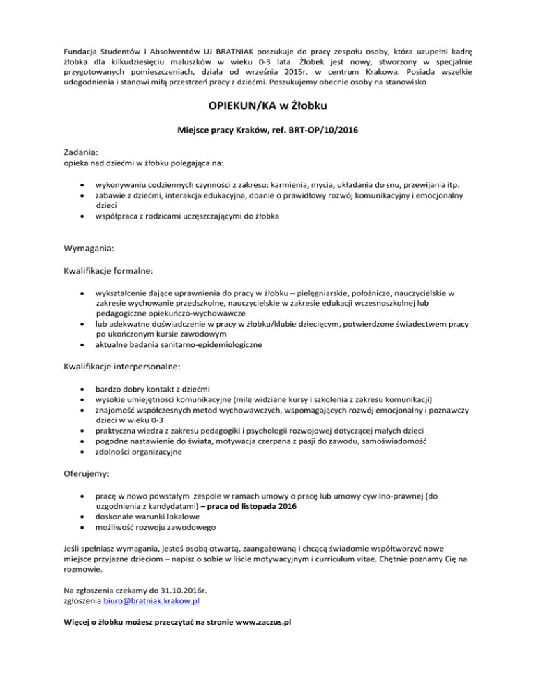 Fundacja Studentów i Absolwentów UJ BRATNIAK poszukuje do pracy zespołu osoby, która uzupełni kadrę żłobka dla kilkudziesięciu maluszków w wieku 0-3 lata. Żłobek jest nowy, stworzony w specjalnie przygotowanych pomieszczeniach, działa od września 2015r. w centrum Krakowa. Posiada wszelkie udogodnienia i stanowi miłą przestrzeń pracy z dziećmi. Poszukujemy obecnie osoby na stanowisko OPIEKUN/KA w Żłobku Miejsce pracy Kraków, ref. BRT-OP/10/2016 Zadania: opieka nad dziećmi w żłobku polegająca na: wykonywaniu codziennych czynności z zakresu: karmienia, mycia, układania do snu, przewijania itp. zabawie z dziećmi, interakcja edukacyjna, dbanie o prawidłowy rozwój komunikacyjny i emocjonalny dzieci współpraca z rodzicami uczęszczającymi do żłobka Wymagania: Kwalifikacje formalne: wykształcenie dające uprawnienia do pracy w żłobku – pielęgniarskie, położnicze, nauczycielskie w zakresie wychowanie przedszkolne, nauczycielskie w zakresie edukacji wczesnoszkolnej lub pedagogiczne opiekuńczo-wychowawcze lub adekwatne doświadczenie w pracy w żłobku/klubie dziecięcym, potwierdzone świadectwem pracy po ukończonym kursie zawodowym aktualne badania sanitarno-epidemiologiczne Kwalifikacje interpersonalne: bardzo dobry kontakt z dziećmi wysokie umiejętności komunikacyjne (mile widziane kursy i szkolenia z zakresu komunikacji) znajomość współczesnych metod wychowawczych, wspomagających rozwój emocjonalny i poznawczy dzieci w wieku 0-3 praktyczna wiedza z zakresu pedagogiki i psychologii rozwojowej dotyczącej małych dzieci pogodne nastawienie do świata, motywacja czerpana z pasji do zawodu, samoświadomość zdolności organizacyjne Oferujemy: pracę w nowo powstałym zespole w ramach umowy o pracę lub umowy cywilno-prawnej (do uzgodnienia z kandydatami) – praca od listopada 2016 doskonałe warunki lokalowe możliwość rozwoju zawodowego Jeśli spełniasz wymagania, jesteś osobą otwartą, zaangażowaną i chcącą świadomie współtworzyć nowe miejsce przyjazne dzieciom – napisz o sobie w liście motywacyjnym i curriculum vitae. Chętnie poznamy Cię na rozmowie. Na zgłoszenia czekamy do 31.10.2016r. zgłoszenia [email protected] Więcej o żłobku możesz przeczytać na stronie www.zaczus.pl