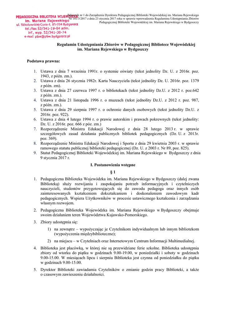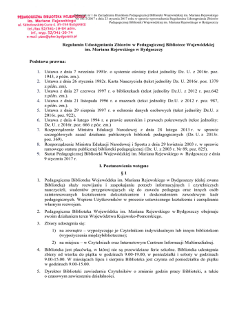 Załącznik nr 1 do Zarządzenia Dyrektora Pedagogicznej Biblioteki Wojewódzkiej im. Mariana Rejewskiego Nr 181/3/2017 z dnia 23 stycznia 2017 roku w sprawie wprowadzenia Regulaminu Udostępniania Zbiorów Pedagogicznej Biblioteki Wojewódzkiej im. Mariana Rejewskiego w Bydgoszczy Regulamin Udostępniania Zbiorów w Pedagogicznej Bibliotece Wojewódzkiej im. Mariana Rejewskiego w Bydgoszczy Podstawa prawna: 1. Ustawa z dnia 7 września 1991r. o systemie oświaty (tekst jednolity Dz. U. z 2016r. poz. 1943, z późn. zm.). 2. Ustawa z dnia 26 stycznia 1982r. Karta Nauczyciela (tekst jednolity Dz. U. 2016r. poz. 1379 z późn. zm). 3. Ustawa z dnia 27 czerwca 1997 r. o bibliotekach (tekst jednolity Dz.U. z 2012 r. poz.642 z późn. zm.). 4. Ustawa z dnia 21 listopada 1996 r. o muzeach (tekst jednolity Dz.U. z 2012 r. poz. 987, z późn. zm.). 5. Ustawa z dnia 29 sierpnia 1997 r. o ochronie danych osobowych (tekst jednolity Dz.U. z 2016r. poz. 922). 6. Ustawa z dnia 4 lutego 1994 r. o prawie autorskim i prawach pokrewnych (tekst jednolity: Dz. U. z 2016r. poz. 666 z póz. zm.) 7. Rozporządzenie Ministra Edukacji Narodowej z dnia 28 lutego 2013 r. w sprawie szczegółowych zasad działania publicznych bibliotek pedagogicznych (Dz. U. z 2013r. poz. 369). 8. Rozporządzenie Ministra Edukacji Narodowej i Sportu z dnia 29 kwietnia 2003 r. w sprawie ramowego statutu publicznej biblioteki pedagogicznej (Dz. U. z 2003 r. Nr 89, poz. 825). 9. Statut Pedagogicznej Biblioteki Wojewódzkiej im. Mariana Rejewskiego w Bydgoszczy z dnia 9 stycznia 2017 r. I. Postanowienia wstępne §1 1. Pedagogiczna Biblioteka Wojewódzka im. Mariana Rejewskiego w Bydgoszczy (dalej zwana Biblioteką) służy rozwijaniu i zaspokajaniu potrzeb informacyjnych i czytelniczych nauczycieli, studentów przygotowujących się do zawodu pedagoga oraz innych osób zainteresowanych kształceniem dokształcaniem i doskonaleniem zawodowym kadr pedagogicznych. Wspiera Użytkowników w procesie ustawicznego kształcenia i zarządzania własnym rozwojem. 2. Pedagogiczna Biblioteka Wojewódzka im. Mariana Rejewskiego w Bydgoszczy obejmuje swoim działaniem teren Województwa Kujawsko-Pomorskiego. 3. Zbiory udostępnia się: 1) na zewnątrz – wypożyczając je Czytelnikom indywidualnym lub innym bibliotekom (wypożyczenia międzybiblioteczne); 2) na miejscu – w Czytelniach oraz Internetowym Centrum Informacji Multimedialnej. 4. Biblioteka jest placówką, w której nie są przewidziane ferie szkolne. Biblioteka udostępnia zbiory od wtorku do piątku w godzinach 9.00-19.00, w poniedziałki i soboty w godzinach 9.00-15.00. W miesiącach lipcu i sierpniu Biblioteka jest czynna od poniedziałku do piątku w godzinach 9.00-15.00. 5. Dyrektor Biblioteki zawiadamia Czytelników o zmianie godzin pracy Biblioteki, a także o czasowym zawieszeniu działalności. §2 1. Prawo do korzystania z Biblioteki mają wszyscy zainteresowani jej zbiorami. 2. Osoby zainteresowane zbiorami Biblioteki, a nieuprawnione do wypożyczania na zewnątrz, mogą z nich korzystać na miejscu – w Czytelniach. 3. Korzystanie ze zbiorów Biblioteki jest bezpłatne, z wyjątkiem opłat określonych w załączniku nr 1 do Regulaminu – tabela opłat. §3 1. Informacje o zbiorach można uzyskać poprzez komputerowy katalog online OPAC WWW oraz tradycyjne katalogi. 2. Informacji bibliotecznych i bibliograficznych udzielają dyżurni bibliotekarze. §4 Użytkownik ponosi odpowiedzialność materialną za uszkodzenie lub zagubienie udostępnionych materiałów bibliotecznych. §5 1. Użytkownikowi korzystającemu ze sprzętu komputerowego Biblioteki zabrania się wprowadzania zmian w jego konfiguracji oraz używania własnego oprogramowania. 2. Użytkownik może korzystać w Czytelniach z własnego przenośnego komputera, bez prawa podłączania się do lokalnej sieci komputerowej Biblioteki. §6 1. Dane osobowe Użytkownika są przetwarzane przez Pedagogiczną Bibliotekę Wojewódzką im. Mariana Rejewskiego w Bydgoszczy – Administratora Danych Osobowych zgodnie z ustawą z dnia 29 sierpnia 1997 r. o ochronie danych osobowych (tekst jednolity: Dz. U. z 2016r. poz. 922) i jedynie w celu realizacji zadań statutowych Biblioteki. 2. Na podstawie art. 32 ust. 1 ustawy z dnia 29 sierpnia 1997 r. o ochronie danych osobowych (tekst jednolity: Dz. U. z 2016r. poz. 922) Użytkownikowi przysługuje prawo do: 1) wglądu do treści swoich danych osobowych, ich poprawiania oraz modyfikacji; 2) uzyskania informacji o zakresie i sposobie przetwarzania danych osobowych; 3) uzyskania informacji o sposobie udostępniania danych, w szczególności o odbiorcach lub kategoriach odbiorców, którym dane są udostępniane. II. Udostępnianie zbiorów w Wypożyczalni §7 1. Prawo do wypożyczeń indywidualnych poza Bibliotekę mają: 1) nauczyciele, wychowawcy, pracownicy w Województwie Kujawsko-Pomorskim; pedagogiczni zameldowani na stałe 2) osoby pełnoletnie zameldowane na stałe w Województwie Kujawsko-Pomorskim; 3) studenci bydgoskich uczelni, które wyraziły zgodę na umieszczenie PBW w Bydgoszczy na studenckich kartach obiegowych; 4) uczniowie klas maturalnych zameldowani na stałe w Województwie KujawskoPomorskim. 2 2. Czytelnik, chcąc korzystać z Wypożyczalni, zobowiązany jest do dokonania elektronicznej rejestracji konta bibliotecznego oraz nadania indywidualnego hasła dostępu. Można tego dokonać na stanowisku komputerowym w Bibliotece oraz przez Internet z dowolnego miejsca. 3. Do zapisania się do Biblioteki niezbędny jest ważny dowód osobisty, a także 1) w przypadku nauczyciela oświadczenie, że jest nauczycielem; 2) w przypadku studenta legitymacja studencka. 4. Czytelnik otrzymuje kartę biblioteczną, a przy jej odbiorze powinien podpisać zobowiązanie do przestrzegania niniejszego Regulaminu, co jest równoznaczne z wyrażeniem zgody na umieszczenie swoich danych osobowych w „Zbiorze danych Czytelników PBW w Bydgoszczy" i na przetwarzanie tych danych zg