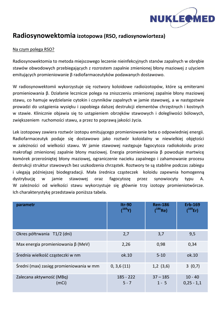 Radiosynowektomia izotopowa (RSO, radiosynowiorteza) Na czym polega RSO? Radiosynowektomia to metoda miejscowego leczenie nieinfekcyjnych stanów zapalnych w obrębie stawów obwodowych przebiegających z rozrostem zapalnie zmienionej błony maziowej z użyciem emitujących promieniowanie β radiofarmaceutyków podawanych dostawowo. W radiosynowektomii wykorzystuje się roztwory koloidowe radioizotopów, które są emiterami promieniowania β. Działanie lecznicze polega na zniszczeniu zmienionej zapalnie błony maziowej stawu, co hamuje wydzielanie cytokin i czynników zapalnych w jamie stawowej, a w następstwie prowadzi do ustąpienia wysięku i zapobiega dalszej destrukcji elementów chrzęstnych i kostnych w stawie. Klinicznie objawia się to ustąpieniem obrzęków stawowych i dolegliwości bólowych, zwiększeniem ruchomości stawu, a przez to poprawą jakości życia. Lek izotopowy zawiera roztwór izotopu emitującego promieniowanie beta o odpowiedniej energii. Radiofarmaceutyk podaje się dostawowo jako roztwór koloidalny w niewielkiej objętości w zależności od wielkości stawu. W jamie stawowej następuje fagocytoza radiokoloidu przez makrofagi zmienionej zapalnie błony maziowej. Energia promieniowania β powoduje martwicę komórek przerośniętej błony maziowej, ograniczenie nacieku zapalnego i zahamowanie procesu destrukcji struktur stawowych bez uszkodzenia chrząstek. Roztwory te są stabilne podczas zabiegu i ulegają późniejszej biodegradacji. Mała średnica cząsteczek koloidu zapewnia homogenną dystrybucję w jamie stawowej oraz fagocytozę przez synowiocyty typu A. W zależności od wielkości stawu wykorzystuje się głównie trzy izotopy promieniotwórcze. Ich charakterystykę przedstawia poniższa tabela. parametr Itr-90 (169Y) Ren-186 (186Re) Erb-169 (169Er) Okres półtrwania T1/2 (dni) 2,7 3,7 9,5 Max energia promieniowania β (MeV) 2,26 0,98 0,34 Średnia wielkość cząsteczki w nm ok.10 5-10 ok.10 1,2 (3,6) 3 (0,7) 37 – 185 1- 5 10 - 40 0,25 - 1,1 Średni (max) zasięg promieniowania w mm Zalecana aktywność (MBq) (mCi) 0, 3,6 (11) 185 - 222 5-7 Jacy pacjenci kwalifikują się do leczenia metodą RSO? Z uwagi na nieinwazyjny charakter i wysoką skuteczność radisynowektomia izotopowa stosowana jest w krajach zachodnich od kilkudziesięciu lat. Do leczenia kwalifikowani są pacjenci z przewlekłymi stanami zapalnymi stawów, w których doszło do patologicznego przerostu błony maziowej, a zwłaszcza pacjenci z nawracającymi wysiękami stawowymi. Wg zaleceń Europejskiego Towarzystwa Medycyny Nuklearnej radiosynowektomia izotopowa jest wskazana u pacjentów, u których dolegliwości (zmiany obrzękowe, ból, ograniczenie ruchomości) utrzymują się lub nawracają przez minimum 6 miesięcy. RSO zaleca się w takich jednostkach chorobowych jak: Reumatoidalne zapalenie stawów (RZS) Łuszczycowe zapalenie stawów (ŁZS) Reaktywne zapalenie stawów (ReZS) Choroba zwyrodnieniowa stawów obwodowych – zaleca się zastosowanie RSO w pierwszych dwóch stadiach choroby; metoda ta nie powinna być zalecana jako alternatywa alloplastyki stawu Zmiany stawowe w hemofilii Osteoarthritis i synovitis po artroplastyce (z wysiękiem lub bez) Zapalenia stawów towarzyszące przewlekłym nieswoistym zapaleniom jelit, dnie moczanowej, boreliozie, chondrokalcynozie Przeciwwskazania do RSO Z uwagi na zastosowanie pierwiastków promieniotwórczych RSO jest bezwzględnie przeciwwskazana w ciąży i u kobiet karmiących piersią, można natomiast stosować ją u dzieci, zwłaszcza z zapaleniami stawów w przebiegu schorzeń reumatoidalnych, przebiegających z nawracającymi wysiękami stawowymi niepoddającymi się innym metodom leczenia. Przeciwwskazane jest leczenie pacjentów, u których stwierdza się miejscowy stan zapalny skóry lub tkanek miękkich i/lub choroby infekcyjne (z uwagi na możliwość nasilenia infekcji i zakażenia wewnątrzstawowego). Nie zaleca się także kwalifikowania do RSO pacjentów z bardzo zaawansowanymi zmianami zwyrodnieniowymi bez cech przerostu maziówki. Skuteczność metody jest bowiem w tych przypadkach znikoma. Przygotowanie pacjenta do podania radiofarmaceutyku Pacjent nie wymaga specjalnego przygotowania, nie musi być na czczo, jeżeli przyjmuje leki z powodu innych schorzeń nie musi ich odstawiać. Pacjent powinien jednak powiadomić lekarza kwalifikującego o stosowaniu leków przeciwkrzepliwych. W przypadkach pacjentów z podwyższonym ryzykiem choroby zakrzepowej w dniu zabiegu radiosynowektomii i w dniu kolejnym zalecane jest podanie podskórne heparyny drobnocząsteczkowej. Konieczność zastosowania leku przeciwkrzepliwego ocenia lekarz kwalifikujący do RSO. Ważne jest by na zabieg pacjent zgłosił się w luźnym ubraniu, tak aby dostęp do leczonego stawu był łatwy i nie krępował leczonej kończyny. Jak przebiega zabieg radiosynowektomii izotopowej? W Poradni Nukleomed podanie radiofarmaceutyku do jamy stawowej przebiega zawsze pod kontrolą USG. W większości przypadków po wstrzyknięciu leku izotopowego podaje się dostawowo również lek sterydowy (np. Diprophos), co ogranicza stan zapalny i zmniejsza dolegliwości bólowe. Kanał wkłucia przepłukuje się podając sól fizjologiczną. Od momentu podania radiokoloidu obowiązuje bezwzględne unieruchomienie stawu na 48 godzin (!). W tym celu po opatrzeniu miejsca podania izotopu jałowym opatrunkiem zakładana jest orteza. W Poradni Nukleomed ortezy są wypożyczane pacjentom na czas unieruchomienia, przez co zabieg przebiega sprawnie, a pacjent nie ponosi kosztu związanego z zakupem ortezy. Po kilku dniach prosimy o zwrot sprzętu. Unieruchomienie jest niezwykle ważnym elementem leczenia i pacjent powinien być o tym poinformowany. Stabilizacja stawu zapewnia bowiem odpowiednią penetrację leku do błony maziowej i zapobiega ewentualnemu cofnięciu się radiofarmaceutyku do kanału wkłucia, co mogłoby prowadzić do zapalenia skóry w obszarze wkłu