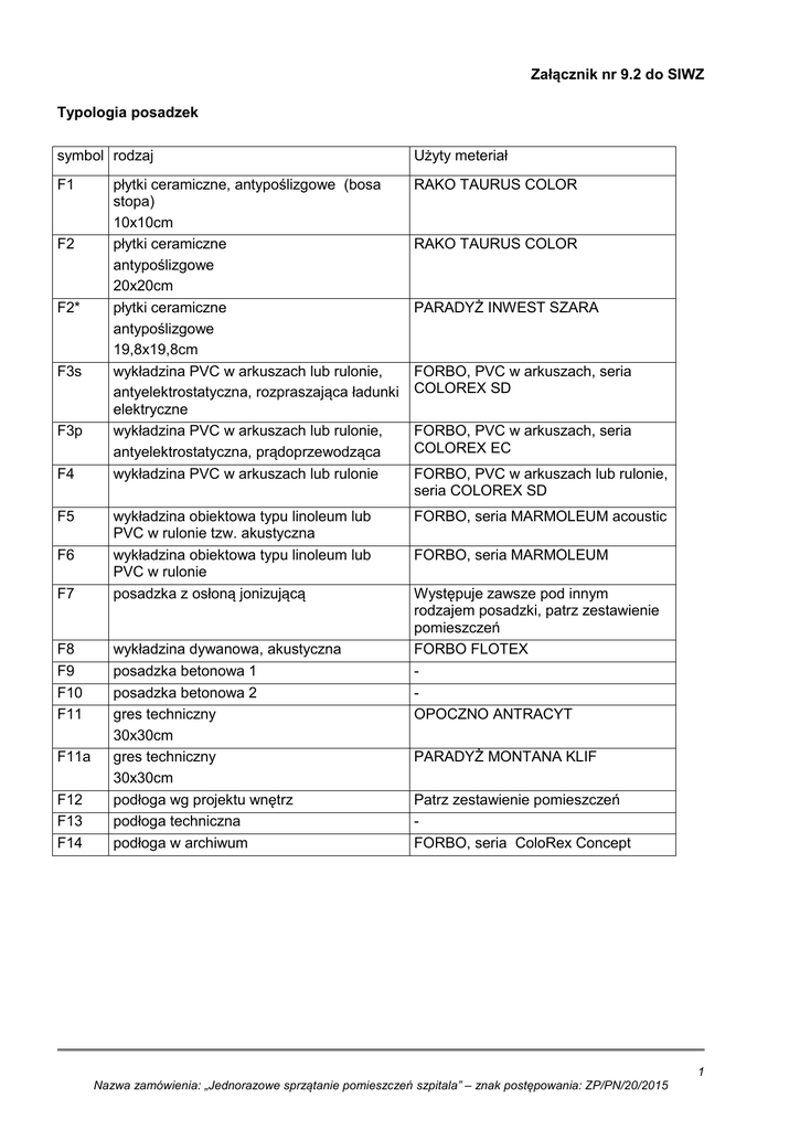 Załącznik nr 9.2 do SIWZ Typologia posadzek symbol rodzaj F1 F2 F2* F3s F3p F4 F5 F6 F7 F8 F9 F10 F11 F11a F12 F13 F14 Użyty meteriał płytki ceramiczne, antypoślizgowe (bosa stopa) 10x10cm płytki ceramiczne antypoślizgowe 20x20cm płytki ceramiczne antypoślizgowe 19,8x19,8cm wykładzina PVC w arkuszach lub rulonie, antyelektrostatyczna, rozpraszająca ładunki elektryczne wykładzina PVC w arkuszach lub rulonie, antyelektrostatyczna, prądoprzewodząca wykładzina PVC w arkuszach lub rulonie RAKO TAURUS COLOR wykładzina obiektowa typu linoleum lub PVC w rulonie tzw. akustyczna wykładzina obiektowa typu linoleum lub PVC w rulonie posadzka z osłoną jonizującą FORBO, seria MARMOLEUM acoustic wykładzina dywanowa, akustyczna posadzka betonowa 1 posadzka betonowa 2 gres techniczny 30x30cm gres techniczny 30x30cm podłoga wg projektu wnętrz podłoga techniczna podłoga w archiwum RAKO TAURUS COLOR PARADYŻ INWEST SZARA FORBO, PVC w arkuszach, seria COLOREX SD FORBO, PVC w arkuszach, seria COLOREX EC FORBO, PVC w arkuszach lub rulonie, seria COLOREX SD FORBO, seria MARMOLEUM Występuje zawsze pod innym rodzajem posadzki, patrz zestawienie pomieszczeń FORBO FLOTEX OPOCZNO ANTRACYT PARADYŻ MONTANA KLIF Patrz zestawienie pomieszczeń FORBO, seria ColoRex Concept 1 Nazwa zamówienia: „Jednorazowe sprzątanie pomieszczeń szpitala” – znak postępowania: ZP/PN/20/2015 F15 F15a F16 F18 F18b F20 F21 płytki ceramiczne – gres szkliwiony 30x30cm płytki ceramiczne – gres szkliwiony 40x40cm gres techniczny30x30cm PARADYŻ REDO BLUE PARADYŻ SEKSTANS GRYS PARADYŻ MONTANA KLIF wylewka, bez warstwy wykończeniowej płytki ceramiczne rektyfikowane 29,8 x 29,8cm płytki ceramiczne rektyfikowane 29,8 x 29,8 cm PARADYŻ TEKSAS wykładzina PCV w rulonie lub płytkach, techniczna beton cementowy c20/50 Forbo, seria SURESTEP ORYGINAL PARADYŻ TEKSAS KLIF - 2 Nazwa zamówienia: „Jednorazowe sprzątanie pomieszczeń szpitala” – znak postępowania: ZP/PN/20/2015 3 Nazwa zamówienia: „Jednorazowe sprzątanie pomieszczeń szpitala” – znak postępowania: ZP/PN/20/2015