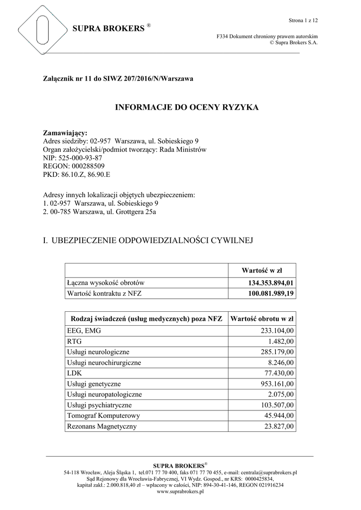 Strona 1 z 12 SUPRA BROKERS ® F334 Dokument chroniony prawem autorskim © Supra Brokers S.A. _____________________________________________________________________________ Załącznik nr 11 do SIWZ 207/2016/N/Warszawa INFORMACJE DO OCENY RYZYKA Zamawiający: Adres siedziby: 02-957 Warszawa, ul. Sobieskiego 9 Organ założycielski/podmiot tworzący: Rada Ministrów NIP: 525-000-93-87 REGON: 000288509 PKD: 86.10.Z, 86.90.E Adresy innych lokalizacji objętych ubezpieczeniem: 1. 02-957 Warszawa, ul. Sobieskiego 9 2. 00-785 Warszawa, ul. Grottgera 25a I. UBEZPIECZENIE ODPOWIEDZIALNOŚCI CYWILNEJ Wartość w zł Łączna wysokość obrotów Wartość kontraktu z NFZ 134.353.894,01 100.081.989,19 Rodzaj świadczeń (usług medycznych) poza NFZ EEG, EMG RTG Usługi neurologiczne Usługi neurochirurgiczne LDK Usługi genetyczne Usługi neuropatologiczne Usługi psychiatryczne Tomograf Komputerowy Rezonans Magnetyczny Wartość obrotu w zł 233.104,00 1.482,00 285.179,00 8.246,00 77.430,00 953.161,00 2.075,00 103.507,00 45.944,00 23.827,00 SUPRA BROKERS® 54-118 Wrocław, Aleja Śląska 1, tel.071 77 70 400, faks 071 77 70 455, e-mail: [email protected] Sąd Rejonowy dla Wrocławia-Fabrycznej, VI Wydz. Gospod., nr KRS: 0000425834, kapitał zakł.: 2.000.818,40 zł – wpłacony w całości, NIP: 894-30-41-146, REGON 021916234 www.suprabrokers.pl Strona 2 z 12 SUPRA BROKERS ® F334 Dokument chroniony prawem autorskim © Supra Brokers S.A. _____________________________________________________________________________ Usługi rehabilitacji neurologicznej USG Doppler Leczenie Uzależnień RAZEM Rezydenci Warsztaty Terapii Zajęciowej RAZEM 4.398,00 4.196,00 8.958,00 1.751.507,00 2.088.302,86 718.624,00 4.558.433,86 Liczba 890 + 108 osób na niepełny etat 107 osób + 20 osób na niepełny etat 15 252 + 8 osób na niepełny etat Pracownicy ogółem Lekarze ogółem Lekarze „kontraktowi” Pielęgniarki ogółem Liczba przyjętych w ostatnim roku pacjentów 61473 8863 Lecznictwo otwarte Lecznictwo zamknięte Oddział Oddział DiagnostycznoTerapeutyczny F-1 Mokotowski Oddział DiagnostycznoTerapeutyczny F-2 Oddział Zapobiegania Nawrotom F10 Mokotowski Ośrodek Terapii w Środowisku Oddział Psychogeriatrii F-4 Oddział Chorób Afektywnych F 7 Ursynowsko-Wilanowski Oddział Diagnostyczno-Terapeutyczny Zamknięty F-5 Otwarty Całodobowy Oddział Diagnostyczno-Terapeutyczny dla zaburzeń depresyjnych, lękowych i zaburzeń snu F-6 Liczba lekarzy kontraktowych Liczba łóżek - 35 - 35 - 25 - - - 30 35 - 35 - 35 SUPRA BROKERS® 54-118 Wrocław, Aleja Śląska 1, tel.071 77 70 400, faks 071 77 70 455, e-mail: [email protected] Sąd Rejonowy dla Wrocławia-Fabrycznej, VI Wydz. Gospod., nr KRS: 0000425834, kapitał zakł.: 2.000.818,40 zł – wpłacony w całości, NIP: 894-30-41-146, REGON 021916234 www.suprabrokers.pl Strona 3 z 12 SUPRA BROKERS ® F334 Dokument chroniony prawem autorskim © Supra Brokers S.A. _____________________________________________________________________________ Otwarty Całodobowy Oddział Terapeutyczny dla wczesnej interwencji i pierwszych epizodów psychozy F-9 Ursynowsko-Wilanowski Ośrodek Dzienny Klinika Psychiatrii Dzieci i Młodzieży Oddział Całodobowy Kliniki Nerwic, Zaburzeń Osobowości i Odżywiania Specjalistyczny Pododdział Leczenia Zaburzeń Odżywiania i Otyłości Oddział Dzienny Kliniki Nerwic, Zaburzeń Osobowości i Odżywiania Oddział Leczenia Zespołów Abstynencyjnych Całodobowy Ośrodek Terapii Uzależnień Oddział Dzienny Terapii Uzależnień Oddział Dzienny Rehabilitacji Psychiatrycznej Oddział Psychiatrii Sądowej o Wzmocnionym Zabezpieczeniu I Klinika Neurologiczna Oddział Ogólny I Klinika Neurologiczna Oddział Udarowy II Klinika Neurologiczna Oddział Ogólny II Klinika Neurologiczna Oddział Udarowy Klinika Neurochirurgii Oddział Rehabilitacji Neurologicznej Oddział Dzienny Rehabilitacji Neurologicznej Izba Przyjęć - 25 - - - 28 - 20 - 12 - - - 35 - 15 - - - - - 60 - 28 - 12 - 27 - 12 8 - 19 40 - - 7 - Sposób organizacji opieki lekarskiej podczas dyżurów: Opiekę lekarską świadczą osoby zatrudnione na umowę o pracę i lekarze kontraktowi. OCENA RYZYKA ZAKAŻEŃ SZPITALNYCH 1 2 W podmiocie leczniczym działa Zespół d/s. Zakażeń Szpitalnych W podmiocie leczniczym rejestrowane są zakażenia szpitalne wszystkie TAK NIE X X SUPRA BROKERS® 54-118 Wrocław, Aleja Śląska 1, tel.071 77 70 400, faks 071 77 70 455, e-mail: [email protected] Sąd Rejonowy dla Wrocławia-Fabrycznej, VI Wydz. Gospod., nr KRS: 0000425834, kapitał zakł.: 2.000.818,40 zł – wpłacony w całości, NIP: 894-30-41-146, REGON 021916234 www.suprabrokers.pl Strona 4 z 12 SUPRA BROKERS ® F334 Dokument chroniony prawem autorskim © Supra Brokers S.A. _____________________________________________________________________________ 3 4 5 6 7 8 9 10 11 12 13 14 wybiórczo Liczba stwierdzanych rocznie zakażeń szpitalnych krwiopochodnych (wzw B, wzw C, hiv) gronkowca innych Podmiot leczniczy zgłasza do Sanepid zakażenia szpitalne/choroby zakaźne wszystkie krwiopochodne Podmiot leczniczy posiada centralną sterylizatornię W podmiocie leczniczym używane są sterylizatory narzędzi na suche, gorące powietrze Prowadzona jest wewnętrzna kontrola procesów sterylizacji Testy używane do kontroli procesów sterylizacji i pracy sterylizatorów: wskaźniki fizyczne wydruk komputerowy testy Bowie-Dicka testy paskowe testy zintegrowane testy biologiczne Używane są puszki Schimmelbuscha jako opakowania do sterylizacji Inne opakowania używane do sterylizacji puszki kontenerowe rękawy papierowo – foliowe inne Do mycia rąk używane jest mydło w: dozownikach kostkach Do dezynfekcji rąk używany jest środek dezynfekcyjny w dozownikach Cały personel poddawany jest szkoleniom z zakresu zapobiegania infekcjom szkolenie tylko przy przyjęciu do pracy systematycznie W podmiocie leczniczym opracowane są następujące procedury postępowania mycia i dezynfekcji rąk 0