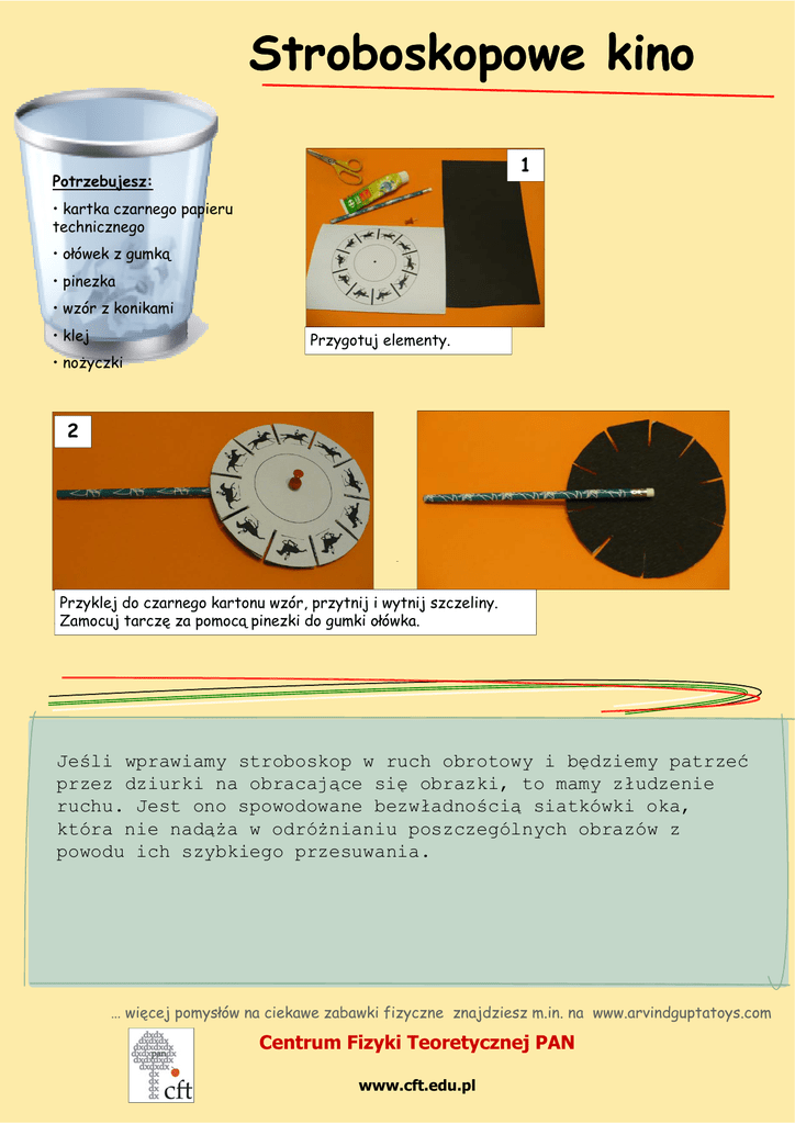Stroboskopowe kino 1 Potrzebujesz: • kartka czarnego papieru technicznego • ołówek łó k z gumką k • pinezka • wzór z konikami • klej Przygotuj elementy. • nożyczki 2 − Przyklej do czarnego kartonu wzór, przytnij i wytnij szczeliny. Zamocuj tarczę za pomocą pinezki do gumki ołówka. ołówka Jeśli wprawiamy stroboskop w ruch obrotowy i będziemy patrzeć przez dziurki na obracające się obrazki, to mamy złudzenie ruchu. Jest ono spowodowane bezwładnością siatkówki oka, która nie nadąża w odróżnianiu poszczególnych obrazów z powodu ich szybkiego przesuwania. … więcej pomysłów na ciekawe zabawki fizyczne znajdziesz m.in. na www.arvindguptatoys.com Centrum Fizyki Teoretycznej PAN www.cft.edu.pl