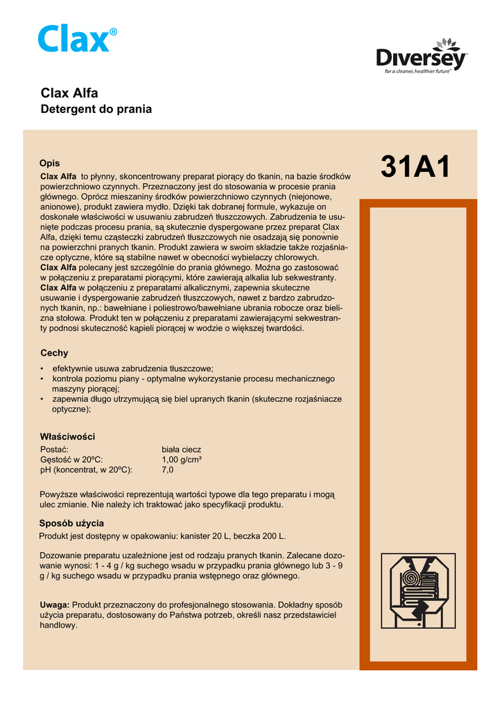 Clax Alfa Detergent do prania Opis Clax Alfa to płynny, skoncentrowany preparat piorący do tkanin, na bazie środków powierzchniowo czynnych. Przeznaczony jest do stosowania w procesie prania głównego. Oprócz mieszaniny środków powierzchniowo czynnych (niejonowe, anionowe), produkt zawiera mydło. Dzięki tak dobranej formule, wykazuje on doskonałe właściwości w usuwaniu zabrudzeń tłuszczowych. Zabrudzenia te usunięte podczas procesu prania, są skutecznie dyspergowane przez preparat Clax Alfa, dzięki temu cząsteczki zabrudzeń tłuszczowych nie osadzają się ponownie na powierzchni pranych tkanin. Produkt zawiera w swoim składzie także rozjaśniacze optyczne, które są stabilne nawet w obecności wybielaczy chlorowych. Clax Alfa polecany jest szczególnie do prania głównego. Można go zastosować w połączeniu z preparatami piorącymi, które zawierają alkalia lub sekwestranty. Clax Alfa w połączeniu z preparatami alkalicznymi, zapewnia skuteczne usuwanie i dyspergowanie zabrudzeń tłuszczowych, nawet z bardzo zabrudzonych tkanin, np.: bawełniane i poliestrowo/bawełniane ubrania robocze oraz bielizna stołowa. Produkt ten w połączeniu z preparatami zawierającymi sekwestranty podnosi skuteczność kąpieli piorącej w wodzie o większej twardości. Cechy • • • efektywnie usuwa zabrudzenia tłuszczowe; kontrola poziomu piany - optymalne wykorzystanie procesu mechanicznego maszyny piorącej; zapewnia długo utrzymującą się biel upranych tkanin (skuteczne rozjaśniacze optyczne); Właściwości Postać: Gęstość w 20ºC: pH (koncentrat, w 20ºC): biała ciecz 1,00 g/cm³ 7,0 Powyższe właściwości reprezentują wartości typowe dla tego preparatu i mogą ulec zmianie. Nie należy ich traktować jako specyfikacji produktu. Sposób użycia Produkt jest dostępny w opakowaniu: kanister 20 L, beczka 200 L. Dozowanie preparatu uzależnione jest od rodzaju pranych tkanin. Zalecane dozowanie wynosi: 1 - 4 g / kg suchego wsadu w przypadku prania głównego lub 3 - 9 g / kg suchego wsadu w przypadku prania wstępnego oraz głównego. Uwaga: Produkt przeznaczony do profesjonalnego stosowania. Dokładny sposób użycia preparatu, dostosowany do Państwa potrzeb, określi nasz przedstawiciel handlowy. 31A1 Clax Alfa 31A1 Postępowanie z odpadami Zapobiegać przedostawaniu się większych ilości produktu do ścieków, wód powierzchniowych i wód gruntowych. Niewielkie ilości niewykorzystanego produktu rozcieńczyć wodą do stężenia najwyżej 1%, odprowadzać do kanalizacji. Większe ilości przekazywać do utylizacji specjalistycznej firmie. Opróżnione opakowania przepłukać dwukrotnie wypłukać wodą i przeznaczyć do recyklingu. Okres trwałości 2 lata od daty produkcji (data produkcji na opakowaniu). Warunki przechowywania Magazynować w pozycji pionowej, wyłącznie w oryginalnych, szczelnych i właściwie oznakowanych opakowaniach, w suchych i odpowiednio wentylowanych pomieszczeniach. Nie przechowywać poniżej 10°C i w wysokich temperaturach. Przechowywać z dala od źródeł ciepła, nie wystawiać na bezpośrednie działanie promieni słonecznych. Przechowywać z dala od żywności, napojów i pasz. Środki ostrożności i pierwsza pomoc Po użyciu opłukać i wysuszyć ręce. W przypadku długotrwałego kontaktu ochrona skóry może być konieczna. Nosić ściśle przylegające okulary ochronne lub ochronę twarzy. • Podczas stosowania preparatu unikać wdychania oparów i aerozoli, w przypadku narażenia zapewnić dostęp świeżego powietrza, a w razie wystąpienia dolegliwości zapewnić pomoc lekarską. • Podczas pracy z preparatem unikać zanieczyszczenia oczu i skóry. W przypadku polania się stężonym produktem, natychmiast zdjąć zanieczyszczoną odzież, skórę zmyć wodą. W razie wystąpienia podrażnienia, zapewnić pomoc lekarską. • Zanieczyszczone oczy płukać z otwartą powieką przez kilka minut pod bieżącą wodą i zapewnić pomoc lekarską. • W przypadku połknięcia wypłukać usta wodą, pić duże ilości wody. W przypadku nieustępujących dolegliwości zasięgnąć porady lekarskiej. Dodatkowe informacje odnośnie do środków ostrożności wymaganych przy pracy z preparatem Clax Alfa 31A1 znajdują się w karcie charakterystyki. Diversey Polska Sp. z o.o. ul. Fabryczna 5 00-446 Warszawa Tel.: 22 328 10 00 Fax: 22 328 10 01 www.diversey.com © Copyright 2013 Diversey 2