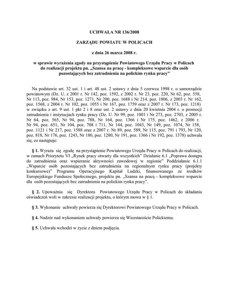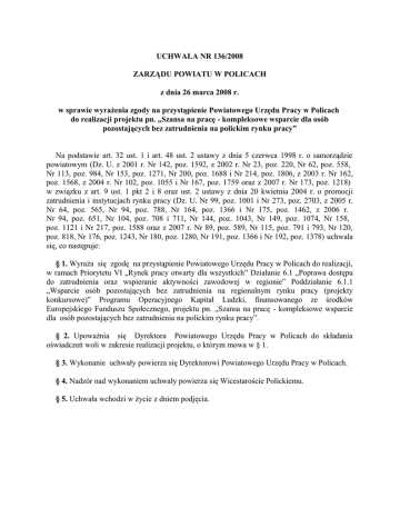 UCHWAŁA NR 136/2008 ZARZĄDU POWIATU W POLICACH z dnia 26 marca 2008 r. w sprawie wyrażenia zgody na przystąpienie Powiatowego Urzędu Pracy w Policach do realizacji projektu pn. „Szansa na pracę - kompleksowe wsparcie dla osób pozostających bez zatrudnienia na polickim rynku pracy” Na podstawie art. 32 ust. 1 i art. 48 ust. 2 ustawy z dnia 5 czerwca 1998 r. o samorządzie powiatowym (Dz. U. z 2001 r. Nr 142, poz. 1592, z 2002 r. Nr 23, poz. 220, Nr 62, poz. 558, Nr 113, poz. 984, Nr 153, poz. 1271, Nr 200, poz. 1688 i Nr 214, poz. 1806, z 2003 r. Nr 162, poz. 1568, z 2004 r. Nr 102, poz. 1055 i Nr 167, poz. 1759 oraz z 2007 r. Nr 173, poz. 1218) w związku z art. 9 ust. 1 pkt 2 i 8 oraz ust. 2 ustawy z dnia 20 kwietnia 2004 r. o promocji zatrudnienia i instytucjach rynku pracy (Dz. U. Nr 99, poz. 1001 i Nr 273, poz. 2703, z 2005 r. Nr 64, poz. 565, Nr 94, poz. 788, Nr 164, poz. 1366 i Nr 175, poz. 1462, z 2006 r. Nr 94, poz. 651, Nr 104, poz. 708 i 711, Nr 144, poz. 1043, Nr 149, poz. 1074, Nr 158, poz. 1121 i Nr 217, poz. 1588 oraz z 2007 r. Nr 89, poz. 589, Nr 115, poz. 791 i 793, Nr 120, poz. 818, Nr 176, poz. 1243, Nr 180, poz. 1280, Nr 191, poz. 1366 i Nr 192, poz. 1378) uchwala się, co następuje: § 1. Wyraża się zgodę na przystąpienie Powiatowego Urzędu Pracy w Policach do realizacji, w ramach Priorytetu VI „Rynek pracy otwarty dla wszystkich” Działanie 6.1 „Poprawa dostępu do zatrudnienia oraz wspieranie aktywności zawodowej w regionie” Poddziałanie 6.1.1 „Wsparcie osób pozostających bez zatrudnienia na regionalnym rynku pracy (projekty konkursowe)” Programu Operacyjnego Kapitał Ludzki, finansowanego ze środków Europejskiego Funduszu Społecznego, projektu pn. „Szansa na pracę - kompleksowe wsparcie dla osób pozostających bez zatrudnienia na polickim rynku pracy”. § 2. Upoważnia się Dyrektora Powiatowego Urzędu Pracy w Policach do składania oświadczeń woli w zakresie realizacji projektu, o którym mowa w § 1. § 3. Wykonanie uchwały powierza się Dyrektorowi Powiatowego Urzędu Pracy w Policach. § 4. Nadzór nad wykonaniem uchwały powierza się Wicestaroście Polickiemu. § 5. Uchwała wchodzi w życie z dniem podjęcia. Uzasadnienie. Projekt uchwały przedkłada Wicestarosta Policki w trybie § 62 ust. 1 Statutu Powiatu Polickiego. Przepisy art. 32 ust. 1 i art. 48 ust. 2 ustawy z dnia 5 czerwca 1998 r. o samorządzie powiatowym (Dz. U. z 2001 r. Nr 142, poz. 1592 z późn. zm.) stanowią odpowiednio, że: 1) zarząd powiatu wykonuje uchwały rady powiatu i zadania powiatu określone przepisami prawa; 2) zarząd może upoważnić pracowników starostwa, kierowników powiatowych służb, inspekcji i straży oraz jednostek organizacyjnych powiatu do składania oświadczeń woli związanych z prowadzeniem bieżącej działalności powiatu. Natomiast zgodnie z art. 9 ust. 1 pkt 2 i 8 oraz ust. 2 ustawy z dnia 20 kwietnia 2004 r. o promocji zatrudnienia i instytucjach rynku pracy (Dz. U. Nr 99, poz. 1001 z późn. zm.), zwanej dalej „ustawą”, do zadań samorządu powiatu w zakresie polityki rynku pracy należy pozyskiwanie i gospodarowanie środkami finansowymi na realizację zadań z zakresu aktywizacji lokalnego rynku pracy oraz inicjowanie, organizowanie i finansowanie projektów lokalnych i innych działań na rzecz aktywizacji bezrobotnych, przy czym zadania te są wykonywane przez powiatowe urzędy pracy wchodzące w skład powiatowej administracji zespolonej. Pismem znak PUP/V/4310-1/7/RP/08 z dnia 20 marca 2008 r. Dyrektor Powiatowego Urzędu Pracy w Policach zwrócił się do Zarządu Powiatu w Policach z wnioskiem o wyrażenie zgody na przystąpienie Powiatowego Urzędu Pracy w Policach do realizacji projektu pn. „Szansa na pracę - kompleksowe wsparcie dla osób pozostających bez zatrudnienia na polickim rynku pracy”. Projekt pn. „Szansa na pracę - kompleksowe wsparcie dla osób pozostających bez zatrudnienia na polickim rynku pracy” będzie realizowany w ramach Priorytetu VI „Rynek pracy otwarty dla wszystkich” Działanie 6.1 „Poprawa dostępu do zatrudnienia oraz wspieranie aktywności zawodowej w regionie” Poddziałanie 6.1.1 „Wsparcie osób pozostających bez zatrudnienia na regionalnym rynku pracy (projekty konkursowe)” Programu Operacyjnego Kapitał Ludzki, finansowanego ze środków Europejskiego Funduszu Społecznego. Instytucją ogłaszającą nabór wniosków w zakresie, o którym mowa powyżej, jest Wojewódzki Urząd Pracy z siedzibą w Szczecinie przy ul. A. Mickiewicza 41. Termin składania wniosków w ramach powyżej przywołanego priorytetu, działania i poddziałania, upływa 7 kwietnia 2008 r. Celem ww. projektu jest wsparcie osób długotrwale bezrobotnych, zarejestrowanych w Powiatowym Urzędzie Pracy w Policach i pomoc im w powrocie na rynek pracy. Cel ten zostanie osiągnięty dzięki realizacji poniższych celów szczegółowych: 1) aktywizacja zawodowa, poprzez wsparcie w postaci pośrednictwa pracy i poradnictwa zawodowego; 2) organizacja kampanii promocyjnych i akcji informacyjnych mających na celu zachęcenie pracodawców do zatrudnienia osób z grup znajdujących się w szczególnej sytuacji na rynku pracy; 3) prowadzenie, publikowanie i upowszechnianie badań i analiz dotyczących sytuacji na regionalnym i lokalnym rynku pracy, w tym m.in. tworzenie regionalnych obserwatoriów rynku pracy oraz monitoring migracji zarobkowej na terenie regionu. Wsparciem w ramach projektu zostaną objętych 300 osób bezrobotnych zarejestrowanych w Powiatowym Urzędzie Pracy w Policach powyżej 12 miesięcy. Kryterium dodatkowym, które będzie decydowało o udziale w projekcie, jest sytuacja osoby bezrobotnej na rynku pracy, w związku z czym wsparciem zostaną objęte w szczególności osoby po 45 roku życia, osoby młode do 25 roku życia pozostające bez zatrudnienia oraz kobiety. W niniejszym przedsięwzięciu planowana jest realizacja trzech podstawowych modułów projek