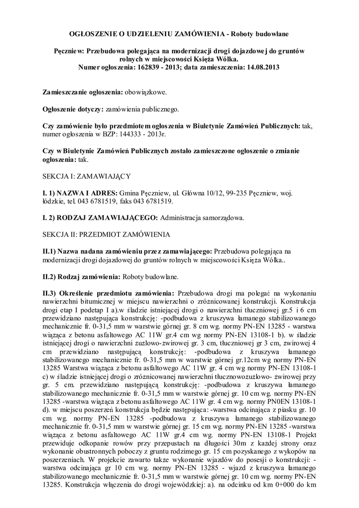 OGŁOSZENIE O UDZIELENIU ZAMÓWIENIA - Roboty budowlane Pęcznie w: Przebudowa polegająca na modernizacji drogi dojazdowe j do gruntów rolnych w miejscowości Księża Wólka. Numer ogłos zenia: 162839 - 2013; data zamieszczenia: 14.08.2013 Zamieszczanie ogłoszenia: obowiązkowe. Ogłoszenie dotyczy: zamówienia publicznego. Czy zamówienie było przedmiote m ogłos zenia w Biuletynie Zamówień Publicznych: tak, numer ogłoszenia w BZP: 144333 - 2013r. Czy w Biuletynie Zamówień Publicznych zostało zamieszczone ogłoszenie o zmianie ogłoszenia: tak. SEKCJA I: ZAMAWIAJĄCY I. 1) NAZWA I ADRES: Gmina Pęczniew, ul. Główna 10/12, 99-235 Pęczniew, woj. łódzkie, tel. 043 6781519, faks 043 6781519. I. 2) RODZAJ ZAMAWIAJĄCEGO: Administracja samorządowa. SEKCJA II: PRZEDMIOT ZAMÓWIENIA II.1) Nazwa nadana zamówieniu prze z zamawiającego: Przebudowa polegająca na modernizacji drogi dojazdowej do gruntów rolnych w miejscowości Księża Wólka.. II.2) Rodzaj zamówienia: Roboty budowlane. II.3) Określenie przedmiotu zamówienia: Przebudowa drogi ma polegać na wykonaniu nawierzchni bitumicznej w miejscu nawierzchni o zróżnicowanej konstrukcji. Konstrukcja drogi etap I podetap I a).w śladzie istniejącej drogi o nawierzchni tłuczniowej gr.5 i 6 cm przewidziano następująca konstrukcję: -podbudowa z kruszywa łamanego stabilizowanego mechanicznie fr. 0-31,5 mm w warstwie górnej gr. 8 cm wg. normy PN-EN 13285 - warstwa wiążąca z betonu asfaltowego AC 11W gr.4 cm wg normy PN-EN 13108-1 b). w śladzie istniejącej drogi o nawierzchni żużlowo- żwirowej gr. 3 cm, tłuczniowej gr 3 cm, żwirowej 4 cm przewidziano następującą konstrukcję: -podbudowa z kruszywa łamanego stabilizowanego mechanicznie fr. 0-31,5 mm w warstwie górnej gr.12cm wg normy PN-EN 13285 Warstwa wiążąca z betonu asfaltowego AC 11W gr. 4 cm wg normy PN-EN 13108-1 c) w śladzie istniejącej drogi o zróżnicowanej nawierzchni tłucznowożużlowo- żwirowej przy gr. 5 cm. przewidziano następującą konstrukcję: -podbudowa z kruszywa łamanego stabilizowanego mechanicznie fr. 0-31,5 mm w warstwie górnej gr. 10 cm wg. normy PN-EN 13285 -warstwa wiążąca z betonu asfaltowego AC 11W gr. 4 cm wg. normy PN0EN 13108-1 d). w miejscu poszerzeń konstrukcja będzie następująca: -warstwa odcinająca z piasku gr. 10 cm wg. normy PN-EN 13285 -podbudowa z kruszywa łamanego stabilizowanego mechanicznie fr. 0-31,5 mm w warstwie górnej gr. 15 cm wg. normy PN-EN 13285 -warstwa wiążąca z betonu asfaltowego AC 11W gr.4 cm wg. normy PN-EN 13108-1 Projekt przewiduje odkopanie rowów przy przepustach na długości 30m z każdej strony oraz wykonanie obustronnych poboczy z gruntu rodzimego gr. 15 cm pozyskanego z wykopów na poszerzeniach. W projekcie zawarto także wykonanie wjazdów do posesji o konstrukcji: warstwa odcinająca gr 10 cm wg. normy PN-EN 13285 - wjazd z kruszywa łamanego stabilizowanego mechanicznie fr. 0-31,5 mm w warstwie górnej gr. 10 cm wg. normy PN-EN 13285. Konstrukcja włączenia do drogi wojewódzkiej: a). na odcinku od km 0+000 do km 0+025 -warstwa odcinająca z piasku gr. 15cm wg normy PN-EN 13285 -podbudowa z kruszywa łamanego stabilizowanego mechanicznie fr. 0-31,5 mm gr. 20 cm wg normy PNEN 13285 -podbudowa z betonu asfaltowego AC 22P gr 7 cm wg. normy PN-EN 13108-1 warstwa wiążąca z betonu asfaltowego AC 16W gr. 6cm wg normy PN-EN 13108-1 -warstwa ścieralna z betonu asfaltowego AC 11S gr. 5 cm wg normy PN-EN 13108-1 b). na odcinku od km 0+025 do km 0+045 - podbudowa z kruszywa łamanego stabilizowanego mechanicznie fr. 0-31,5 mm w warstwie górnej gr. 10 cm wg normy PN-EN 13285 - warstwa ścieralna z betonu asfaltowego AC 11S gr 5 cm wg normy PN-EN 13108-1 - warstwa ścieralna z betonu asfaltowego AC 8S gr 3 cm wg normy PN-EN 13108-1 c). konstrukcja poszerzeń będzie obejmować: -warstwa odcinająca z piasku gr 15cm wg normy PN-EN 13285 - podbudowa z kruszywa łamanego stabilizowanego mechanicznie fr. 0-31,5 mm w warstwie górnej gr 15 cm wg normy PN-EN 13285 -warstwa ścieralna z betonu asfaltowego BA 0/12 mm gr. 5cm AC 11S gr. 5 cm wg normy PN-EN 13108-1 -warstwa ścieralna z betonu asfaltowego AC 8S gr. 3 cm wg normy PN-EN 13108-1 Projekt przewiduje także odkopanie rowów przy przepuście na długości 30 m z każdej strony oraz wykonanie obustronnych poboczy z kruszywa łamanego stabilizowanego mechanicznie gr. 10 cm wg normy PN-EN 13285. II.4) Wspólny Słownik Zamówie ń (CPV): 45.00.00.00-7, 45.23.32.20-7. SEKCJA III: PROCEDURA III.1) TRYB UDZIELENIA ZAMÓWIENIA: Przetarg nieograniczony III.2) INFORMACJE ADMINISTRACYJNE • Zamówienie dotyczy projektu/programu finansowanego ze środków Unii Europejskiej: nie SEKCJA IV: UDZIELENIE ZAMÓWIENIA IV.1) DATA UDZIELENIA ZAMÓWIENIA: 14.08.2013. IV.2) LICZBA OTRZYMANYCH OFERT: 4. IV.3) LICZBA ODRZUCONYCH OFERT: 0. IV.4) NAZWA I ADRES WYKONAWCY, KTÓREMU UDZIELONO ZAMÓWIENIA: • MARKBUD Spółka z o.o., ul. Targowa 7, 99-235 Poddębice, kraj/woj. łódzkie. IV.5) Szacunkowa wartość zamówienia (bez VAT): 345795,78 PLN. IV.6) INFORMACJA O CENIE WYBRANEJ OFERTY ORAZ O OFERTACH Z NAJNIŻSZĄ I NAJWYŻSZĄ CENĄ • • • Cena wybranej oferty: 373483,77 Oferta z najniższą ceną: 373483,77 / Oferta z najwyższą ceną: 416964,59 Waluta: PLN. Wójt Gminy Pęczniew /-/ Marcin Janiak