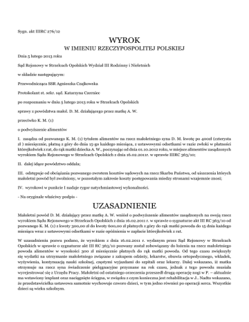 Sygn. akt IIIRC 276/12 WYROK W IMIENIU RZECZYPOSPOLITEJ POLSKIEJ Dnia 5 lutego 2013 roku Sąd Rejonowy w Strzelcach Opolskich Wydział III Rodzinny i Nieletnich w składzie następującym: Przewodnicząca SSR Agnieszka Czajkowska Protokolant st. sekr. sąd. Katarzyna Czerniec po rozpoznaniu w dniu 5 lutego 2013 roku w Strzelcach Opolskich sprawy z powództwa małol. D. M. działającego przez matkę A. W. przeciwko K. M. (1) o podwyższenie alimentów I. zasądza od pozwanego K. M. (1) tytułem alimentów na rzecz małoletniego syna D. M. kwotę po 400zł (czterysta zł ) miesięcznie, płatną z góry do dnia 15-go każdego miesiąca, z ustawowymi odsetkami w razie zwłoki w płatności którejkolwiek z rat, do rąk matki dziecka A. W., poczynając od dnia 01.10.2012 roku, w miejsce alimentów zasądzonych wyrokiem Sądu Rejonowego w Strzelcach Opolskich z dnia 16.02.2011r. w sprawie IIIRC 363/10; II. dalej idące powództwo oddala; III. odstępuje od obciążania pozwanego zwrotem kosztów sądowych na rzecz Skarbu Państwa, od uiszczenia których małoletni powód był zwolniony, w pozostałym zakresie koszty postępowania miedzy stronami wzajemnie znosi; IV. wyrokowi w punkcie I nadaje rygor natychmiastowej wykonalności. - Na oryginale właściwy podpis - UZASADNIENIE Małoletni powód D. M. działający przez matkę A. W. wniósł o podwyższenie alimentów zasądzonych na swoją rzecz wyrokiem Sądu Rejonowego w Strzelcach Opolskich z dnia 16.02.2011 r. w sprawie o sygnaturze akt III RC 363/10 od pozwanego K. M. (1) z kwoty 300,00 zł do kwoty 600,00 zł płatnych z góry do rąk matki powoda do 15 dnia każdego miesiąca wraz z ustawowymi odsetkami w razie opóźnienia w zapłacie którejkolwiek z rat. W uzasadnieniu pozwu podano, że wyrokiem z dnia 16.02.2011 r. wydanym przez Sąd Rejonowy w Strzelcach Opolskich w sprawie o sygnaturze akt III RC 363/10 pozwany został zobowiązany do łożenia na rzecz małoletniego powoda alimentów w wysokości 300 zł miesięcznie płatnych do rąk matki powoda. Od tego czasu zwiększyły się wydatki na utrzymanie małoletniego związane z zakupem odzieży, lekarstw, obuwia ortopedycznego, wkładek, wyżywienia, kontynuacją nauki szkolnej, częstymi wyjazdami do szpitali oraz lekarzy. Dalej wskazano, iż matka otrzymuje na rzecz syna świadczenie pielęgnacyjne przyznane na rok czasu, jednak z tego powodu musiała wyrejestrować się z Urzędu Pracy. Małoletni od ostatniego orzeczenia przeszedł drugą operację nogi w P. – aktualnie ma wstawiony implant oraz naciągnięte ścięgna, w związku z czym konieczna jest rehabilitacja w J.. Nadto wskazano, że przedstawicielka ustawowa samotnie wychowuje czworo dzieci, w tym jedno również po operacji serca. Wszystkie dzieci są wieku szkolnym. Na rozprawie w dniu 14.12.2012 r. i w piśmie procesowym z dnia 18.12.2012 r. strona powodowa podtrzymała swoje stanowisko w sprawie. Pozwany K. M. (1) reprezentowany przez profesjonalnego pełnomocnika procesowego w odpowiedzi na pozew wniósł o oddalenie powództwa w całości. Wskazał, że od czasu zasądzenia alimentów w kwocie 300,00 zł minęło zaledwie 2 lata i zgodnie z zasadami doświadczenia życiowego koszty utrzymania dziecka nie wzrastają w tak krótkim okresie czasu aż o 100 %, a nadto że powódka nie udowodniła prawdziwości swoich twierdzeń w zakresie faktycznie ponoszonych kosztów utrzymania małoletniego. Podniesiono również, że na pozwanym ciąży obowiązek alimentacyjny wobec małoletniego D., tak więc problemy finansowe przedstawicielki ustawowej związane z utrzymaniem jej pozostałych dzieci nie stanowią przesłanki do podwyższenia alimentów na rzecz małoletniego powoda. Zdaniem pozwanego, przedstawicielka ustawowa w związku z zaliczeniem małoletniego do osób niepełnosprawnych ma prawo do otrzymywania od „państwa” kwoty ok. 850,00 zł miesięcznie na jego utrzymanie (świadczenie pielęgnacyjne – 520 zł, zasiłek pielęgnacyjny 153 zł, zasiłek rodzinny 91 zł, dodatek z tytułu kształcenia i rehabilitacji dziecka niepełnosprawnego 80 zł, dodatek z tytuł rozpoczęcia nauki – jednorazowo 100 zł). Nadto, iż można uzyskać dofinansowanie na zakup obuwia ortopedycznego z PFRON. W związku z powyższym wniesiono o zobowiązanie przedstawicielki ustawowej do przedłożenia zaświadczeń o wysokości wszystkich dochodów rodziny. Niezależnie podniesiono, iż żądanie kwoty 600 zl tytułem alimentów przekracza możliwości majątkowe pozwanego. Jego miesięczne wynagrodzenie wynosi ok. 2.600,00 zł netto (w okresie styczeń – marzec 1.800,00 zł netto). Na jego utrzymaniu pozostaje 8 letnia córka oraz bezrobotna konkubina. Córka pozwanego ma stwierdzoną skoliozę, co wymaga specjalistycznego leczenia i zabiegów fizjoterapeutycznych. Miesięczne średnie wydatki związane z utrzymaniem domu i rodziny wynoszą ok. 2.533,40 zł (alimenty, czynsz, woda, prąd, gaz, wyżywienie, dojazdy do pracy, koszty utrzymania córki, spłata dwóch kredytów zaciągniętych na zakup opału oraz naprawienia szkód wyrządzonych uderzeniem pioruna, środki higieny, przejazdy środkami komunikacji miejskiej, cyfrowy Polsat, dwa telefony komórkowe). Pozwany nie posiada oszczędności, papierów wartościowych. Jednocześnie wskazano, że pozwany skłonny jest ugodowo zakończyć postępowanie, po uzyskaniu informacji jakimi kwotami przedstawicielka ustawowa rzeczywiście dysponuje – w szczególności w zakresie zasiłków i dofinansowań. W piśmie procesowym z dnia 28.12.2012 r. podtrzymano stanowisko pozwanego. Jednocześnie wskazano, iż przedstawicielka ustawowa tytułem alimentów i zasiłków dysponuje na małoletniego D. M. kwota 803,16 zł, P. W. kwotą 670,00 zł, S. W. kwotą 983,16 zł, J. W. kwotę 750,00 zł. Dodatkowo otrzymuje świadczenie pielęgnacyjne w kwocie 520,00 zł wraz z dodatkiem w kwocie 100,00 zł i dodatkiem do zasiłku rodzinnego w kwocie 33 zł miesięcznie – łącznie o