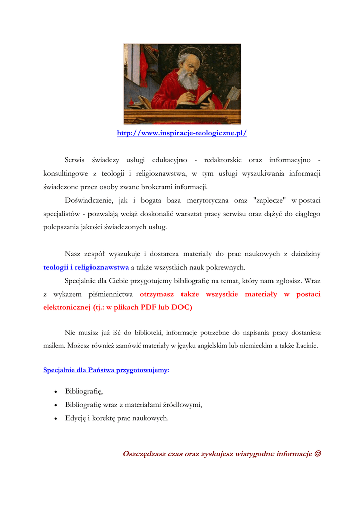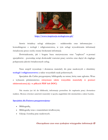 http://www.inspiracje-teologiczne.pl/ Serwis świadczy usługi edukacyjno - redaktorskie oraz informacyjno konsultingowe z teologii i religioznawstwa, w tym usługi wyszukiwania informacji świadczone przez osoby zwane brokerami informacji. Doświadczenie, jak i bogata baza merytoryczna oraz "zaplecze" w postaci specjalistów - pozwalają wciąż doskonalić warsztat pracy serwisu oraz dążyć do ciągłego polepszania jakości świadczonych usług. Nasz zespół wyszukuje i dostarcza materiały do prac naukowych z dziedziny teologii i religioznawstwa a także wszystkich nauk pokrewnych. Specjalnie dla Ciebie przygotujemy bibliografię na temat, który nam zgłosisz. Wraz z wykazem piśmiennictwa otrzymasz także wszystkie materiały w postaci elektronicznej (tj.: w plikach PDF lub DOC) Nie musisz już iść do biblioteki, informacje potrzebne do napisania pracy dostaniesz mailem. Możesz również zamówić materiały w języku angielskim lub niemieckim a także Łacinie. Specjalnie dla Państwa przygotowujemy: Bibliografię, Bibliografię wraz z materiałami źródłowymi, Edycję i korektę prac naukowych. Oszczędzasz czas oraz zyskujesz wiarygodne informacje Bibliografie i materiały do: Prace Habilitacyjn e, Prace Doktorskie (dysertacje), Prace Dyplomowe, Prace Magisterskie, Prace Licen cjackie, Prace Zaliczeniowe, Semestraln e, Uzupełniające, i inne nie wymienion e j.w. Źródłami informacji (polskich jak i zagranicznych) są dla nas: archiwa, płatne i bezpłatn e bazy danych, biblio grafie, biblioteki, czasopisma branżowe (specjalistyczn e), fora internetowe, grup y dyskusyjne, informatory, konferen cje, literatura fachowa, ośrodki in formacji, prasa, radio, telewizja, periodyki branżowo - naukowe sieć Internet (najbardziej ta „ukryta”), wywiady i konsultacje ze specjalistami. Teologia (z języka greckiego "theologeia" - mówienie o Bogu), w znaczeniu religioznawczym część doktryny religijnej zajmująca się określeniem natury Boga (lub bogów) oraz jego stosunku do świata i człowieka. W znaczeniu węższym, wywiedzionym z chrześcijaństwa, przedmiotem teologii jest wyciąganie wniosków rozumowych z dogmatów (prawd objawionych). W tym znaczeniu odnosi się ona do wszystkich religii uniwersalistycznych, zajmując się także systematyzowaniem, wyjaśnianiem, ustalaniem oraz uzasadnianiem treści pism świętych i tradycji religijnej oraz refleksją nad nimi. Rozwój teologii związany jest historycznie z powstaniem i rozwojem stanu kapłańskiego. Dokonał się szczególnie w wielkich religiach uniwersalistycznych. Teologia chrześcijańska, dzieli się na dwa ogólne działy: 1) teologię systematyczną, obejmującą teologię teoretyczną, oraz teologię praktyczną. Na teologię teoretyczną składają się: apologetyka, uzasadniająca prawdy wiary, oraz dogmatyka, zajmująca się analizą treści prawd objawionych, 2) teologię historyczną, która obejmuje m.in.: biblistykę, teologię patrystyczną, archeologię biblijną, historię Kościoła, teologię pastoralną. Religioznawstwo, nauka o pochodzeniu, formach, strukturze i funkcji religii. Opisuje religie w aspekcie doktryny, kultu, grup wyznawców i przeżyć religijnych. Dzieli się na: religioznawstwo ogólne, historię religii, religioznawstwo porównawcze, socjologię, psychologię i antropologię. lub zespół nauk o religii, których podejście - w odróżnieniu od teologii i do filozofii religii - charakteryzuje się antropologicznym, empirycznym, a więc porównawczym stosunkiem do przedmiotu badań. Zapraszamy do kontaktu z nami: http://w w w . ins pirac je -te ologic z ne .pl kontakt@ins pirac je -te ologic z ne .pl +4 8 .. 5 1 6 -9 6 2 -6 6 6 Nasz doświadczony konsultant naukowy skontaktuje się z Państwem w celu dokładniejszego rozpoznania i sprecyzowania Państwa potrzeb i życzeń. A wdrożony system CRM (zarządzania obsługa klienta) a także zinformatyzowany obieg informacji pozwalają na szybka reakcję ze strony serwisu na zapytanie klienta oraz właściwe dopasowanie oferty do jego potrzeb;