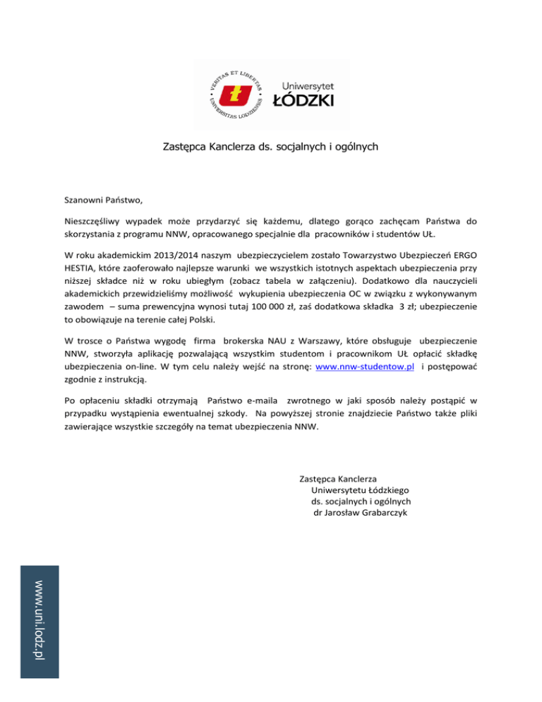 Zastępca Kanclerza ds. socjalnych i ogólnych Szanowni Państwo, Nieszczęśliwy wypadek może przydarzyć się każdemu, dlatego gorąco zachęcam Państwa do skorzystania z programu NNW, opracowanego specjalnie dla pracowników i studentów UŁ. W roku akademickim 2013/2014 naszym ubezpieczycielem zostało Towarzystwo Ubezpieczeń ERGO HESTIA, które zaoferowało najlepsze warunki we wszystkich istotnych aspektach ubezpieczenia przy niższej składce niż w roku ubiegłym (zobacz tabela w załączeniu). Dodatkowo dla nauczycieli akademickich przewidzieliśmy możliwość wykupienia ubezpieczenia OC w związku z wykonywanym zawodem – suma prewencyjna wynosi tutaj 100 000 zł, zaś dodatkowa składka 3 zł; ubezpieczenie to obowiązuje na terenie całej Polski. W trosce o Państwa wygodę firma brokerska NAU z Warszawy, które obsługuje ubezpieczenie NNW, stworzyła aplikację pozwalającą wszystkim studentom i pracownikom UŁ opłacić składkę ubezpieczenia on-line. W tym celu należy wejść na stronę: www.nnw-studentow.pl i postępować zgodnie z instrukcją. Po opłaceniu składki otrzymają Państwo e-maila zwrotnego w jaki sposób należy postąpić w przypadku wystąpienia ewentualnej szkody. Na powyższej stronie znajdziecie Państwo także pliki zawierające wszystkie szczegóły na temat ubezpieczenia NNW. Zastępca Kanclerza Uniwersytetu Łódzkiego ds. socjalnych i ogólnych dr Jarosław Grabarczyk www.uni.lodz.pl Porównanie zakresu świadczeń ubezpieczenia NNW pracowników Uniwersytetu Łódzkiego Lp. 1. 2. 3. 4. 5. 6. 7. 8. 9. 10. 11. 12. 13. 14. 15. RODZAJE ŚWIADCZEŃ Śmierć Ubezpieczonego w wyniku nieszczęśliwego wypadku (NW) Śmierć Ubezpieczonego w wyniku zawału serca lub udar mózgu Śmierć Ubezpieczonego w wyniku popełnienia samobójstwa Trwały uszczerbek na zdrowiu w wyniku zdarzenia objętego umową 100% uszczerbku na zdrowiu 1% uszczerbku na zdrowiu Jednorazowe świadczenie w przypadku braku uszczerbku na zdrowiu w wyniku zdarzenia objętego umową (konieczna jedna wizyta u lekarza i druga wizyta kontrolna) Zwrot kosztów leczenia w wyniku zdarzenia objętego umową poniesionych na terenie całego świata Zwrot kosztów nabycia środków pomocniczych, protez i innych przedmiotów ortopedycznych w wyniku zdarzenia objętego umową poniesionych na terenie Rzeczypospolitej Polskiej Zwrot kosztów przeszkolenia zawodowego osób niepełnosprawnych w wyniku zdarzenia objętego umową poniesionych na terenie Rzeczypospolitej Polskiej Zwrot kosztów leczenia stomatologicznego w wyniku zdarzenia objętego umową poniesionych na terenie Rzeczypospolitej Polskiej Zwrot kosztów operacji plastycznych w wyniku zdarzenia objętego umową poniesionych na terenie Rzeczypospolitej Polskiej Jednorazowe świadczenie z tytułu trwałej niezdolności do pracy w wyniku zdarzenia objętego ochroną Jednorazowe świadczenie z tytułu śmierci przedstawiciela ustawowego studenta w wieku do 25 roku życia w wyniku zdarzenia objętego umową Dzienne świadczenie z tytułu pobytu w szpitalu w wyniku zdarzenia objętego umową (świadczenie przysługuje od 48 h pobytu w szpitalu, nie dłużej jednak niż 90 dni) Zwrot udokumentowanych kosztów pogrzebu Ubezpieczonego poniesionych na terenie Rzeczypospolitej Polskiej Assistance na terenie Rzeczypospolitej Polskiej Składka od osoby WYSOKOŚĆ ŚWIADCZEŃ w roku 2012/2013 WYSOKOŚĆ ŚWIADCZEŃ w roku 2013/2014 40 000 zł 70 000 zł 40 000 zł 60 000 zł 40 000 zł 60 000 zł 40 000 zł 55 000 zł 400 zł 550 zł 800 zł 1 500 zł do wysokości 12 000 zł nie więcej niż rzeczywiste, udowodnione koszty do wysokości 12 000 zł nie więcej niż rzeczywiste, udowodnione koszty do wysokości 10 000 zł nie więcej niż rzeczywiste, udowodnione koszty do wysokości 10 000 zł nie więcej niż rzeczywiste, udowodnione koszty do wysokości 10 000 zł do wysokości 10 000 zł nie więcej niż rzeczywiste, nie więcej niż rzeczywiste, udowodnione koszty udowodnione koszty do wysokości 10 000 zł do wysokości 2 000 zł maksymalnie 200 zł za ząb), (maksymalnie 300 zł za ząb), nie więcej niż rzeczywiste, nie więcej niż rzeczywiste, udowodnione koszty udowodnione koszty do wysokości 5 000 zł Brak nie więcej niż rzeczywiste, udowodnione koszty Brak 10 000 zł Brak 3 000 zł 20 zł 80 zł Brak Tak 67 zł NAU Broker Ubezpieczeniowy Sp. z o.o. www.naubroker.pl tel.: (22) 556 43 79 do wysokości 4 000 zł nie więcej niż rzeczywiste, udowodnione koszty Tak 65 zł