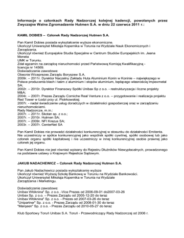 Informacje o członkach Rady Nadzorczej kolejnej kadencji, powołanych przez Zwyczajne Walne Zgromadzenie Hutmen S.A. w dniu 22 czerwca 2011 r.: KAMIL DOBIES – Członek Rady Nadzorczej Hutmen S.A. Pan Kamil Dobies posiada wykształcenie wyższe ekonomiczne. Ukończył Uniwersytet Mikołaja Kopernika w Torunia na Wydziale Nauk Ekonomicznych i Zarządzania. Ukończył również Europejskie Studia Specjalne w Centrum Studiów Europejskich im. Jeana Moneta UMK w Toruniu. Zdał egzamin na zarządcę nieruchomości przed Państwową Komisją Kwalifikacyjną licencja nr 14569. Doświadczenie zawodowe: Obecnie Wiceprezes Zarządu Boryszew S.A. 2009r. – 2011r. Dyrektor Naczelny Zakładu Huta Aluminium Konin w Koninie – największego w Polsce producenta blach i taśm z aluminium i stopów aluminium, będącego własnością Impexmetal SA; 2002r. – 2010r. Dyrektor Finansowy Spółki Unibax Sp z o.o. - restrukturyzacja i liczne projekty M&A; 2004r. – 2007r. Prezes Zarządu Corniche Real Venture z o.o. – przygotowanie i realizacja projektu Red Tower w Łodzi przy ul. Piotrkowskiej; 2007r. - nadal świadczenie usług doradczych w działalności gospodarczej oraz w zarządzaniu nieruchomościami. Rady Nadzorcze, m.in.: 2007r. – 2011r. Skotan sp. z o.o.; 2007r. – 2010r. Hutmen SA; 2007r. – 2009r. NFI Krezus SA; 2003r. – 2007r. CenterNet SA Pan Kamil Dobies nie prowadzi działalności konkurencyjnej w stosunku do działalności Emitenta. Nie uczestniczy w spółce konkurencyjnej jako wspólnik spółki cywilnej, spółki osobowej lub jako członek organu spółki kapitałowej i nie uczestniczy w innej konkurencyjnej osobie prawnej jako członek jej organu. Pan Kamil Dobies nie jest również wpisany do Rejestru Dłużników Niewypłacalnych, prowadzonego na podstawie ustawy o Krajowym Rejestrze Sądowym. JAKUB NADACHEWICZ – Członek Rady Nadzorczej Hutmen S.A. Pan Jakub Nadachewicz posiada wykształcenie wyższe Ukończył również Wyższą Szkołę Bankową w Toruniu na Wydziale Bankowości. Ukończył Uniwersytet Mikołaja Kopernika w Torunia na Wydziale Zarządzania i Marketingu. Doświadczenie zawodowe: Unibax Włóknina" Sp. z o.o. -Vice Prezes od 2006-09-01 do2007-03-26 Unibax Sp. z o.o. – Prezes Zarządu od 2005-12-20 do teraz Unibax Włóknina" Sp. z o.o. - Prezes od 2007-03-26 do teraz "Unipartner" Sp. z o.o. - Prezes Zarządu od 2008-01-30 do teraz "Marqeen" Sp. z o.o. - Prezes Zarządu od 2010-05-27 do teraz Klub Sportowy Toruń Unibax S.A. Toruń - Przewodniczący Rady Nadzorczej od 2006 r. Garbarnia Skotan Sp. z o.o. Członek Rady Nadzorczej od 2008 r. Pan Jakub Nadachewicz nie prowadzi działalności konkurencyjnej w stosunku do działalności Emitenta. Nie uczestniczy w spółce konkurencyjnej jako wspólnik spółki cywilnej, spółki osobowej lub jako członek organu spółki kapitałowej i nie uczestniczy w innej konkurencyjnej osobie prawnej jako członek jej organu. Pan Jakub Nadachewicz nie jest również wpisany do Rejestru Dłużników Niewypłacalnych, prowadzonego na podstawie ustawy o Krajowym Rejestrze Sądowym. PIOTR SZELIGA – Członek Rady Nadzorczej Hutmen S.A. Magister ekonomii; absolwent Akademii Ekonomicznej w Krakowie oraz Stockholm University/Stockholm International Banking Institute. Posiada uprawnienia biegłego rewidenta (jest wpisany do rejestru biegłych rewidentów pod nr 10363) oraz ACCA Diploma in International Financial Reporting. Doświadczenie zawodowe: - 09.2007 – obecnie: Prezes Zarządu Dyrektor Generalny Impexmetal S.A. - 2003 – 2007: Impexmetal S.A.; zatrudniony kolejno na stanowiskach: Dyrektor Finansowy ds. Planowania i Rozwoju Grupy Kapitałowej, Dyrektor ds. Rachunkowości; p.o. Dyrektora Finansowego Spółki, Członek Zarządu Dyrektor Finansowy Impexmetal S.A. - 2006 – obecnie: Boryszew S.A.; zatrudniony kolejno na stanowiskach: Dyrektor ds. Rachunkowości, p.o. Dyrektora Finansowego Boryszew S.A., aktualnie: Doradca ds. Kontroli Zarządczej - 2000 – 2003: ce-market.com S.A.; Kontroler Finansowy - 1996 – 2000: Arthur Andersen Sp. z o.o.; ostatnio zajmowane stanowisko: Experienced Senior Consultant – Kierownik Projektów Członkostwo w radach nadzorczych: Pan Piotr Szeliga pełni funkcje nadzorcze w spółkach Grupy Kapitałowej Impexmetal: Hutmen S.A., WM Dziedzice S.A., HMN Szopienice S.A. w likwidacji, ZM Silesia S.A., FŁT Polska Sp. z o.o., Baterpol S.A., FLT and Metals Ltd. Pan Piotr Szeliga nie prowadzi działalności konkurencyjnej w stosunku do działalności Emitenta Nie uczestniczy w spółce konkurencyjnej jako wspólnik spółki cywilnej, spółki osobowej lub jako członek organu spółki kapitałowej i nie uczestniczy w innej konkurencyjnej osobie prawnej jako członek jej organu. Pan Piotr Szeliga nie jest również wpisany do Rejestru Dłużników Niewypłacalnych, prowadzonego na podstawie ustawy o Krajowym Rejestrze Sądowym. ZYGMUNT URBANIAK – Członek Rady Nadzorczej Hutmen S.A. Członek Rady Nadzorczej Impexmetal od 19 grudnia 2005 roku. Jest absolwentem Wydziału Ekonomii i Organizacji Uniwersytetu Mikołaja Kopernika w Toruniu. Od grudnia 1996 roku jest dyrektorem "Karo - Roman Karkosik" w Czernikowie. W latach 1991 - 1996 pełnił funkcję dyrektora ds. finansowych w spółkach kapitałowych w Toruniu: Karo, BHZ, Karo Metal, Unibax. Wcześniej m.in. – 10 lat stażu pracy na stanowisku głównego księgowego w przedsiębiorstwie państwowym. Po ukończonym kursie dla kandydatów na członków Rad Nadzorczych w spółkach Skarbu Państwa pełnił w latach 1995 – 1996 funkcję Przewodniczącego Rady Nadzorczej "Zakładów Naprawczych Taboru Kolejowego" S.A. w Oleśnicy. Od 1999 zasiada w Radzie Nadzorczej Boryszew S.A. Do 2006 roku z okołoroczną przerwą pełnił funkcję Przewodniczącego Rady Nadzorczej Boryszew S.A., pełniąc jednocześnie tę samą funkcję w Hucie Oława S.A. i Elana S.A. Od czerwca 2006 zasiada w Radzie Nadzorczej spółek zależnych od Impexmetal S.A.: Alum