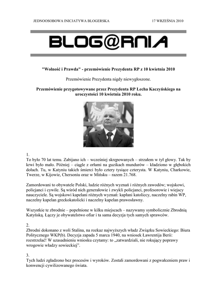 JEDNOOSOBOWA INICJATYWA BLOGERSKA 17 WRZEŚNIA 2010 "Wolność i Prawda" - przemówienie Prezydenta RP z 10 kwietnia 2010 Przemówienie Prezydenta nigdy niewygłoszone. Przemówienie przygotowywane przez Prezydenta RP Lecha Kaczyńskiego na uroczystości 10 kwietnia 2010 roku. 1. To było 70 lat temu. Zabijano ich – wcześniej skrępowanych – strzałem w tył głowy. Tak by krwi było mało. Później – ciągle z orłami na guzikach mundurów – kładziono w głębokich dołach. Tu, w Katyniu takich śmierci było cztery tysiące czterysta. W Katyniu, Charkowie, Twerze, w Kijowie, Chersoniu oraz w Mińsku – razem 21.768. Zamordowani to obywatele Polski, ludzie róŜnych wyznań i róŜnych zawodów; wojskowi, policjanci i cywile. Są wśród nich generałowie i zwykli policjanci, profesorowie i wiejscy nauczyciele. Są wojskowi kapelani róŜnych wyznań: kapłani katoliccy, naczelny rabin WP, naczelny kapelan greckokatolicki i naczelny kapelan prawosławny. Wszystkie te zbrodnie – popełnione w kilku miejscach – nazywamy symbolicznie Zbrodnią Katyńską. Łączy je obywatelstwo ofiar i ta sama decyzja tych samych sprawców. 2. Zbrodni dokonano z woli Stalina, na rozkaz najwyŜszych władz Związku Sowieckiego: Biura Politycznego WKP(b). Decyzja zapada 5 marca 1940, na wniosek Ławrentija Berii: rozstrzelać! W uzasadnieniu wniosku czytamy: to „zatwardziali, nie rokujący poprawy wrogowie władzy sowieckiej”. 3. Tych ludzi zgładzono bez procesów i wyroków. Zostali zamordowani z pogwałceniem praw i konwencji cywilizowanego świata. Czym jest śmierć dziesiątków tysięcy osób – obywateli Rzeczpospolitej – bez sądu? Jeśli to nie jest ludobójstwo, to co nim jest? 4. Pytamy, nie przestajemy pytać: dlaczego? Historycy wskazują zbrodnicze mechanizmy komunistycznego totalitaryzmu. Część jego ofiar leŜy tuŜ obok, równieŜ w katyńskim lesie. To tysiące Rosjan, Ukraińców, Białorusinów, ludzi innych narodów. Źródłem zbrodni jest jednak takŜe pakt Ribbentrop-Mołotow prowadzący do czwartego rozbioru Polski. Są nim imperialne, szowinistyczne zamiary Stalina. Zbrodnia Katyńska jest – pisał o tym wyłączony w ostatniej chwili z transportu śmierci prof. Stanisław Swianiewicz – częścią „akcji (...) oczyszczenia przedpoli potrzebnych dla dalszej ekspansji imperializmu sowieckiego”. Jest kluczowym elementem planu zniszczenia wolnej Polski: państwa stojącego – od roku 1920 - na drodze podboju Europy przez komunistyczne imperium. To dlatego NKWD próbuje pozyskać jeńców: niech poprą plany podboju. Oficerowie z Kozielska i Starobielska wybierają jednak honor, są wierni Ojczyźnie. Dlatego Stalin i jego Biuro Polityczne mszcząc się na niepokonanych decydują: rozstrzelać ich. Grobami są doły śmierci w Katyniu, pod Charkowem, w Miednoje. Te doły śmierci mają być takŜe grobem Polski, niepodległej Rzeczpospolitej. 5. W czerwcu roku 1941 Niemcy uderzają na ZSRS: sojusznicy z sierpnia 1939 stają się śmiertelnymi wrogami. ZSRS zostaje członkiem koalicji antyhitlerowskiej. Rząd w Moskwie przywraca – na mocy układu z 30 lipca 1941 – stosunki z Polską. Stalin zasiada u boku Roosevelta i Churchilla w wielkiej trójce. Miliony Ŝołnierzy Armii Czerwonej – Rosjan, Ukraińców, Białorusinów, Gruzinów, Ormian i Azerów, mieszkańców Azji środkowej – oddają Ŝycie w walce z Niemcami Hitlera. W tej samej walce giną teŜ Amerykanie, Brytyjczycy, Polacy, Ŝołnierze innych narodów. Przypomnijmy: to my, Polacy, jako pierwsi zbrojnie przeciwstawiliśmy się armii Hitlera. To my walczyliśmy z nazistowskimi Niemcami od początku do końca wojny. Pod jej koniec nasi Ŝołnierze tworzą czwartą co do liczebności armię antyhitlerowskiej koalicji. Polacy walczą i giną na wszystkich frontach: na Westerplatte i pod Kockiem, w bitwie o Anglię i pod Monte Cassino, pod Lenino i w Berlinie, w partyzantce i w Powstaniu Warszawskim. Są wśród nich bracia i dzieci ofiar Katynia. W bombowcu Polskich Sił Zbrojnych nad III Rzeszą ginie 26 letni Aleksander Fedorońko najstarszy z synów zamordowanego w Katyniu Szymona Fedorońki – naczelnego kapelana wyznania prawosławnego Wojska Polskiego. Najmłodszy syn, 22 letni Orest poległ – w szeregach Armii Krajowej – w pierwszym dniu Powstania Warszawskiego. Jego 24-letni brat Wiaczesław walczący w Zgrupowaniu AK „Gurt” ginie 17 dni później. W maju 1945 roku III Rzesza przegrywa wojnę. Nazistowski totalitaryzm upada. Niedługo obchodzić będziemy 65 rocznicę tego wydarzenia. Dla naszego narodu było to jednak zwycięstwo gorzkie, niepełne. Trafiamy w strefę wpływów Stalina i totalitarnego komunizmu. Po roku 1945 Polska istnieje ale bez niepodległości. Z narzuconym ustrojem. Próbuje się teŜ zafałszować naszą pamięć o polskiej historii i polskiej toŜsamości. 6. WaŜną częścią tej próby fałszerstwa było kłamstwo katyńskie. Historycy nazywają je wręcz kłamstwem załoŜycielskim PRL. Obowiązuje od roku 1943. To w związku z nim Stalin zrywa stosunki z polskim rządem. Świat miał się nigdy nie dowiedzieć. Rodzinom ofiar odebrano prawo do publicznej Ŝałoby, do opłakania i godnego upamiętnienia najbliŜszych. Po stronie kłamstwa stoi potęga totalitarnego imperium, stoi aparat władzy polskich komunistów. Ludzie mówiący prawdę o Katyniu płacą za to wysoką cenę. TakŜe uczniowie. W roku 1949 za wykrzyczaną na lekcji prawdę o Katyniu dwudziestoletni uczeń z Chełma Józef Bałka wyrokiem wojskowego sądu trafia na trzy lata do więzienia. CzyŜby – przypomnę słowa poety - świadkiem miały pozostać „guziki nieugięte” znajdowane tu, na katyńskich mogiłach? Są jednak takŜe „nieugięci ludzie” i – po czterech dekadach – totalitarny Goliat zostaje pokonany. Prawda – ta ostateczna broń przeciw przemocy – zwycięŜa. Tak jak kłamstwo katyńskie było fundamentem PRL, tak prawda o Katyniu jest fundamente