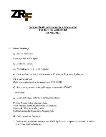 Sprawozdanie merytoryczne z działalności Fundacji im. Zofii Rydet za rok 2013 I. Dane Fundacji a) Nazwa fundacji: Fundacja im. Zofii Rydet b) Siedziba i adres: ul. Wysockiego 11, 31-310 Kraków c) Data wpisu i nr księgi rejestrowej w Krajowym Rejestrze Sądowym: KRS: 0000381344 Data wpisu do rejestru stowarzyszeń: 22.03.2011 d) Statystyczny numer identyfikacyjny w systemie REGON: 121492966 e) Dane dotyczące członków zarządu fundacji: Prezes: Maria Sokół-Augustyńska Vice-Prezes: Zofia Augustyńska-Martyniak Skarbnik: Wojciech Martyniak Członek zarządu: Stanisław Augustyński f) Cele statutowe fundacji: 1. Opieka nad spuścizna artystyczną Zofii Rydet oraz rozpowszechnianie wiedzy o artystce i jej twórczości. 2. Rozpowszechnianie oraz promocja kultury i sztuki w kraju i za granicą. 3. Inicjowanie i wspieranie działalności edukacyjnej, ze szczególnym uwzględnieniem twórczości fotograficznej. 4. Inicjowanie i wspieranie przedsięwzięć artystycznych poprzez archiwizację, digitalizację, zabezpieczanie, przechowywanie oraz udostępnianie zbiorów. II. Zasady, formy i zakres działalności statutowej z podaniem realizacji celów statutowych, a także opis głównych zdarzeń prawnych w jej działalności o skutkach finansowych Fundacja realizuje swoje cele statutowe poprzez: 1. Gromadzenie własnych zbiorów oraz przyjmowanie w depozyt zbiorów prywatnych lub pojedynczych fotografii, 2. Dbanie o stan techniczny negatywów i fotografii autorstwa Zofii Rydet, ich przechowywanie, katalogowanie, archiwizację i digitalizację, 3. Organizowanie i współorganizowanie wystaw w Polsce i za granicą, 4. Działalność edukacyjną i naukową, w tym wspieranie projektów badawczych w dziedzinie fotografii, 5. Stworzenie i utrzymywanie strony internetowej o działalności fundacji oraz bazy danych, dostępnej także przez stronę internetową. Fundacja może w ramach swojej działalności statutowej wspierać organizacyjnie i finansowo działalność innych osób prawnych i osób fizycznych, których działalność jest zbieżna z celami Fundacji – zwłaszcza fundacji, muzeów, galerii, instytucji kultury, uniwersytetów, szkół artystycznych – oraz współpracować z nimi, w szczególności poprzez udostępnianie posiadanych zbiorów oraz informacji o nich. Szczegółowy opis realizacji celów statutowych: Zasady, formy i zakres działalności statutowej Dbanie o stan techniczny negatywów i fotografii autorstwa ZR, ich przechowywanie, katalogowanie, archiwizację i digitalizację Data III – X. 2013 Opis realizacji celów statutowych Rozpoczęcie projektu „Digitalizacja i udostępnienie cyklu fotograficznego Zapis socjologiczny Zofii Rydet”. Przeprowadzono inwentaryzację i archiwizację negatywów, pozytywów oraz wszelkich dokumentów powiązanych z cyklem, znajdujących się w archiwum Fundacji, a przede wszystkim utworzono portal internetowy www.zofiarydet.com, zawierający nowoczesną bazę fotografii online (ok.14000 zdjęć), a także szeroki zakres materiałów merytorycznych, w tym także audio i video, dotyczących cyklu. Partnerzy: Fundacja Sztuk Wizualnych, Muzeum Sztuki Nowoczesnej w Warszawie, Muzeum w Gliwicach. Organizowanie i współorganizowanie wystaw w Polsce i za granicą Działalność edukacyjna i naukowa, w tym wspieranie projektów badawczych w dziedzinie fotografii IV. 2013 Profesjonalna oprawa części autorskich odbitek z cyklu „Mały człowiek”. V. 2013 Zlecenie wykonania napisów do filmu „Nieskończoność dalekich dróg (…)”, A. Różyckiego, konieczne ze względu na bardzo złą jakość dźwięku. Wykonawca: Marcin Barski V –VIII. 2013 Zakupienie dużej ilości specjalistycznych materiałów archiwizacyjnych, a następnie zabezpieczenie dużej części zbioru fotografii znajdujących się w archiwum (wybór z pozostałych cykli fotograficznych). Równoległe prowadzenie bieżących prac porządkowych i inwentaryzacyjnych. V. 2013 Przyjęcie zbioru fotografii autorstwa Tadeusza Rydeta w depozyt Fundacji. W kolejnych latach działalności planowane są prace inwentaryzacyjne, archiwizacyjne i digitalizacyjne nad zbiorem oraz upowszechnianie jego twórczości. VII – IX. 2013 Współpraca przy organizacji wystawy/użyczenie fotografii z cyklu „Zapis socjologiczny” Muzeum Etnograficznemu w Zielonej Górze z siedzibą w Ochli. X – XII. 2013 Współpraca przy organizacji wystawy/użyczenie fotografii z cyklu „Zapis socjologiczny, Zamojskiemu Towarzystwu Fotograficznemu, Zamojska Galeria Fotografii Ratusz. X – XII. 2013 Współpraca przy organizacji wystawy/użyczenie obiektu fotograficznego z cyklu „Przemiany” na wystawę FOTO-OBIEKT. Wystawę zorganizował, w ramach festiwalu Warsaw Photo Days, Związek Polskich Artystów Fotografików, Okręg Warszawski we współpracy z Centrum Rzeźby Polskiej w Orońsku, w galerii Propaganda w Warszawie oraz podczas festiwalu Jerzego Buszy grudzień 2013 – styczeń 2014 w Centrum Rzeźby w Orońsku. Wystawa pokazywała unikatowe prace polskich artystów, którzy wykorzystywali fotografię w projektach przestrzennych. Kuratorzy wystawy: Leszek Golec, Jagna Olejnikowska. III. 2013 Wykład na temat twórczości Zofii Rydet w Stowarzyszeniu Elektryków Polskich (Oddział krakowski), prowadzenie: Maria Sokół-Augustyńska i Ewa PasternakKapera. Stworzenie i utrzymanie strony internetowej o działalności fundacji, bazy danych, dostępnej także przez stronę internetową oraz inne działania promocyjne Udzielanie licencji na użycie fotografii ZR w publikacjach etc. III. 2013 Współpraca z Ośrodkiem Karta, Archiwa społeczne. Wsparcie merytoryczne – dzielenie się doświadczeniem nabytym podczas prac w archiwum Fundacji. IV. 2013 Użyczenie cd z filmem Nieskończoność dalekich dróg (…)”, A. Różyckiego, w celu wzbogacenia wykładu na temat Zofii Rydet (mgr Kora Kowalska, Uniwersytet Gdański, Wydział Filologiczny, Katedra Kulturoznawstwa). VI. 2013 Użyczenie cd z
