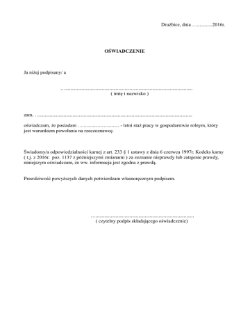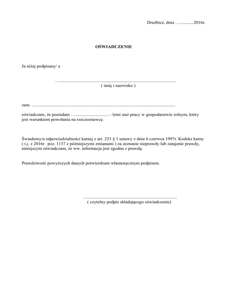 Drużbice, dnia …............2016r. OŚWIADCZENIE Ja niżej podpisany/ a …..................................................................................................... ( imię i nazwisko ) zam. …......................................................................................................................... oświadczam, że posiadam …............................. - letni staż pracy w gospodarstwie rolnym, który jest warunkiem powołania na rzeczoznawcę. Świadomy/a odpowiedzialności karnej z art. 233 § 1 ustawy z dnia 6 czerwca 1997r. Kodeks karny ( t.j. z 2016r. poz. 1137 z późniejszymi zmianami ) za zeznanie nieprawdy lub zatajenie prawdy, niniejszym oświadczam, że ww. informacja jest zgodna z prawdą. Prawdziwość powyższych danych potwierdzam własnoręcznym podpisem. ….............................................................................. ( czytelny podpis składającego oświadczenie)