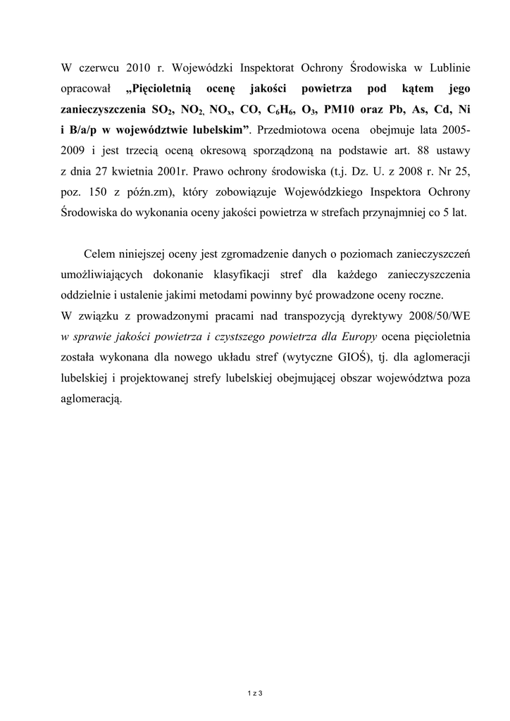 W czerwcu 2010 r. Wojewódzki Inspektorat Ochrony Środowiska w Lublinie opracował „Pięcioletnią ocenę jakości powietrza pod kątem jego zanieczyszczenia SO2, NO2, NOx, CO, C6H6, O3, PM10 oraz Pb, As, Cd, Ni i B/a/p w województwie lubelskim”. Przedmiotowa ocena obejmuje lata 20052009 i jest trzecią oceną okresową sporządzoną na podstawie art. 88 ustawy z dnia 27 kwietnia 2001r. Prawo ochrony środowiska (t.j. Dz. U. z 2008 r. Nr 25, poz. 150 z późn.zm), który zobowiązuje Wojewódzkiego Inspektora Ochrony Środowiska do wykonania oceny jakości powietrza w strefach przynajmniej co 5 lat. Celem niniejszej oceny jest zgromadzenie danych o poziomach zanieczyszczeń umożliwiających dokonanie klasyfikacji stref dla każdego zanieczyszczenia oddzielnie i ustalenie jakimi metodami powinny być prowadzone oceny roczne. W związku z prowadzonymi pracami nad transpozycją dyrektywy 2008/50/WE w sprawie jakości powietrza i czystszego powietrza dla Europy ocena pięcioletnia została wykonana dla nowego układu stref (wytyczne GIOŚ), tj. dla aglomeracji lubelskiej i projektowanej strefy lubelskiej obejmującej obszar województwa poza aglomeracją. 1z3 Wyniki klasyfikacji stref, wymagane metody ocen rocznych i minimalna wymagana ilość stanowisk pomiarowych na podstawie pięcioletniej oceny jakości powietrza sporządzonej zgodnie ze „Wskazówkami …” przekazanymi przez GIOŚ ochrona roślin PWS* PMI PWS* PMI PWJ PWS* PWS* PWS* PWS* PMI PWJ 0 1 0 1 2 0 0 0 0 1 1 1 1 1 1 2 1 1 1 1 1 1 1 1 1 2 3b 1 1 1 1 2 3 R1 R1 R3 - projektowana STREFA LUBELSKA Minimalna ilość stanowisk Liczba brakujących wymagana wymagana stanowisk zgodnie z na potrzeby w stosunku do dyrektywą ocen wymaganej na CAFE rocznych potrzeby ocen PWS* 0 2 PWS* 0 2 PWS* 0 0 PMI 2 2 PWJ 4 6 PWS* 0 0 PWS* 0 0 PWS* 0 0 PWS* 0 0 PMI 1 4 PWJ 4 4 PWS* 0 1 PWS* 0 1 ** Wymagana metoda ocen rocznych 1 2 1 2 3b 1 1 1 1 2 3 Liczba brakujących stanowisk w stosunku do wymaganej na potrzeby ocen - Klasa strefy Wymagana metoda ocen rocznych Zanieczyszczenie SO2 NO2 CO C6H6 PM10 Pb As Cd Ni B/a/p O3 SO2 NOx O3 Klasa strefy ochrona zdrowia Kryterium Nazwa strefy AGLOMERACJA LUBELSKA Minimalna ilość stanowisk wymagana wymagana zgodnie z na potrzeby dyrektywą ocen rocznych CAFE PWJ 4 ** Wskazane byłoby zautomatyzować pomiar tlenków azotu w Jarczewie lub doposażyć w analizator NOx stację w Białym Słupie PWJ- pomiary wysokiej jakości, PMI – pomiary mniej intensywne, PWS* – pomiary wskaźnikowe, alternatywnie MMA (modelowanie matematyczne) IMS (obiektywne metody szacowania) 2z3 4 - Oznaczenia: Klasa strefy dla SO2, NO2, CO, C6H6,, PM10, Pb (ochrona zdrowia) : 1 – poziom stężeń poniżej dolnego progu oszacowania, 2 - poziom stężeń pomiędzy górnym i dolnym progiem oszacowania, 3a – poziom stężeń powyżej górnego progu oszacowania, 3b – poziom stężeń powyżej poziomu dopuszczalnego. Klasa strefy dla As, Cd, Ni, BaP w pyle PM10 (ochrona zdrowia): 1 – poziom stężeń poniżej dolnego progu oszacowania, 2 - poziom stężeń pomiędzy górnym i dolnym progiem oszacowania, 3 – poziom stężeń powyżej górnego progu oszacowania. Klasa strefy dla O3 (ochrona zdrowia): 1 – poziom stężeń poniżej górnego progu oszacowania, 3 – poziom stężeń powyżej górnego progu oszacowania. Klasa strefy dla SO2, NOx (ochrona roślin): R1 – poziom stężeń poniżej dolnego progu oszacowania, R2 - poziom stężeń pomiędzy górnym i dolnym progiem oszacowania, R3 – poziom stężeń powyżej górnego progu oszacowania. Klasa strefy dla O3 (ochrona roślin): R1 – poziom stężeń poniżej górnego progu oszacowania, R3 – poziom stężeń powyżej górnego progu oszacowania. 3z3
