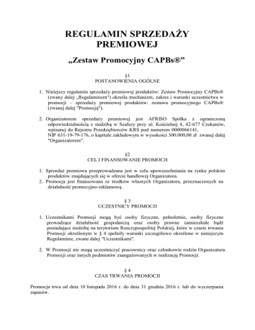 REGULAMIN SPRZEDAŻY PREMIOWEJ „Zestaw Promocyjny CAPBs®” §1 POSTANOWIENIA OGÓLNE 1. Niniejszy regulamin sprzedaży premiowej produktów: Zestaw Promocyjny CAPBs® (zwany dalej „Regulaminem") określa mechanizm, zakres i warunki uczestnictwa w promocji – sprzedaży premiowej produktów: zestawu promocyjnego CAPBs® (zwanej dalej "Promocją"). 2. Organizatorem sprzedaży premiowej jest AFRISO Spółka z ograniczoną odpowiedzialnością z siedzibą w Szałszy przy ul. Kościelnej 4, 42-677 Czekanów, wpisanej do Rejestru Przedsiębiorców KRS pod numerem 0000066141, NIP 631-19-79-176, o kapitale zakładowym w wysokości 300.000,00 zł zwanej dalej "Organizatorem". §2 CEL I FINANSOWANIE PROMOCJI 1. Sprzedaż premiowa przeprowadzana jest w celu upowszechniania na rynku polskim produktów znajdujących się w ofercie handlowej Organizatora. 2. Promocja jest finansowana ze środków własnych Organizatora, przeznaczonych na działalność promocyjno-reklamową. §3 UCZESTNICY PROMOCJI 1. Uczestnikami Promocji mogą być osoby fizyczne, pełnoletnie, osoby fizyczne prowadzące działalność gospodarczą oraz osoby prawne zamieszkałe bądź posiadające siedzibę na terytorium Rzeczypospolitej Polskiej, które w czasie trwania Promocji określonym w § 4 spełniły warunki szczegółowo określone w niniejszym Regulaminie, zwane dalej "Uczestnikami". 2. W Promocji nie mogą uczestniczyć pracownicy oraz członkowie rodzin Organizatora Promocji oraz innych podmiotów zaangażowanych w realizację Promocji. §4 CZAS TRWANIA PROMOCJI Promocja trwa od dnia 10 listopada 2016 r. do dnia 31 grudnia 2016 r. lub do wyczerpania zapasów. §5 ZESTAW PROMOCYJNY 1. Promocją objęte są produkty AFRISO (zwane dalej "Zestawem Promocyjnym"), obejmujące zakup produktów: zestawu promocyjnego CAPBs®, w skład którego wchodzi: uchwyt CAPBs®STm, gniazdo do czujników temperatury TK10, manometr PS20, detektor gazu GS10. 2. Zestaw promocyjny posiada kod – 91 314 17P, ustalony na potrzeby promocji. §6 MECHANIZM PROMOCJI 1. Warunkiem wzięcia udziału w Promocji jest nabycie w okresie wskazanym w §4 Regulaminu Z e s t a w u Promocyjnego w firmie AFRISO lub w sklepie internetowym w w w . a n a l i z a t o r y . p l p roduktów promocyjnych określonych w §5. 2. Pozostałe promocje i rabaty nie łączą się z w/w promocją. 3. Wartość zestawu promocyjnego została przeliczona wg kursu EURO NBP z dnia 26.10.2016r. 4. Podane cenny netto przeliczane są wg kursu EURO NBP z dnia 26.10.2016r 5. Uczestnik Promocji może dokonać nieograniczonej liczby zakupów i wielokrotnie otrzymywać rabat określony w § 7, na zasadach przewidzianych w Regulaminie Promocji, o ile każdy zakup spełnia warunki uczestnictwa w Promocji. 6. Promocyjne informacje określone są w ulotce promocyjnej, udostępnionej przez Organizatora w formie drukowanej lub elektronicznej na stronie www.afriso.pl. 7. Ilość zestawów promocyjnych o kodzie 91 314 17P – 100 szt.. §7 NAGRODA - RABAT 1. Organizator oferuje każdemu Uczestnikowi Promocji nagrodę w postaci rabatu w wysokości 512 zł. 2. Nagroda - rabat będzie naliczany w okresie trwania promocji k a ż d e m u Uczestnikowi Promocji, który dokonał zakupu: zestawu promocyjnego CAPBs® o kodzie 91 314 17P. 3. Uczestnicy Promocji mogą zrzec się prawa do nagrody - rabatu, ale nie mogą wymieniać nagród na inne produkty ani też na równowartość w pieniądzu. §8 SPOSÓB WYSTAWIENIA FAKTURY ZA PAKIET PROMOCYJNY 1. Faktura będzie zawierać zestaw promocyjny z kodem promocyjnym 91 314 17P z obniżoną wartością o udzielony rabat w wysokości 512 zł netto. 2. Wszystkie zamówienia, które wpłyną do 28 grudnia 2016, zostaną zrealizowane jeszcze w grudniu 2016, natomiast wszystkie zamówienia w okresie od 29.12.16 do 31.12.16 będą zrealizowane dopiero w styczniu 2017. §9 ZASIĘG TERYTORIALNY PROMOCJI Promocja prowadzona jest na terytorium Rzeczpospolitej Polskiej. § 10 KOMISJA PROMOCYJNA 1. Nad prawidłowością przebiegu Promocji czuwać będzie Komisja, w skład której wejdą przedstawiciele wskazani przez Organizatora. 2. Decyzje Komisji są ostateczne, co nie uchybia prawu do skorzystania ze środków ochrony prawnej przewidzianych przepisami prawa oraz treścią § 11 Regulaminu Promocji. § 11 DANE OSOBOWE 1. Dane osobowe Uczestników Promocji są zbierane i przetwarzane przy zachowaniu zasad określonych w ustawie o ochronie danych osobowych (tekst jednolity Dz.U. z2002 r. Nr 101 poz. 926 z późn. zmianami). Administratorem danych osobowych jest Organizator - AFRISO Spółka z ograniczoną odpowiedzialnością z siedzibą w Szałsza, ul. Kościelna, 42-677 Czekanów. Każdy z Uczestników ma prawo wglądu do treści swoich danych osobowych oraz ich poprawiania i żądania ich usunięcia. 2. Wszelką korespondencję w sprawach związanych z przetwarzaniem osobowych, należy kierować na adres biura Organizatora. danych 3. Wszystkie dane osobowe Uczestników Promocji są przechowywane w sposób zabezpieczający przed ich ujawnieniem i przetwarzane zgodnie z przepisami w/w. ustawy. 4. Administrator danych osobowych może powierzyć innemu podmiotowi na zasadach przewidzianych w przepisie art. 31 Ustawy o Ochronie danych osobowych w drodze umowy zawartej na piśmie, przetwarzanie danych osobowych Uczestników Promocji w celach związanych z realizacją Promocji w tym realizacją nagród. § 12 POSTĘPOWANIE REKLAMACYJNE 1. Reklamacje dotyczące przebiegu Promocji, a w szczególności wydania nagród, należy przesyłać na adres: [email protected] z tytułem "Reklamacja – Zestaw Promocyjny CAPBs®” lub w formie pisemnej pocztą na adres: AFRISO Sp. z o.o. Szałsza, ul. Kościelna 7, 42-677 Czekanów. 2. Reklamacje można składać w czasie trwania Promocji, nie później jednak niż w ciągu 21 dni od dnia zdarzenia stanowiącego przyczynę reklamacji. 3. Zgłoszenie reklamacji powinno zawierać adres do korespondencji, adres email Uczestnika, powód
