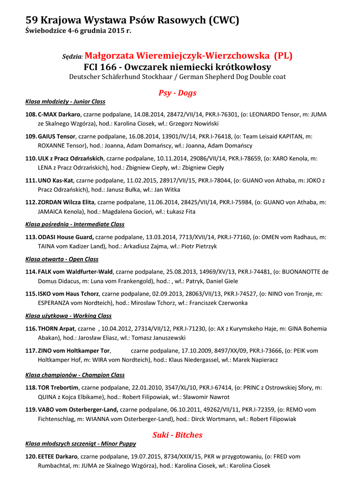 59 Krajowa Wystawa Psów Rasowych (CWC) Świebodzice 4-6 grudnia 2015 r. Sędzia: Małgorzata Wieremiejczyk-Wierzchowska (PL) FCI 166 - Owczarek niemiecki krótkowłosy Deutscher Schäferhund Stockhaar / German Shepherd Dog Double coat Psy - Dogs Klasa młodzieży - Junior Class 108. C-MAX Darkaro, czarne podpalane, 14.08.2014, 28472/VII/14, PKR.I-76301, (o: LEONARDO Tensor, m: JUMA ze Skalnego Wzgórza), hod.: Karolina Ciosek, wł.: Grzegorz Nowiński 109. GAIUS Tensor, czarne podpalane, 16.08.2014, 13901/IV/14, PKR.I-76418, (o: Team Leisaid KAPITAN, m: ROXANNE Tensor), hod.: Joanna, Adam Domańscy, wł.: Joanna, Adam Domańscy 110. ULK z Pracz Odrzańskich, czarne podpalane, 10.11.2014, 29086/VII/14, PKR.I-78659, (o: XARO Kenola, m: LENA z Pracz Odrzańskich), hod.: Zbigniew Ciepły, wł.: Zbigniew Ciepły 111. UNO Kas-Kat, czarne podpalane, 11.02.2015, 28917/VII/15, PKR.I-78044, (o: GUANO von Athaba, m: JOKO z Pracz Odrzańskich), hod.: Janusz Bułka, wł.: Jan Witka 112. ZORDAN Wilcza Elita, czarne podpalane, 11.06.2014, 28425/VII/14, PKR.I-75984, (o: GUANO von Athaba, m: JAMAICA Kenola), hod.: Magdalena Gocioń, wł.: Łukasz Fita Klasa pośrednia - Intermediate Class 113. ODASI House Guard, czarne podpalane, 13.03.2014, 7713/XVII/14, PKR.I-77160, (o: OMEN vom Radhaus, m: TAINA vom Kadizer Land), hod.: Arkadiusz Zajma, wł.: Piotr Pietrzyk Klasa otwarta - Open Class 114. FALK vom Waldfurter-Wald, czarne podpalane, 25.08.2013, 14969/XV/13, PKR.I-74481, (o: BUONANOTTE de Domus Didacus, m: Luna vom Frankengold), hod.: , wł.: Patryk, Daniel Giele 115. ISKO vom Haus Tchorz, czarne podpalane, 02.09.2013, 28063/VII/13, PKR.I-74527, (o: NINO von Tronje, m: ESPERANZA vom Nordteich), hod.: Mirosław Tchorz, wł.: Franciszek Czerwonka Klasa użytkowa - Working Class 116. THORN Arpat, czarne , 10.04.2012, 27314/VII/12, PKR.I-71230, (o: AX z Kurymskeho Haje, m: GINA Bohemia Abakan), hod.: Jarosław Eliasz, wł.: Tomasz Januszewski 117. ZINO vom Holtkamper Tor, czarne podpalane, 17.10.2009, 8497/XX/09, PKR.I-73666, (o: PEIK vom Holtkamper Hof, m: WIRA vom Nordteich), hod.: Klaus Niedergassel, wł.: Marek Napieracz Klasa championów - Champion Class 118. TOR Trebortim, czarne podpalane, 22.01.2010, 3547/XL/10, PKR.I-67414, (o: PRINC z Ostrowskiej Sfory, m: QUINA z Kojca Elbikame), hod.: Robert Filipowiak, wł.: Sławomir Nawrot 119. VABO vom Osterberger-Land, czarne podpalane, 06.10.2011, 49262/VII/11, PKR.I-72359, (o: REMO vom Fichtenschlag, m: WIANNA vom Osterberger-Land), hod.: Dirck Wortmann, wł.: Robert Filipowiak Suki - Bitches Klasa młodszych szczeniąt - Minor Puppy 120. EETEE Darkaro, czarne podpalane, 19.07.2015, 8734/XXIX/15, PKR w przygotowaniu, (o: FRED vom Rumbachtal, m: JUMA ze Skalnego Wzgórza), hod.: Karolina Ciosek, wł.: Karolina Ciosek Klasa młodzieży - Junior Class 121. CLEO Tombo, czarne podpalane, 16.08.2014, 9213/XXIX/14, PKR.I-78055, (o: Team Leisaid KAPITAN, m: GABI Tombo), hod.: Tomasz Bogucki, wł.: Karolina Ciosek 122. FARINKA Equus, czarne podpalane, 18.02.2015, 29077/VII/15, PKR.I-78596, (o: GUANO von Athaba, m: KSANDINA Equus), hod.: Aneta Bilińska, wł.: Aneta Bilińska 123. HERA z Lomnickeho udoli, wilczaste, 15.06.2014, 7111/XXX/14, PKR.I-76122, (o: LUKAS z Dvorakova Sadu, m: ERIKA z Lomnickeho udoli), hod.: Dusan Kini, wł.: Radosław Macuga 124. KAJA z Czarnowąs, czarne podpalane, 03.09.2014, 15286/XV/14, PKR.I-77277, (o: CYROS vom Zisawinkel, m: ISABELL vom Zisawinkel), hod.: Jerzy Fila, wł.: Jerzy Fila 125. WANNI vom Frankengold, czarne podpalane, 20.11.2014, 15888/XV/14, PKR.I-76813, (o: Vac-Vagvoelgyl JENKY, m: WERONA vom Frankengold), hod.: Frank Goldlust, wł.: Patryk, Daniel Giele Klasa pośrednia - Intermediate Class 126. BACCARA Złotnicka Sfora, czarne podpalane, 10.05.2014, 49266/VIII/14, PKR.I-76227, (o: VABO vom Osterberger-Land, m: HOLI Asarko Lordana), hod.: Michał Wojtkowiak, wł.: Robert Filipowiak 127. DAXI Artrox, czarne podpalane, 08.05.2014, 8845/XX/14, PKR.I-78776, (o: NORTON Tensor, m: BAXI Artrox), hod.: Artur Dąbrowski, wł.: Artur Dąbrowski 128. FENJA Bi-Chelms, czarne podpalane, 22.04.2014, 7193/XXX/14, PKR.I-77255, (o: RAPTORS Asarko Lordana, m: ZINNI Asarko Lordana), hod.: Adam Krzak, wł.: Robert Matysiak 129. FLORI Gard Bohemia, czarne podpalane, 31.03.2014, 2338/XLI/14, PKR.I-79035, (o: KIRBBI Gard Bohemia, m: HAIDI Hiszpańskie Srebro), hod.: Marian Piekarek, wł.: Zenon Gurecki 130. HENNA Tensor, czarne podpalane, 09.07.2014, 9009/XXIX/14, PKR.I-76678, (o: REMO vom Fichtenschlag, m: UNIQUE Tensor), hod.: Joanna, Adam Domańscy, wł.: Karolina Ciosek 131. IGNORANTKA Amicus Nobilis, wilczaste, 24.04.2014, 28741/VII/14, PKR.I-77327, (o: URSUS Hronovsky Pramen, m: INDY z Oseckeho Klastera), hod.: Bogusława Świerszczyńska, wł.: Renata Ostropolska 132. TRIXI vom Haus Alter, czarne podpalane, 20.04.2014, 4290/XL/14, PKR.I-76588, (o: GIO vom Muhlenteich, m: YUMIKO vom Haus Tchorz), hod.: Leszek Pawłowski, wł.: Leszek Pawłowski 133. WITTORIA Tamagra, czarne podpalane, 25.04.2014, 28539/VII/14, PKR.I-7639, (o: GIO vom Muhlenteich, m: ONLY vom Haus Tchorz), hod.: Marlena Granatowska, wł.: Marlena Granatowska 134. XINA vom Zellwaldrand, czarne podpalane, 12.06.2014, 7703/XVII/14, PKR.I-78011, (o: YAMBO vom Zellwaldrand, m: URSA vom Zellwaldrand), hod.: Ralf Wiesner, wł.: Henryk Korolewicz Klasa otwarta - Open Class 135. ABRA z Kojca Whitney, czarne podpalane, 15.09.2013, 49094/VII/13, PKR.I-74847, (o: VABO vom Osterberger-Land, m: YASMINA z Ostrowskiej Sfory), hod.: Mateusz Mencel, wł.: Robert Filipowiak 136. BIRMA vom Lupus Alpha, wilczaste, 07.02.2013, 6996/XXX/12, PKR.I-74945, (o: HANK vom Weinbergblick, m: ORKA von der Germanenquelle), hod.: Ewa Smolarczyk, wł.: Remigiusz Pustkowski 137. NONA Kamireł, czarne podpalane, 04.12.2012, 8421/XX/12, PKR.I-72774, (o: NANNO von Arlett, m: ORMA von der Holzheimer Linde), hod.: Marek Napieracz, wł.: Mirosław Bałaziński 138. XILLI vom Holtkamper Tor, czarne podpalane, 2