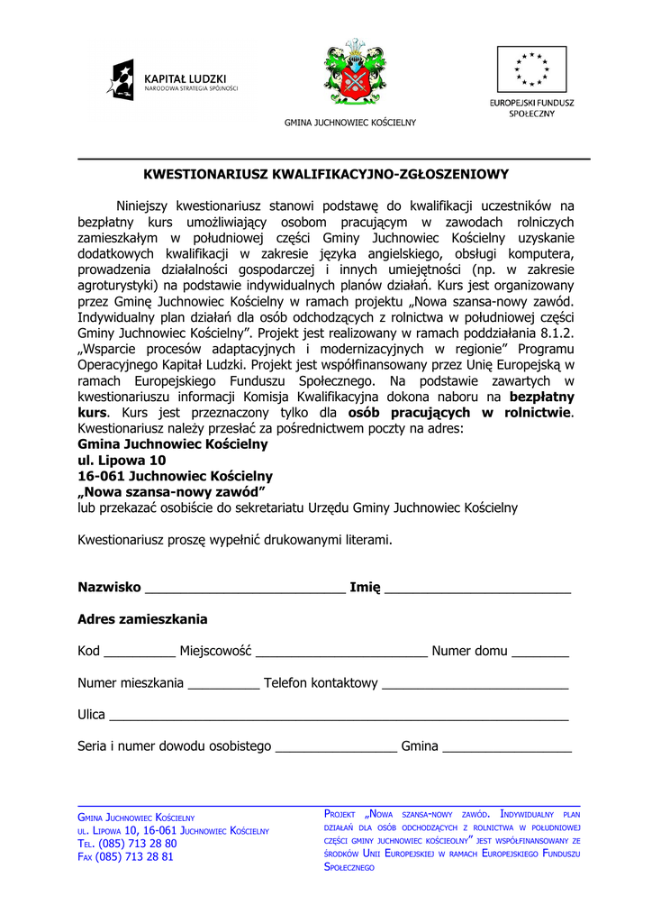 GMINA JUCHNOWIEC KOŚCIELNY KWESTIONARIUSZ KWALIFIKACYJNO-ZGŁOSZENIOWY Niniejszy kwestionariusz stanowi podstawę do kwalifikacji uczestników na bezpłatny kurs umożliwiający osobom pracującym w zawodach rolniczych zamieszkałym w południowej części Gminy Juchnowiec Kościelny uzyskanie dodatkowych kwalifikacji w zakresie języka angielskiego, obsługi komputera, prowadzenia działalności gospodarczej i innych umiejętności (np. w zakresie agroturystyki) na podstawie indywidualnych planów działań. Kurs jest organizowany przez Gminę Juchnowiec Kościelny w ramach projektu „Nowa szansa-nowy zawód. Indywidualny plan działań dla osób odchodzących z rolnictwa w południowej części Gminy Juchnowiec Kościelny”. Projekt jest realizowany w ramach poddziałania 8.1.2. „Wsparcie procesów adaptacyjnych i modernizacyjnych w regionie” Programu Operacyjnego Kapitał Ludzki. Projekt jest współfinansowany przez Unię Europejską w ramach Europejskiego Funduszu Społecznego. Na podstawie zawartych w kwestionariuszu informacji Komisja Kwalifikacyjna dokona naboru na bezpłatny kurs. Kurs jest przeznaczony tylko dla osób pracujących w rolnictwie. Kwestionariusz należy przesłać za pośrednictwem poczty na adres: Gmina Juchnowiec Kościelny ul. Lipowa 10 16-061 Juchnowiec Kościelny „Nowa szansa-nowy zawód” lub przekazać osobiście do sekretariatu Urzędu Gminy Juchnowiec Kościelny Kwestionariusz proszę wypełnić drukowanymi literami. Nazwisko ____________________________ Imię __________________________ Adres zamieszkania Kod __________ Miejscowość ________________________ Numer domu ________ Numer mieszkania __________ Telefon kontaktowy __________________________ Ulica ________________________________________________________________ Seria i numer dowodu osobistego _________________ Gmina __________________ GMINA JUCHNOWIEC KOŚCIELNY UL. LIPOWA 10, 16-061 JUCHNOWIEC KOŚCIELNY TEL. (085) 713 28 80 FAX (085) 713 28 81 PROJEKT „NOWA SZANSA-NOWY ZAWÓD. INDYWIDUALNY PLAN DZIAŁAŃ DLA OSÓB ODCHODZĄCYCH Z ROLNICTWA W POŁUDNIOWEJ CZĘŚCI GMINY JUCHNOWIEC KOŚCIEOLNY” JEST WSPÓŁFINANSOWANY ZE UNII EUROPEJSKIEJ SPOŁECZNEGO ŚRODKÓW W RAMACH EUROPEJSKIEGO FUNDUSZU Adres zameldowania zamieszkania) (wypełnić w przypadku, gdy jest inny niż adres Kod __________ Miejscowość ________________________ Numer domu ________ Numer mieszkania __________ Gmina _____________________________________ Ulica ________________________________________________________________ Czy kandydat/ka jest zatrudniona w rolnictwie? o Tak o Nie Motywacja Co skłoniło Pana/Panią do podjęcia decyzji o uczestniczeniu w kursie? _____________________________________________________________________ _____________________________________________________________________ _____________________________________________________________________ W jaki sposób ukończenie kursu przyczyni się do zwiększenia Pana/Pani szans na rynku pracy? _____________________________________________________________________ Informacje o kandydacie M.1 Wiek Rok urodzenia _________________ o 1. poniżej 18 lat o 2. od 18 do 29 lat o 3. od 30 do 59 lat o 5. 60 lat i więcej M.3 Proszę określić swój poziom znajomości języka angielskiego? o 1. Nie uczyłe(a)m się j. angielskiego o 2. Poziom początkujący o 3. Poziom średnio zaawansowany o 4. Poziom zaawansowany GMINA JUCHNOWIEC KOŚCIELNY UL. LIPOWA 10, 16-061 JUCHNOWIEC KOŚCIELNY TEL. (085) 713 28 80 FAX (085) 713 28 81 M.2 Wykształcenie o 1. Niepełne podstawowe o 2. Podstawowe o 3. Gimnazjalne o 4. Zasadnicze zawodowe o 5. Średnie o 6. Policealne/niepełne wyższe o 7. Wyższe M.4 Proszę określić swój poziom znajomości obsługi komputera? o 1. Poziom zerowy o 2. poziom początkujący o 3. Poziom średnio zaawansowany o 4. Poziom zaawansowany PROJEKT „NOWA SZANSA-NOWY ZAWÓD. INDYWIDUALNY PLAN DZIAŁAŃ DLA OSÓB ODCHODZĄCYCH Z ROLNICTWA W POŁUDNIOWEJ CZĘŚCI GMINY JUCHNOWIEC KOŚCIEOLNY” JEST WSPÓŁFINANSOWANY ZE UNII EUROPEJSKIEJ SPOŁECZNEGO ŚRODKÓW W RAMACH EUROPEJSKIEGO FUNDUSZU M.5 Proszę określić, jakim poziomem kursu j. angielskiego jest Pan(i) zainteresowany(a)? o 1. Zerowym o 2. Podstawowym M.7 Proszę określić jaką tematyką kursu dodatkowego jest Pan(i) zainteresowany(a)? o 1. Prowadzenia agrobiznesu, o 2. Księgowością komputerową o 3. Inne (jakie?) ________________ ________________________________ M.6 Proszę określić swój poziom znajomości programów biurowych i Internetu? o 1. Poziom zerowy o 2. poziom początkujący o 3. Poziom średnio zaawansowany o 4. Poziom zaawansowany Do kwestionariusza kwalifikacyjno-zgłoszeniowego załączam: o Ksero dowodu osobistego potwierdzającego miejsce zameldowania i dane osobowe. o Ksero dowodu wpłaty KRUS ________________________ (podpis) Ja niżej podpisany oświadczam, iż zgodnie z Ustawą z dnia 29 sierpnia 1997 r. o ochronie danych osobowych (Dz.U z 2002 r., Nr 101, poz. 926 z późn. zm.), wyrażam zgodę na przetwarzanie moich danych osobowych zbieranych na potrzeby realizowanego projektu „Nowa szansa-nowy zawód. Indywidualny plan działań dla osób odchodzących z rolnictwa w południowej części Gminy Juchnowiec Kościelny” oraz na udział w badaniu ankietowym zgodnie z zakresem określonym przez Instytucję Zarządzającą (Ministerstwo Rozwoju Regionalnego) dla Poddziałania 8.1.2. Programu Operacyjnego Kapitał Ludzki. ________________________ (podpis) Świadomy(a) odpowiedzialności karnej oświadczam, iż dane zawarte w niniejszym kwestionariuszu odpowiadają prawdzie. ________________________ (podpis) GMINA JUCHNOWIEC KOŚCIELNY UL. LIPOWA 10, 16-061 JUCHNOWIEC KOŚCIELNY TEL. (085) 713 28 80 FAX (085) 713 28 81 PROJEKT „NOWA SZANSA-NOWY ZAWÓD. INDYWIDUALNY PLAN DZIAŁAŃ DLA OSÓB ODCHODZĄCYCH Z ROLNICTWA W POŁUDNIOWEJ CZĘŚCI GMINY JUCHNOWIEC KOŚCIEOLNY” JEST WSPÓŁFINANSOWANY ZE UNII EUROPEJSKIEJ SPOŁECZNEGO ŚRODKÓW W RAMACH EUROPEJSK