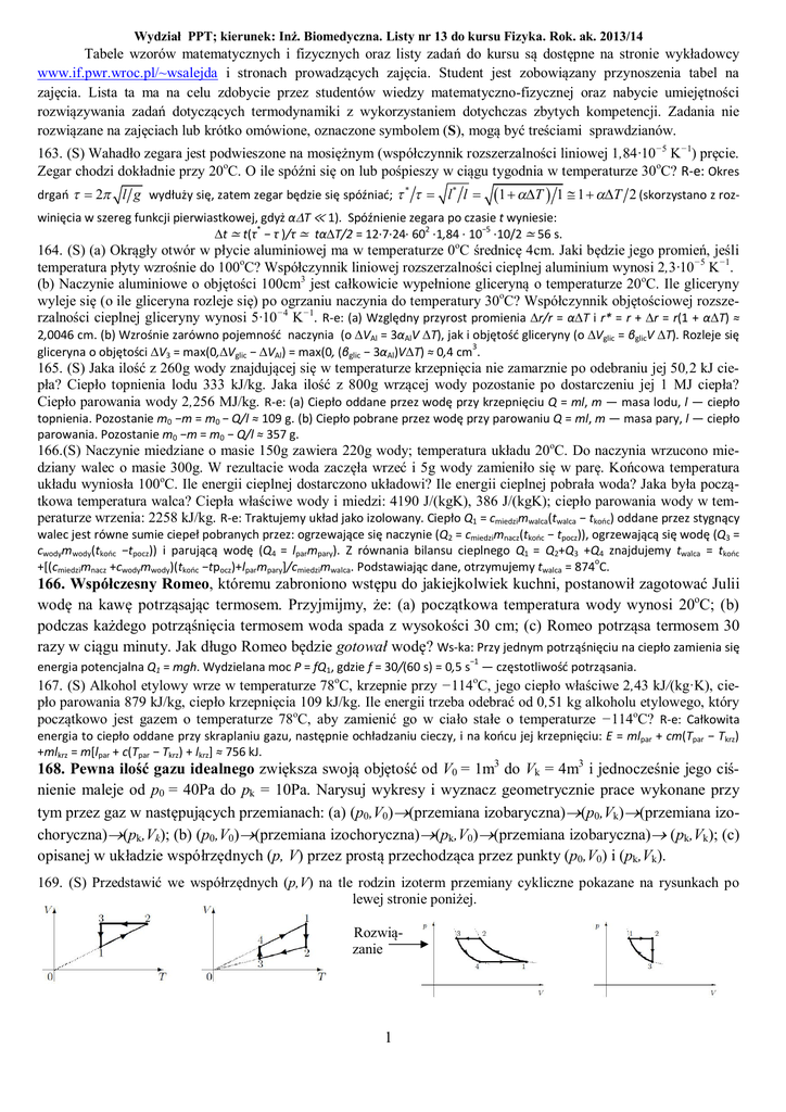 Wydział PPT; kierunek: Inż. Biomedyczna. Listy nr 13 do kursu Fizyka. Rok. ak. 2013/14 Tabele wzorów matematycznych i fizycznych oraz listy zadań do kursu są dostępne na stronie wykładowcy www.if.pwr.wroc.pl/~wsalejda i stronach prowadzących zajęcia. Student jest zobowiązany przynoszenia tabel na zajęcia. Lista ta ma na celu zdobycie przez studentów wiedzy matematyczno-fizycznej oraz nabycie umiejętności rozwiązywania zadań dotyczących termodynamiki z wykorzystaniem dotychczas zbytych kompetencji. Zadania nie rozwiązane na zajęciach lub krótko omówione, oznaczone symbolem (S), mogą być treściami sprawdzianów. 163. (S) Wahadło zegara jest podwieszone na mosiężnym (współczynnik rozszerzalności liniowej 1,84·10−5 K−1) pręcie. Zegar chodzi dokładnie przy 20oC. O ile spóźni się on lub pośpieszy w ciągu tygodnia w temperaturze 30oC? R-e: Okres * * drgań 2 l g wydłuży się, zatem zegar będzie się spóźniać; l l 1 T 1 1 T 2 (skorzystano z roz- winięcia w szereg funkcji pierwiastkowej, gdyż αT ≪ 1). Spóźnienie zegara po czasie t wyniesie: t ≃ t(τ* − τ )/τ ≃ tαT/2 = 12·7·24· 602 ·1,84 · 10−5 ·10/2 ≃ 56 s. 164. (S) (a) Okrągły otwór w płycie aluminiowej ma w temperaturze 0oC średnicę 4cm. Jaki będzie jego promień, jeśli temperatura płyty wzrośnie do 100oC? Współczynnik liniowej rozszerzalności cieplnej aluminium wynosi 2,3·10−5 K−1. (b) Naczynie aluminiowe o objętości 100cm3 jest całkowicie wypełnione gliceryną o temperaturze 20oC. Ile gliceryny wyleje się (o ile gliceryna rozleje się) po ogrzaniu naczynia do temperatury 30oC? Współczynnik objętościowej rozszerzalności cieplnej gliceryny wynosi 5·10−4 K−1. R-e: (a) Względny przyrost promienia r/r = αT i r* = r + r = r(1 + αT) ≈ 2,0046 cm. (b) Wzrośnie zarówno pojemność naczynia (o VAl = 3αAlV T), jak i objętość gliceryny (o Vglic = βglicV T). Rozleje się 3 gliceryna o objętości V3 = max(0,Vglic − VAl) = max(0, (βglic − 3αAl)VT) ≈ 0,4 cm . 165. (S) Jaka ilość z 260g wody znajdującej się w temperaturze krzepnięcia nie zamarznie po odebraniu jej 50,2 kJ ciepła? Ciepło topnienia lodu 333 kJ/kg. Jaka ilość z 800g wrzącej wody pozostanie po dostarczeniu jej 1 MJ ciepła? Ciepło parowania wody 2,256 MJ/kg. R-e: (a) Ciepło oddane przez wodę przy krzepnięciu Q = ml, m — masa lodu, l — ciepło topnienia. Pozostanie m0 −m = m0 − Q/l ≈ 109 g. (b) Ciepło pobrane przez wodę przy parowaniu Q = ml, m — masa pary, l — ciepło parowania. Pozostanie m0 −m = m0 − Q/l ≈ 357 g. 166.(S) Naczynie miedziane o masie 150g zawiera 220g wody; temperatura układu 20oC. Do naczynia wrzucono miedziany walec o masie 300g. W rezultacie woda zaczęła wrzeć i 5g wody zamieniło się w parę. Końcowa temperatura układu wyniosła 100oC. Ile energii cieplnej dostarczono układowi? Ile energii cieplnej pobrała woda? Jaka była początkowa temperatura walca? Ciepła właściwe wody i miedzi: 4190 J/(kgK), 386 J/(kgK); ciepło parowania wody w temperaturze wrzenia: 2258 kJ/kg. R-e: Traktujemy układ jako izolowany. Ciepło Q1 = cmiedzimwalca(twalca − tkońc) oddane przez stygnący walec jest równe sumie ciepeł pobranych przez: ogrzewające się naczynie (Q2 = cmiedzimnacz(tkońc − tpocz)), ogrzewającą się wodę (Q3 = cwodymwody(tkońc −tpocz)) i parującą wodę (Q4 = lparmpary). Z równania bilansu cieplnego Q1 = Q2+Q3 +Q4 znajdujemy twalca = tkońc +[(cmiedzimnacz +cwodymwody)(tkońc −tpocz)+lparmpary]/cmiedzimwalca. Podstawiając dane, otrzymujemy twalca = 874oC. 166. Współczesny Romeo, któremu zabroniono wstępu do jakiejkolwiek kuchni, postanowił zagotować Julii wodę na kawę potrząsając termosem. Przyjmijmy, że: (a) początkowa temperatura wody wynosi 20oC; (b) podczas każdego potrząśnięcia termosem woda spada z wysokości 30 cm; (c) Romeo potrząsa termosem 30 razy w ciągu minuty. Jak długo Romeo będzie gotował wodę? Ws-ka: Przy jednym potrząśnięciu na ciepło zamienia się energia potencjalna Q1 = mgh. Wydzielana moc P = fQ1, gdzie f = 30/(60 s) = 0,5 s−1 — częstotliwość potrząsania. 167. (S) Alkohol etylowy wrze w temperaturze 78oC, krzepnie przy −114oC, jego ciepło właściwe 2,43 kJ/(kg·K), ciepło parowania 879 kJ/kg, ciepło krzepnięcia 109 kJ/kg. Ile energii trzeba odebrać od 0,51 kg alkoholu etylowego, który początkowo jest gazem o temperaturze 78oC, aby zamienić go w ciało stałe o temperaturze −114oC? R-e: Całkowita energia to ciepło oddane przy skraplaniu gazu, następnie ochładzaniu cieczy, i na końcu jej krzepnięciu: E = mlpar + cm(Tpar − Tkrz) +mlkrz = m[lpar + c(Tpar − Tkrz) + lkrz] ≈ 756 kJ. 168. Pewna ilość gazu idealnego zwiększa swoją objętość od V0 = 1m3 do Vk = 4m3 i jednocześnie jego ciśnienie maleje od p0 = 40Pa do pk = 10Pa. Narysuj wykresy i wyznacz geometrycznie prace wykonane przy tym przez gaz w następujących przemianach: (a) (p0,V0)(przemiana izobaryczna)(p0,Vk)(przemiana izochoryczna)(pk,Vk); (b) (p0,V0)(przemiana izochoryczna)(pk,V0)(przemiana izobaryczna) (pk,Vk); (c) opisanej w układzie współrzędnych (p, V) przez prostą przechodząca przez punkty (p0,V0) i (pk,Vk). 169. (S) Przedstawić we współrzędnych (p,V) na tle rodzin izoterm przemiany cykliczne pokazane na rysunkach po lewej stronie poniżej. Rozwiązanie 1 170. Znajdujący się w komorze gaz idealny poddano zamkniętemu cyklowi przemian termodynamicznych: ABCA, przy czym przejście AB jest przemianą izochoryczną, BC odpowiada przemianie adiabatycznej, a przemiana CA jest izobaryczna. Ciepło dostarczone układowi w procesie AB było równe 20J, a wypadkowa praca wykonana przez układ w jednym cyklu zamkniętym wyniosła 15 J. Ile ciepła dostarczono układowi (lub ile ciepła oddał układ) w przemianie izobarycznej? 171. (S) W naczyniu znajduje się gaz o masie cząsteczkowej μ, temperaturze T i ciśnieniu p. Jaka jest gęstość g