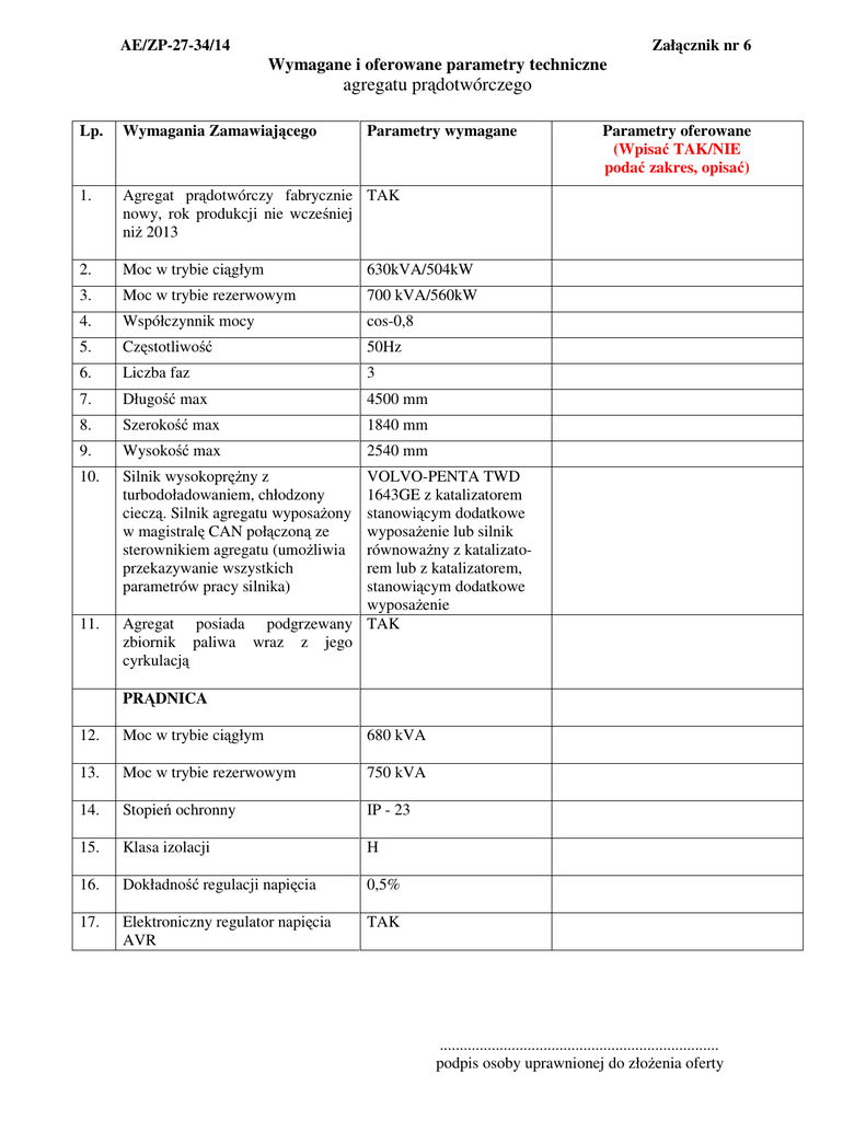 AE/ZP-27-34/14 Załącznik nr 6 Wymagane i oferowane parametry techniczne agregatu prądotwórczego Lp. Wymagania Zamawiającego Parametry wymagane 1. Agregat prądotwórczy fabrycznie TAK nowy, rok produkcji nie wcześniej niż 2013 2. Moc w trybie ciągłym 630kVA/504kW 3. Moc w trybie rezerwowym 700 kVA/560kW 4. Współczynnik mocy cos-0,8 5. Częstotliwość 50Hz 6. Liczba faz 3 7. Długość max 4500 mm 8. Szerokość max 1840 mm 9. Wysokość max 2540 mm 10. Silnik wysokoprężny z turbodoładowaniem, chłodzony cieczą. Silnik agregatu wyposażony w magistralę CAN połączoną ze sterownikiem agregatu (umożliwia przekazywanie wszystkich parametrów pracy silnika) 11. Agregat zbiornik cyrkulacją Parametry oferowane (Wpisać TAK/NIE podać zakres, opisać) VOLVO-PENTA TWD 1643GE z katalizatorem stanowiącym dodatkowe wyposażenie lub silnik równoważny z katalizatorem lub z katalizatorem, stanowiącym dodatkowe wyposażenie posiada podgrzewany TAK paliwa wraz z jego PRĄDNICA 12. Moc w trybie ciągłym 680 kVA 13. Moc w trybie rezerwowym 750 kVA 14. Stopień ochronny IP - 23 15. Klasa izolacji H 16. Dokładność regulacji napięcia 0,5% 17. Elektroniczny regulator napięcia AVR TAK ...................................................................... podpis osoby uprawnionej do złożenia oferty 18. 19. 20. 21. 22. WYPOSAŻENIE DODATKOWE Zespół prądotwórczy zamontowany na ramie z własnym zbiornikiem dziennym o pojemności min. 450l Obudowa kontenerowa odporna na warunki atmosferyczne, dźwiękochłonna, zapewniająca wyciszenie do 70 dB Rozrusznik elektryczny z baterią akumulatorów rozruchowych Panel sterowania ręczny i automatyczny zdublowany (przy agregacie i rozdzielni) z wyświetlaczem typu LED Tłumik wydechu o podwyższonej tłumienności z kompensatorem drgań układu wydechowego TAK TAK TAK TAK TAK 23. Pompa usuwania oleju smarnego TAK 24. Wyłącznik główny TAK 25. Mikroprocesorowy panel sterowania zespołem prądotwórczym w automatycznym trybie pracy TAK 26. Panel SZR dostosowany do wymogów użytkownika TAK 27. Moduł pracy równoległej z agregatorami lub siecią energetyczną TAK 28. TAK 32. Możliwość zdalnego monitorowania (software/styki binarne) Układ podgrzewania płynu chłodzącego Automatyczny prostownik akumulatorów rozruchowych Elektroniczny regulator prędkości obrotowej Elektroniczny regulator napięcia 33. Zestaw mierników analogowych TAK 34. Układ antykondensacyjny TAK 29. 30. 31. TAK TAK TAK TAK ...................................................................... podpis osoby uprawnionej do złożenia oferty POZOSTAŁE WYMAGANIA 35. 36. 37. 38. 39. 40. 41. 42. 43. Instrukcja obsługi w języku polskim oraz wymogi dotyczące konstrukcji fundamentów wraz z dostawą przedmiotu zamówienia Realizacja przedmiotu zamówienia w terminie do 40 dni od daty podpisania umowy Szkolenie w siedzibie Zamawiającego w zakresie obsługi urządzenia w dniu protokolarnego odbioru przedmiotu zamówienia lub w terminie wyznaczonym przez Zamawiającego w porozumieniu z Wykonawcą Do oferty należy dołączyć materiały informacyjne w języku polskim dotyczące parametrów oferowanego przedmiotu zamówienia oraz jego zdjęcie (fotografię) Gwarancja i bezpłatny serwis ( w tym obowiązkowe przeglądy kompleksowe min. 2 x w okresie gwarancji) w okresie minimum 24 miesiące od daty protokolarnego odbioru przedmiotu zamówienia W okresie gwarancji gwarantowany czas od zgłoszenia usterki do jej usunięcia do 48 godzin W przypadku naprawy trwającej dłużej niż 48 godzin wstawienie przez Wykonawcę urządzenia zastępczego. W okresie gwarancji przyjazd serwisanta do siedziby Zamawiającego na koszt Wykonawcy Utylizacja istniejącego agregatu prądotwórczego TYP-52H12 (ZMIN- Warszawa-1989 r.) z prądnicą synchroniczną TYPA355504-041 (ZSE PRAHA). Wykonawca załączy do protokołu odbioru przedmiotu umowy dokument potwierdzający utylizację istniejącego agregatu. TAK TAK TAK TAK TAK TAK TAK TAK TAK Niespełnienie wyżej wymienionych parametrów i warunków spowoduje odrzucenie oferty. ...................................................................... podpis osoby uprawnionej do złożenia oferty