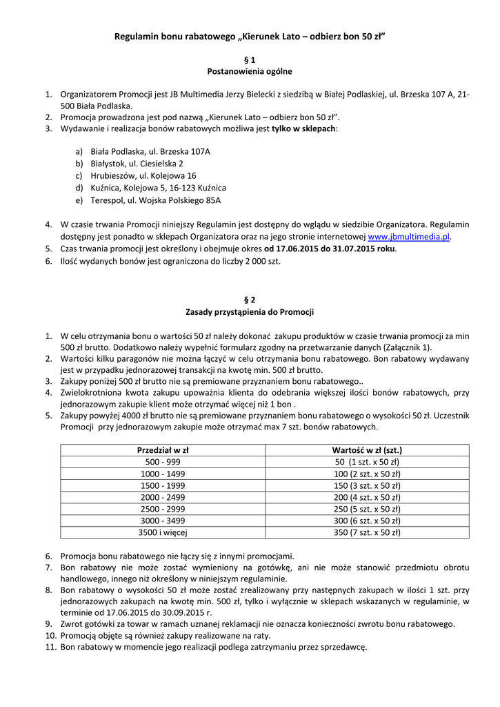 Regulamin bonu rabatowego „Kierunek Lato – odbierz bon 50 zł” §1 Postanowienia ogólne 1. Organizatorem Promocji jest JB Multimedia Jerzy Bielecki z siedzibą w Białej Podlaskiej, ul. Brzeska 107 A, 21500 Biała Podlaska. 2. Promocja prowadzona jest pod nazwą „Kierunek Lato – odbierz bon 50 zł”. 3. Wydawanie i realizacja bonów rabatowych możliwa jest tylko w sklepach: a) b) c) d) e) Biała Podlaska, ul. Brzeska 107A Białystok, ul. Ciesielska 2 Hrubieszów, ul. Kolejowa 16 Kuźnica, Kolejowa 5, 16-123 Kuźnica Terespol, ul. Wojska Polskiego 85A 4. W czasie trwania Promocji niniejszy Regulamin jest dostępny do wglądu w siedzibie Organizatora. Regulamin dostępny jest ponadto w sklepach Organizatora oraz na jego stronie internetowej www.jbmultimedia.pl. 5. Czas trwania promocji jest określony i obejmuje okres od 17.06.2015 do 31.07.2015 roku. 6. Ilość wydanych bonów jest ograniczona do liczby 2 000 szt. §2 Zasady przystąpienia do Promocji 1. W celu otrzymania bonu o wartości 50 zł należy dokonać zakupu produktów w czasie trwania promocji za min 500 zł brutto. Dodatkowo należy wypełnić formularz zgodny na przetwarzanie danych (Załącznik 1). 2. Wartości kilku paragonów nie można łączyć w celu otrzymania bonu rabatowego. Bon rabatowy wydawany jest w przypadku jednorazowej transakcji na kwotę min. 500 zł brutto. 3. Zakupy poniżej 500 zł brutto nie są premiowane przyznaniem bonu rabatowego.. 4. Zwielokrotniona kwota zakupu upoważnia klienta do odebrania większej ilości bonów rabatowych, przy jednorazowym zakupie klient może otrzymać więcej niż 1 bon . 5. Zakupy powyżej 4000 zł brutto nie są premiowane przyznaniem bonu rabatowego o wysokości 50 zł. Uczestnik Promocji przy jednorazowym zakupie może otrzymać max 7 szt. bonów rabatowych. Przedział w zł 500 - 999 1000 - 1499 1500 - 1999 2000 - 2499 2500 - 2999 3000 - 3499 3500 i więcej Wartość w zł (szt.) 50 (1 szt. x 50 zł) 100 (2 szt. x 50 zł) 150 (3 szt. x 50 zł) 200 (4 szt. x 50 zł) 250 (5 szt. x 50 zł) 300 (6 szt. x 50 zł) 350 (7 szt. x 50 zł) 6. Promocja bonu rabatowego nie łączy się z innymi promocjami. 7. Bon rabatowy nie może zostać wymieniony na gotówkę, ani nie może stanowić przedmiotu obrotu handlowego, innego niż określony w niniejszym regulaminie. 8. Bon rabatowy o wysokości 50 zł może zostać zrealizowany przy następnych zakupach w ilości 1 szt. przy jednorazowych zakupach na kwotę min. 500 zł, tylko i wyłącznie w sklepach wskazanych w regulaminie, w terminie od 17.06.2015 do 30.09.2015 r. 9. Zwrot gotówki za towar w ramach uznanej reklamacji nie oznacza konieczności zwrotu bonu rabatowego. 10. Promocją objęte są również zakupy realizowane na raty. 11. Bon rabatowy w momencie jego realizacji podlega zatrzymaniu przez sprzedawcę. 12. Sprzedawca sklepu biorącego udział w Promocji, uprawniony jest do odmówienia przyjęcia bonu rabatowego, jeżeli przedłożony bon budzi jego wątpliwości, co do autentyczności i legalności pochodzenia. Pracownik ma obowiązek odmówić przyjęcia bonu upominkowego jeżeli minął okres jego ważności. 13. Warunkiem udziału w Promocji jest przestrzeganie postanowień niniejszego regulaminu oraz podanie prawdziwych i poprawnych danych w Formularzu zgłoszeniowym. W przypadku powzięcia uzasadnionych wątpliwości co do prawdziwości oświadczeń lub prawidłowości działań Uczestnika w tym zakresie, Uczestnik będzie zobowiązany do przedstawienia na żądanie Organizatora dowodów potwierdzających dane lub oświadczenia Uczestnika, np. oryginałów faktur lub paragonów potwierdzających zakup Produktu w terminie trwania Programu lub zdjęcia opakowania Produktu lub tabliczki znamionowej Produktu, umożliwiającego weryfikację nazwy i modelu zakupionego Produktu, w przypadku gdy z faktury lub paragonu nie wynika jednoznacznie zakup Produktu objętego Programem. §3 Reklamacje 1) Reklamacje związane z przebiegiem Promocji mogą być zgłaszane przez uczestnika Promocji w formie pisemnej, w wysłanym zgłoszeniu na adres Organizatora: JB Multimedia Jerzy Bielecki, ul. Brzeska 107A, 21500 Biała Podlaska z dopiskiem „Kierunek Lato – odbierz bon 50” lub osobiście we wskazanych Sklepach. Przepisy dotyczące reklamacji znajdujące się w regulaminie nie uchybiają przepisom ustawy o szczególnych warunkach sprzedaży konsumenckiej oraz o zmianie Kodeksu cywilnego z dnia 27 lipca 220 r. (Dz. U. 2002 Nr 141, poz. 1176) 2) Reklamacja może być zgłoszona wyłącznie pisemnie. O dochowaniu terminu decyduje data wpłynięcia reklamacji do siedziby firmy lub sklepu. 3) Reklamacja powinna zawierać dane Uczestnika takie jak: imię, nazwisko, adres do korespondencji (do doręczania listów), jak również dokładny opis i powód reklamacji. 4) Reklamacje będą rozpatrywane w terminie 21 dni roboczych od dnia ich złożenia (otrzymania przez Organizatora). Organizator telefonicznie lub pisemnie zawiadomi Uczestnika o sposobie załatwienia reklamacji. §4 Dane Osobowe 1) W przypadku określonym w § 4, administratorem danych osobowych jest Organizator. Dane osobowe będą przetwarzane w zakresie określonym w § 4 pkt.2 w przypadku składanych reklamacji przez Uczestnika – w celu ich rozpatrzenia. Podanie danych jest dobrowolne, niemniej niepodanie przez Uczestnika danych wymaganych w zgłoszeniu ewentualnej reklamacji może uniemożliwić jej rozpatrzenie. Każdemu Uczestnikowi, który poda swoje dane w związku ze zgłoszeniem ewentualnej reklamacji przysługuje prawo dostępu do treści swoich danych osobowych i ich poprawiania. §5 Postanowienia końcowe 1) Wzięcie udziału w Promocji oznacza zgodę jej uczestnika na warunki promocji określone niniejszym regulaminem. 2) W sprawach nieuregulowanych niniejszym regulaminem zastosowanie maja odpowiednie przepisy kodeksu cywilnego. Wszelkie spory wynikłe z tytułu wykonania zobowiązań związanych z niniejszą Promocją będą rozstrzygane p