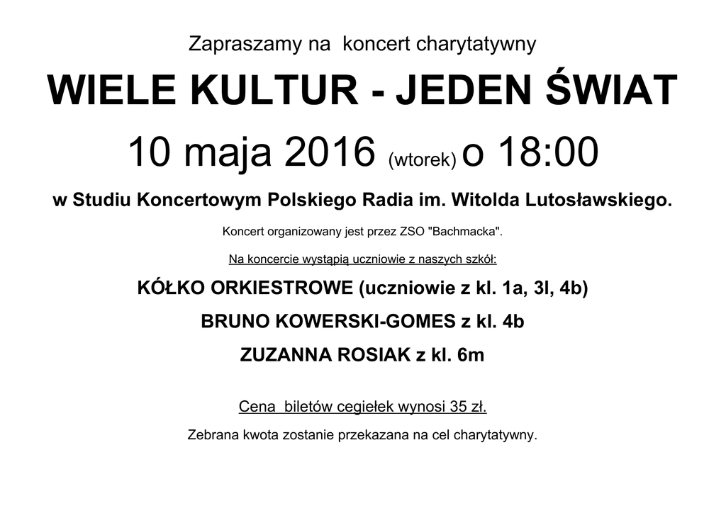 Zapraszamy na koncert charytatywny WIELE KULTUR - JEDEN ŚWIAT 10 maja 2016 (wtorek) o 18:00 w Studiu Koncertowym Polskiego Radia im. Witolda Lutosławskiego. Koncert organizowany jest przez ZSO "Bachmacka". Na koncercie wystąpią uczniowie z naszych szkół: KÓŁKO ORKIESTROWE (uczniowie z kl. 1a, 3l, 4b) BRUNO KOWERSKI-GOMES z kl. 4b ZUZANNA ROSIAK z kl. 6m Cena biletów cegiełek wynosi 35 zł. Zebrana kwota zostanie przekazana na cel charytatywny.