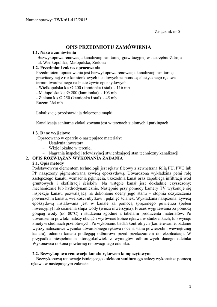 Numer sprawy: TWK/61-412/2015 Załącznik nr 5 OPIS PRZEDMIOTU ZAMÓWIENIA 1.1. Nazwa zamówienia Bezwykopowa renowacja kanalizacji sanitarnej grawitacyjnej w Jastrzębiu-Zdroju ul. Wielkopolska, Małopolska, Zielona 1.2. Przedmiot i zakres opracowania Przedmiotem opracowania jest bezwykopowa renowacja kanalizacji sanitarnej grawitacyjnej z rur kamionkowych i stalowych za pomocą elastycznego rękawa termoutwardzalnego na bazie żywic epoksydowych. - Wielkopolska k.s Ø 200 (kamionka i stal) - 116 mb - Małopolska k.s Ø 200 (kamionka) - 103 mb - Zielona k.s Ø 250 (kamionka i stal) - 45 mb Razem 264 mb Lokalizację przedstawiają dołączone mapki Kanalizacja sanitarna zlokalizowana jest w terenach zielonych i parkingach 1.3. Dane wyjściowe Opracowano w oparciu o następujące materiały: - Ustalenia inwestora - Wizje lokalne w terenie, - Nagrania inspekcji telewizyjnej stwierdzającej stan techniczny kanalizacji. 2. OPIS ROZWIĄZAŃ WYKONANIA ZADANIA 2.1. Opis metody Podstawowym elementem technologii jest rękaw filcowy z zewnętrzną folią PU, PVC lub PP nasączony pigmentowaną żywicą epoksydową. Utwardzona wykładzina pełni rolę zastępczego kanału, wzmacnia pęknięcia, uszczelnia kanał oraz zapobiega infiltracji wód gruntowych i eksfiltracji ścieków. Na wstępie kanał jest dokładnie czyszczony: mechanicznie lub hydrodynamicznie. Następnie przy pomocy kamery TV wykonuje się inspekcję kanału pozwalającą na dokonanie oceny jego stanu – stopnia oczyszczenia powierzchni kanału, wielkości ubytków i pęknięć ścianek. Wykładzina nasączona żywicą epoksydową instalowana jest w kanale za pomocą sprężonego powietrza (bęben inwersyjny) lub ciśnienia słupa wody (wieża inwersyjna). Proces wygrzewania za pomocą gorącej wody (do 80°C) i studzenia zgodnie z tabelami producenta materiałów. Po utwardzeniu powłoki należy obciąć i wyrównać końce rękawa w studzienkach, lub wyciąć kinety w studniach przelotowych. Po wykonaniu badań kontrolnych (kamerowanie, badanie wytrzymałościowe wycinka utwardzonego rękawa i ocena stanu powierzchni wewnętrznej kanału), odcinki kanału podlegają odbiorowi przed przekazaniem do eksploatacji. W przypadku niespełnienia któregokolwiek z wymogów odbiorowych danego odcinka Wykonawca dokona powtórnej renowacji tego odcinka. 2.2. Bezwykopowa renowacja kanału rękawem kompozytowym Bezwykopową renowację istniejącego kolektora sanitarnego należy wykonać za pomocą rękawa w następującym zakresie: 1 Numer sprawy: TWK/61-412/2015 Lp. Rodzaj Jednostka 1 2 3 1. 2. 3. Kanał sanitarny kamionka i stal DN200 m Kanał sanitarny kamionka DN200 m Kanał sanitarny DN250 m Długość całkowita kanału Ilość 4 116 103 45 264 m Elastyczny rękaw do renowacji wykonany jest z poliestrowej włókniny o strukturze filcowej absorbującej żywice, pokryty elastyczną powłoką poliuretanową, polipropylenową lub polietylenową. Włóknina nasączona jest dwukomponentowymi żywicami epoksydowymi (utwardzacz i żywica). Przy renowacji przewodu niedopuszczalne jest zmiana trasy jego ułożenia, jak również niedopuszczalne jest stosowanie innych technologii poza opisanymi w specyfikacji. Niedopuszczalne jest stosowanie żywic poliestrowych. Rękaw wzmacniający musi spełniać wszystkie z następujących wymagań, co musi być udokumentowane w dołączonej do oferty dokumentach niezależnych instytucji: a) nasączone żywicami termoutwardzalnymi powierzchnie po utwardzeniu rękawa powinny być gładkie, pozbawione wad w postaci niejednorodności i wtrąceń ciał obcych, końce rękawa powinny być obcięte równo i prostopadle do osi, b) nasączanie rękawa przy zastosowaniu podciśnienia, w warunkach kontrolowanych. c) barwa rękawa przed zainstalowaniem powinna być na całej jego powierzchni jednakowa pod względem odcienia i intensywności, zabrania się stosowania żywic bezbarwnych d) należy stosować żywice nie zawierające styrenu e) moduł sprężystości krótkoterminowy nie mniejszy niż 2500MPa wg PN-EN ISO178, f) minimalna grubość konstrukcyjna (po utwardzeniu) rękawa: Ø200 – 4,5mm Ø250 – 6,0 mm g) sztywność obwodowa krótkoterminowa S powinna być nie mniejsza niż 2,0 kN/m2 (lub wyższy zależnie od stanu technicznego przewodu) oraz liczona na podstawie wzoru: E S= d [12 × ( m ) 3 ] e gdzie: E – krótkoterminowy moduł sprężystości E [MPa] wg PN-EN ISO178 e - grubość ścianki [m] [m] dm - średnia średnica rękawa dm=dw+(dz-dw)/2 dz – średnica zewnętrzna rękawa [m] dw – średnica wewnętrzna rękawa [m] h) maksymalne zmniejszenie średnicy przewodu po renowacji 8%, i) odporność chemiczna w zakresie pH 6÷9 i temperatury do 60°C, j) odporność chemiczna na wpływ zalegających osadów, k) wymiary rękawa dobrane do średnicy kanału (należy bezwzględnie wykonać pomiary średnicy wewnętrznej istniejącego kolektora przed przystąpieniem do robót w celu optymalnego doboru wymiarów rękawa), l) przyleganie rękawa do powierzchni wewnętrznej kanału na całej długości równomiernego utwardzenia rękawa, rękaw po utwardzeniu nie powinien wykazywać skurczu, 2 Numer sprawy: TWK/61-412/2015 m) po renowacji kanał powinien być szczelny, n) Zastosowany rodzaj rękawa winien w połączeniu z istniejącym kanałem gwarantować przeniesienie obciążeń statycznych, mechanicznych i dynamicznych występujących w ulicach i terenach w którym przebiegają modernizowane kanały, rękaw po renowacji musi trwale związać się z rurą poprzez sklejenie o) Renowację należy przeprowadzić z istniejących studzienek lub komór (dopuszcza się częściowy demontaż konstrukcji studni). p) Instalacja rękawa w przewodzie należy wykonać metodą inwersji. Nie dopuszcza się wciągania wykładziny renowacyjnej q) zapewnienie właściwego stanu kanału po renowacji w postaci jednorodnej powierzchni kanału, odkształcenia, nieregularności wykładziny dopuszczalne są w przypadku zmiennej