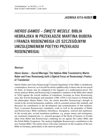 „Przekładaniec” nr 26/2012, s. 9–35 DOI:10.4467/16891864PC.12.001.0834 JADWIGA KITA-HUBER HIEROS GAMOS – ŚWIĘTE WESELE. BIBLIA HEBRAJSKA W PRZEKŁADZIE MARTINA BUBERA I FRANZA ROSENZWEIGA (ZE SZCZEGÓLNYM UWZGLĘDNIENIEM POETYKI PRZEKŁADU ROSENZWEIGA) Abstract Hieros Gamos – Sacred Marriage. The Hebrew Bible Translated by Martin Buber and Franz Rosenzweig (with a Special Focus on Rosenzweig’s Poetics of Translation) Martin Buber and Franz Rosenzweig’s German translation of the Bible is doubtlessly a masterpiece; however, as it reveals its artistic qualities only to those who do not search for them, its beauty may be compared to the elegance of a mathematical proof. The article analyses Buber and Rosenzweig’s cooperative rendition of the Bible (first edited in 1926) against the Jewish tradition of translation, focusing on Franz Rosenzweig, since this Jewish theologian and translator (1886–1929) is less known in Poland than the philosopher Martin Buber. First, the article describes Rosenzweig’s thought as rooted in the Jewish hermeneutic tradition, with its essential notions like midrash, and discusses his contribution to the development and systematization of that tradition. Next, it presents Rosenzweig’s translatory work as well as the principles of Buber and Rosenzweig’s Bible translation (literalness, foreignness, renewal and repetition). In the second part, several translation problems, e.g. proper names and neologisms, are examined comparatively, i.e. selected passages of the Book of Genesis or Exodus taken from Buber and Rosenzweig’s rendering are set against the Luther Bible and the Polish Biblia Tysiąclecia. The analysis highlights Rosenzweig’s contribution to the new German Bible. The article closes with some comments on the reception of the new Bible in Germany, particularly in the interwar period. Publikacja objęta jest prawem autorskim. Wszelkie prawa zastrzeżone. Kopiowanie i rozpowszechnianie zabronione. Publikacja przeznaczona jedynie dla klientów indywidualnych. Zakaz rozpowszechniania i udostępniania serwisach bibliotecznych ■ 10 JADWIGA KITA-HuBER Key words: Bible translation, translation in the hermeneutic tradition of Judaism, Martin Buber and Franz Rosenzweig as translators, Luther Bible, word-for-word translation Słowa klucze: przekład Biblii, przekład w hermeneutycznej tradycji judaizmu, Biblia w przekładzie Martina Bubera i Franza Rosenzweiga, Biblia Lutra, przekład dosłowny Wprowadzenie Niewątpliwie przekład Biblii hebrajskiej dokonany przez Martina Bubera (1878–1965) i Franza Rosenzweiga (1886–1929), charakteryzujący się obsesyjną wręcz dążnością do wierności oryginałowi hebrajskiemu, zasługuje na miano arcydzieła. Jest to jednak arcydzieło przewrotne, niedające się opisać za pomocą tradycyjnych kategorii estetycznych i stawiające niejednego krytyka przekładu przed zupełnie nowym wyzwaniem. Bo jakże opisać przekład, który swój artyzm objawia tylko temu, kto nie szuka w nim dzieła sztuki, lub – posługując się celnym porównaniem Rosenzweiga – którego piękno da się porównać tylko z elegancją dowodu matematycznego? Celem tego szkicu jest charakterystyka Biblii hebrajskiej w niemieckim przekładzie Bubera i Rosenzweiga oraz szczegółowa analiza warsztatu tłumaczy na przykładzie kilku problemów translatorskich. Na początek przedstawione zostaną wybrane elementy żydowskiej tradycji hermeneutycznej, w której zakorzenione jest tłumaczenie Bubera i Rosenzweiga, będące niejako jej rezultatem. Punktem odniesienia będą pisma Franza Rosenzweiga – myśliciela i filozofa mniej znanego w Polsce niż Martin Buber – który pozostawił po sobie nie tylko wybitne przekłady, lecz także oryginalną i, niestety, właściwie zapomnianą już dziś teorię przekładu. Krótka rekonstrukcja tej teorii, organicznie zespolonej z rozważaniami Rosenzweiga na temat języka i mowy, pozwoli zrozumieć niektóre kontrowersyjne decyzje w samym przekładzie Biblii hebrajskiej, gdzie myśl teoretyczna bezpośrednio przekłada się na konkretne rozwiązania translatorskie. Właśnie w tym ścisłym zespoleniu teorii z praktyką należałoby szukać odpowiedzi na pytanie, dlaczego wielokrotnie rewidowany i wznawiany przekład Bubera i Rosenzweiga uznawany jest do dziś za rewolucyjny1. Szkic stanowi rozszerzoną i częściowo zmienioną wersję artykułu Przekład w świetle tradycji żydowskiej. Franz Rosenzweig jako współtłumacz Biblii, w: Językowy obraz świata w oryginale i przekładzie, red. A. Szczęsny, K. Hejwowski, Siedlce: ZUP SPRINT 2007, s. 205–222. 1 Publikacja objęta jest prawem autorskim. Wszelkie prawa zastrzeżone. Kopiowanie i rozpowszechnianie zabronione. Publikacja przeznaczona jedynie dla klientów indywidualnych. Zakaz rozpowszechniania i udostępniania serwisach bibliotecznych