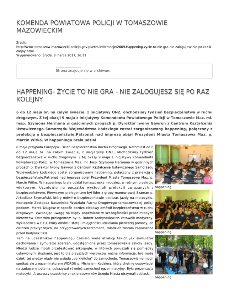 KOMENDA POWIATOWA POLICJI W TOMASZOWIE MAZOWIECKIM Źródło: http://www.tomaszow-mazowiecki.policja.gov.pl/etm/informacje/2609,Happening-zycie-to-nie-gra-nie-zalogujesz-sie-po-raz-k olejny.html Wygenerowano: Środa, 8 marca 2017, 16:11 Strona znajduje się w archiwum. HAPPENING- ŻYCIE TO NIE GRA - NIE ZALOGUJESZ SIĘ PO RAZ KOLEJNY 6 do 12 maja br. na całym świecie, z inicjatywy ONZ, obchodzimy tydzień bezpieczeństwa w ruchu drogowym. Z tej okazji 9 maja z inicjatywy Komendanta Powiatowego Policji w Tomaszowie Maz. mł. Insp. Szymona Hermana w gościnnych progach p. Dyrektor Iwony Gawron z Centrum Kształcenia Ustawicznego Samorządu Województwa Łódzkiego został zorganizowany happening, połączony z prelekcją o bezpieczeństwie.Patronat nad imprezą objął Prezydent Miasta Tomaszowa Maz. p. Marcin Witko. W happeningu brała udział 6 maja przypada Europejski Dzień Bezpieczeństwa Ruchu Drogowego. Natomiast od 6 do 12 maja br. na całym świecie, z inicjatywy ONZ, obchodzimy tydzień bezpieczeństwa w ruchu drogowym. Z tej okazji 9 maja z inicjatywy Komendanta Powiatowego Policji w Tomaszowie Maz. mł. Insp. Szymona Hermana w gościnnych progach p. Dyrektor Iwony Gawron z Centrum Kształcenia Ustawicznego Samorządu Województwa Łódzkiego został zorganizowany happening, połączony z prelekcją o bezpieczeństwie.Patronat nad imprezą objął Prezydent Miasta Tomaszowa Maz. p. Marcin Witko. W happeningu brała udział tomaszowska młodzież, w różnym przekroju wiekowym. Uczniowie na początku wysłuchali prelekcji związanych z happening bezpieczeństwem. Pierwszym prelegentem był lider z grupy manewrowej Szaman p. Arkadiusz Szymański, który mówił o bezpieczeństwie podczas jazdy na motocyklu. Następnie Zastępca Naczelnika Wydziału Ruchu Drogowego tomaszowskiej policji podkom. Marek Długosz w sposób bardzo ciekawy omówił bezpieczeństwo w ruchu drogowym, zwracając uwagę na błędy popełniane w szczególności przez młodych kierowców. Ostatnim prelegentem był p. Robert Andryszkiewicz- ratownik medyczny, wykładowca w CKU, który omówił istotę umiejętności udzielania pierwszej pomocy, do ćwiczeń praktycznych, na przygotowanych fantomach, młodzież została zaproszona przed budynek CKU. happening Tam na uczestników happeningu czekało wiele atrakcji takich jak symulator dachowania i symulator zderzeń, udostępnione przez tomaszowskie szkoły jazdy. Młodzi ludzie mogli przetestować alkogogle, w których poruszali się pomiędzy ustawionymi słupkami, jest to dla przyszłych kierowców ważna informacja, być może dzięki tej wiedzy nigdy nie wsiądą „po kielichu” do samochodu. Tomaszowianie mogli spotkać się z egzaminatorem WORDU p. Michałem Kędziorą, który chętnie odpowiadał na zadawane pytania, pokazywał również samochód egzaminacyjny. Była prezentacja motocykli. A wszyscy uczestnicy z rąk pracowników Urzędu Miasta otrzymali odblaski. happening Ocena: 1/5 (2) Tweetnij happening, bezpieczeństwo