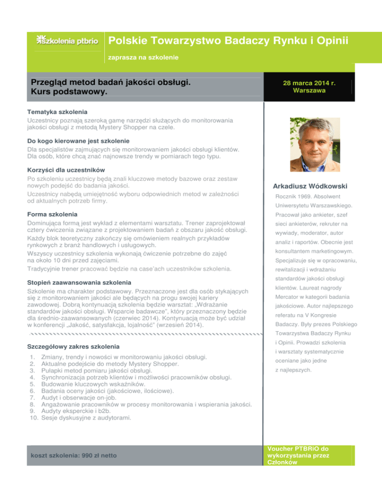 Polskie Towarzystwo Badaczy Rynku i Opinii zaprasza na szkolenie Przegląd metod badań jakości obsługi. Kurs podstawowy. 28 marca 2014 r. Warszawa Tematyka szkolenia Uczestnicy poznają szeroką gamę narzędzi służących do monitorowania jakości obsługi z metodą Mystery Shopper na czele. Do kogo kierowane jest szkolenie Dla specjalistów zajmujących się monitorowaniem jakości obsługi klientów. Dla osób, które chcą znać najnowsze trendy w pomiarach tego typu. Korzyści dla uczestników Po szkoleniu uczestnicy będą znali kluczowe metody bazowe oraz zestaw nowych podejść do badania jakości. Uczestnicy nabędą umiejętność wyboru odpowiednich metod w zależności od aktualnych potrzeb firmy. Forma szkolenia Dominująca formą jest wykład z elementami warsztatu. Trener zaprojektował cztery ćwiczenia związane z projektowaniem badań z obszaru jakość obsługi. Każdy blok teoretyczny zakończy się omówieniem realnych przykładów rynkowych z branż handlowych i usługowych. Wszyscy uczestnicy szkolenia wykonają ćwiczenie potrzebne do zajęć na około 10 dni przed zajęciami. Tradycyjnie trener pracować będzie na case’ach uczestników szkolenia. Stopień zaawansowania szkolenia Szkolenie ma charakter podstawowy. Przeznaczone jest dla osób stykających się z monitorowaniem jakości ale będących na progu swojej kariery zawodowej. Dobrą kontynuacją szkolenia będzie warsztat: „Wdrażanie standardów jakości obsługi. Wsparcie badawcze”, który przeznaczony będzie dla średnio-zaawansowanych (czerwiec 2014). Kontynuacją może być udział w konferencji „Jakość, satysfakcja, lojalność” (wrzesień 2014). Arkadiusz Wódkowski Rocznik 1969. Absolwent Uniwersytetu Warszawskiego. Pracował jako ankieter, szef sieci ankieterów, rekruter na wywiady, moderator, autor analiz i raportów. Obecnie jest konsultantem marketingowym. Specjalizuje się w opracowaniu, rewitalizacji i wdrażaniu standardów jakości obsługi klientów. Laureat nagrody Mercator w kategorii badania jakościowe. Autor najlepszego referatu na V Kongresie Badaczy. Były prezes Polskiego Towarzystwa Badaczy Rynku Szczegółowy zakres szkolenia 1. 2. 3. 4. 5. 6. 7. 8. 9. 10. Zmiany, trendy i nowości w monitorowaniu jakości obsługi. Aktualne podejście do metody Mystery Shopper. Pułapki metod pomiaru jakości obsługi. Synchronizacja potrzeb klientów i możliwości pracowników obsługi. Budowanie kluczowych wskaźników. Badania oceny jakości (jakościowe, ilościowe). Audyt i obserwacje on-job. Angażowanie pracowników w procesy monitorowania i wspierania jakości. Audyty eksperckie i b2b. Sesje dyskusyjne z audytorami. koszt szkolenia: 990 zł netto i Opinii. Prowadzi szkolenia i warsztaty systematycznie oceniane jako jedne z najlepszych. Voucher PTBRiO do wykorzystania przez Członków