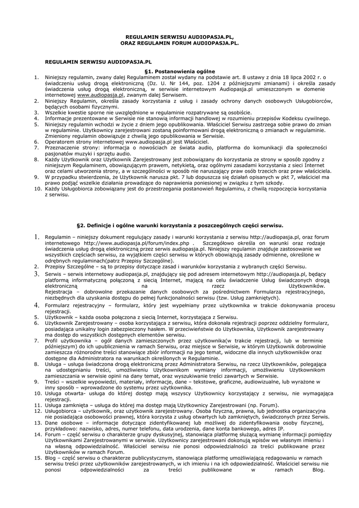 REGULAMIN SERWISU AUDIOPASJA.PL, ORAZ REGULAMIN FORUM AUDIOPASJA.PL. REGULAMIN SERWISU AUDIOPASJA.PL §1. Postanowienia ogólne Niniejszy regulamin, zwany dalej Regulaminem został wydany na podstawie art. 8 ustawy z dnia 18 lipca 2002 r. o świadczeniu usług drogą elektroniczną (Dz. U. Nr 144, poz. 1204 z późniejszymi zmianami) i określa zasady świadczenia usług drogą elektroniczną, w serwisie internetowym Audiopasja.pl umieszczonym w domenie internetowej www.audiopasja.pl, zwanym dalej Serwisem. 2. Niniejszy Regulamin, określa zasady korzystania z usług i zasady ochrony danych osobowych Usługobiorców, będących osobami fizycznymi. 3. Wszelkie kwestie sporne nie uwzględnione w regulaminie rozpatrywane są osobiście. 4. Informacje prezentowane w Serwisie nie stanowią informacji handlowej w rozumieniu przepisów Kodeksu cywilnego. 5. Niniejszy regulamin wchodzi w życie z dniem jego opublikowania. Właściciel Serwisu zastrzega sobie prawo do zmian w regulaminie. Użytkownicy zarejestrowani zostaną poinformowani drogą elektroniczną o zmianach w regulaminie. Zmieniony regulamin obowiązuje z chwilą jego opublikowania w Serwisie. 6. Operatorem strony internetowej www.audiopasja.pl jest Właściciel. 7. Przeznaczenie strony: informacja o nowościach ze świata audio, platforma do komunikacji dla społeczności pasjonatów muzyki i sprzętu audio. 8. Każdy Użytkownik oraz Użytkownik Zarejestrowany jest zobowiązany do korzystania ze strony w sposób zgodny z niniejszym Regulaminem, obowiązującym prawem, netykietą, oraz ogólnymi zasadami korzystania z sieci Internet oraz celami utworzenia strony, a w szczególności w sposób nie naruszający praw osób trzecich oraz praw właściciela. 9. W przypadku stwierdzenia, że Użytkownik narusza pkt. 7 lub dopuszcza się działań opisanych w pkt 7, właściciel ma prawo podjąć wszelkie działania prowadzące do naprawienia poniesionej w związku z tym szkody. 10. Każdy Usługobiorca zobowiązany jest do przestrzegania postanowień Regulaminu, z chwilą rozpoczęcia korzystania z serwisu. 1. §2. Definicje i ogólne warunki korzystania z poszczególnych części serwisu. 1. 2. Regulamin – niniejszy dokument regulujący zasady i warunki korzystania z serwisu http://audiopasja.pl, oraz forum internetowego http://www.audiopasja.pl/forum/index.php . Szczegółowo określa on warunki oraz rodzaje świadczenia usług drogą elektroniczną przez serwis audiopasja.pl. Niniejszy regulamin znajduje zastosowanie we wszystkich częściach serwisu, za wyjątkiem części serwisu w których obowiązują zasady odmienne, określone w odrębnych regulaminach(patrz Przepisy Szczególne). Przepisy Szczególne – są to przepisy dotyczące zasad i warunków korzystania z wybranych części Serwisu. 3. Serwis – serwis internetowy audiopasja.pl, znajdujący się pod adresem internetowym http://audiopasja.pl, będący platformą informatyczną połączoną z siecią Internet, mającą na celu świadczenie Usług świadczonych drogą elektroniczną na rzecz Użytkowników. Rejestracja – dobrowolne przekazanie danych osobowych za pośrednictwem Formularza rejestracyjnego, niezbędnych dla uzyskania dostępu do pełnej funkcjonalności serwisu (tzw. Usług zamkniętych). 4. Formularz rejestracyjny – formularz, który jest wypełniany przez użytkownika w trakcie dokonywania procesu rejestracji. Użytkownik – każda osoba połączona z siecią Internet, korzystająca z Serwisu. Użytkownik Zarejestrowany – osoba korzystająca z serwisu, która dokonała rejestracji poprzez oddzielny formularz, posiadająca unikalny login zabezpieczony hasłem. W przeciwieństwie do Użytkownika, Użytkownik zarejestrowany ma dostęp do wszystkich dostępnych elementów serwisu. Profil użytkownika – ogół danych zamieszczonych przez użytkownika(w trakcie rejestracji, lub w terminie późniejszym) do ich upublicznienia w ramach Serwisu, oraz miejsce w Serwisie, w którym Użytkownik dobrowolnie zamieszcza różnorodne treści stanowiące zbiór informacji na jego temat, widoczne dla innych użytkowników oraz dostępne dla Administratora na warunkach określonych w Regulaminie. Usługa – usługa świadczona drogą elektroniczną przez Administratora Serwisu, na rzecz Użytkowników, polegająca na udostępnianiu treści, umożliwieniu Użytkownikom wymiany informacji, umożliwieniu Użytkownikom zamieszczania w serwisie opinii na dany temat, oraz wyszukiwanie treści zawartych w Serwisie. Treści – wszelkie wypowiedzi, materiały, informacje, dane – tekstowe, graficzne, audiowizualne, lub wyrażone w inny sposób – wprowadzone do systemu przez użytkownika. Usługa otwarta- usługa do której dostęp mają wszyscy Użytkownicy korzystający z serwisu, nie wymagająca rejestracji. Usługa zamknięta – usługa do której ma dostęp mają Użytkownicy Zarejestrowani (np. Forum). Usługobiorca – użytkownik, oraz użytkownik zarejestrowany. Osoba fizyczna, prawna, lub jednostka organizacyjna nie posiadająca osobowości prawnej, która korzysta z usług otwartych lub zamkniętych, świadczonych przez Serwis. Dane osobowe – informacje dotyczące zidentyfikowanej lub możliwej do zidentyfikowania osoby fizycznej, przykładowo: nazwisko, adres, numer telefonu, data urodzenia, dane konta bankowego, adres IP. Forum – część serwisu o charakterze grupy dyskusyjnej, stanowiąca platformę służącą wymianę informacji pomiędzy Użytkownikami Zarejestrowanymi w serwisie. Użytkownicy zarejestrowani dokonują wpisów we własnym imieniu i na własną odpowiedzialność. Właściciel serwisu nie ponosi odpowiedzialności za treści publikowane przez Użytkowników w ramach Forum. Blog – część serwisu o charakterze publicystycznym, stanowiąca platformę umożliwiającą redagowaniu w ramach serwisu treści przez użytkowników zarejestrowanych, w ich imieniu i na ich odpowiedzialność. Właściciel serwisu nie ponosi odpowiedzialno