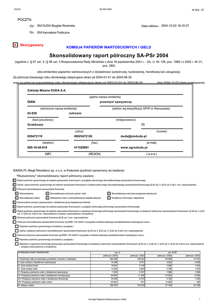 DUDA SA-PSr 2004 w tys. zl POCZTA Od : EM DUDA Brygida Rowinska Data odbioru : 2004-12-02 18:10:37 Do : EM Kancelaria Publiczna X Skorygowany KOMISJA PAPIERÓW WARTOSCIOWYCH I GIELD Skonsolidowany raport pólroczny SA-PSr 2004 (zgodnie z § 57 ust. 2 i § 58 ust. 3 Rozporzadzenia Rady Ministrów z dnia 16 pazdziernika 2001 r. - Dz. U. Nr 139, poz. 1569 i z 2002 r. Nr 31, poz. 280) (dla emitentów papierów wartosciowych o dzialalnosci wytwórczej, budowlanej, handlowej lub uslugowej) Za pólrocze biezacego roku obrotowego obejmujace okres od 2004-01-01 do 2004-06-30 oraz za pólrocze poprzedniego roku obrotowego obejmujace okres od 2003-01-01 do 2003-06-30 dnia 2004-12-02 (data przekazania) Zaklady Miesne DUDA S.A. (pelna nazwa emitenta) DUDA przemysl spozywczy (skrócona nazwa emitenta) 63-930 (sektor wg klasyfikacji GPW w Warszawie) Jutrosin (kod pocztowy) (miejscowosc) Grabkowo 73 (ulica) 655472119 (numer) /065/5472126 (telefon) 699-18-48-816 [email protected] (fax) (e-mail) 411520891 (NIP) www.agroduda.pl (REGON) (www) IDMSA.PL-Biegli Rewidenci sp. z o.o. w Krakowie (podmiot uprawniony do badania) "Rozszerzony" skonsolidowany raport pólroczny zawiera : X Raport podmiotu uprawnionego do badania sprawozdan finansowych z przegladu pólrocznego skonsolidowanego sprawozdania finansowego X Opinie i raport podmiotu uprawnionego do badania sprawozdan finansowych z badania pólrocznego skonsolidowanego sprawozdania finansowego (§ 63 ust. 2 i § 62 ust. 6 pkt 2 ww. rozporzadzenia) X Pólroczne skonsolidowane sprawozdanie finansowe X Wprowadzenie X Skonsolidowany rachunek zysków i strat X Skonsolidowany rachunek przeplywów pienieznych X Skonsolidowany bilans X Zestawienie zmian w skonsolidowanym kapitale wlasnym X Dodatkowe informacje i objasnienia X Sprawozdanie zarzadu (sprawozdanie z dzialalnosci grupy kapitalowej emitenta) X Raport podmiotu uprawnionego do badania sprawozdan finansowych z przegladu skróconego pólrocznego sprawozdania finansowego X Raport podmiotu uprawnionego do badania sprawozdan finansowych o zgodnosci skróconego pólrocznego sprawozdania finansowego ze zbadanym pólrocznym sprawozdaniem finansowym (§ 58 ust. 3, § 63 ust. 2 i § 62 ust. 6 pkt 2 ww. rozporzadzenia i przepisy rozporzadzenia o prospekcie) X Skrócone pólroczne sprawozdanie finansowe (§ 58 ust. 3 ww. rozporzadzenia) Pólroczne skonsolidowane sprawozdanie finansowe wg MSR / US GAAP w przypadku emitenta bedacego przedsiebiorstwem leasingowym wraz z Raportem podmiotu uprawnionego do badania z przegladu / Opinia o badanym pólrocznym skonsolidowanym sprawozdaniu finansowym (§ 59 ust. 2, § 63 ust. 2 i § 62 ust. 6 pkt 2 ww. rozporzadzenia) Skrócone pólroczne sprawozdanie finansowe wg MSR / US GAAP w przypadku emitenta bedacego przedsiebiorstwem leasingowym wraz z Raportem podmiotu uprawnionego do badania z przegladu / Raportem o zgodnosci skróconego pólrocznego sprawozdania finansowego ze zbadanym pólrocznym sprawozdaniem finansowym (§ 59 ust. 2, § 58 ust. 3, § 63 ust. 2 i § 62 ust. 6 pkt 2 ww. rozporzadzenia i przepisy rozporzadzenia o prospekcie) WYBRANE DANE FINANSOWE I. Przychody netto ze sprzedazy produktów, towarów i materialów II. Zysk (strata) z dzialalnosci operacyjnej III. Zysk (strata) brutto IV. Zysk (strata) netto V. Przeplywy pieniezne netto z dzialalnosci operacyjnej VI. Przeplywy pieniezne netto z dzialalnosci inwestycyjnej VII. Przeplywy pieniezne netto z dzialalnosci finansowej VIII. Przeplywy pieniezne netto, razem IX. Aktywa, razem tys. zl pólrocze / 2004 262 480 14 298 16 061 13 236 7 205 -54 644 23 448 -23 991 259 787 Komisja Papierów Wartosciowych i Gield pólrocze / 2003 135 423 8 741 6 138 4 630 5 747 -11 305 6 375 817 103 353 tys. EUR pólrocze / 2004 55 480 3 022 3 395 2 798 1 586 -12 030 5 162 -5 282 57 194 pólrocze / 2003 31 413 2 028 1 424 1 074 1 289 -2 536 1 430 183 23 189 1 DUDA SA-PSr 2004 WYBRANE DANE FINANSOWE tys. zl pólrocze / 2004 127 940 44 962 76 692 118 880 43 142 4 314 200 3,07 0,00 27,56 X. Zobowiazania i rezerwy na zobowiazania XI. Zobowiazania dlugoterminowe XII. Zobowiazania krótkoterminowe XIII. Kapital wlasny XIV. Kapital zakladowy XV. Liczba akcji (w szt.) XVI. Zysk (strata) na jedna akcje zwykla (w zl / EUR) XVII. Rozwodniony zysk (strata) na jedna akcje zwykla (w zl / EUR) XVIII. Wartosc ksiegowa na jedna akcje (w zl / EUR) Komisja Papierów Wartosciowych i Gield w tys. zl pólrocze / 2003 45 998 15 202 30 774 57 028 33 142 3 314 200 1,40 17,21 tys. EUR pólrocze / 2004 28 167 9 899 16 884 26 172 9 498 4 314 200 0,65 0,00 6,07 pólrocze / 2003 10 320 3 411 6 905 12 795 7 436 3 314 200 0,31 3,86 2 DUDA SA-PSr 2004 w tys. zl INFORMACJE O KOREKCIE RAPORTU Skorygowany raportem biezacym nr 96/2004 z dnia 2004-12-02 o tresci : Raport 96/2004 Zarzad Zakladów Miesnych DUDA S.A. z siedziba w Warszawie podaje do publicznej wiadomosci korekte rozszerzonego skonsolidowanego pólrocznego raportu za I pólrocze 2004 r., przekazanego w dniu 30 wrzesnia 2004 r.: 1) w SA-PSr2004 wypelniono brakujaca Note 5F "Udzialy lub akcje w jednostkach podporzadkowanych - cd" 2)w "Notach objasniajacych do rachunku przeplywów pienieznych" zamieszczono brakujace dane odnosnie struktury srodków pienieznych przyjetych do skonsolidowanego rachunku przeplywów pienieznych: Srodki pieniezne przyjete do rachunku przeplywów srodków pienieznych to pieniadze oraz jednostki pieniezne krajowe i zagraniczne, w gotówce i na rachunku bankowym lub w formie lokaty pienieznej, czeki i weksle obce, platne w ciagu trzech miesiecy od daty ich wystawienia. Struktura srodków pienieznych tys. zl. Struktura Srodki pieniezne w kasie 16,40% Srodki pieniezne na rachunkach bankowych 83,60% Inne srodki pieniezne 0,00% Razem srodki pieniezne 100,00% Na poczatek okresu Struktura Na koniec okresu 777 2,28% 1663 33353 97,72% 8476 0 0,00% 0 34130 100,00% 10139 Zestawienie strumieni pienieznych generowanych przez poszczególne rodzaje dzialalnosci w tys. zl. Przeplywy pieniezne netto dz. Oper