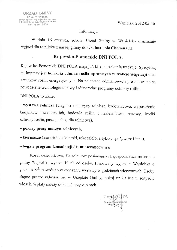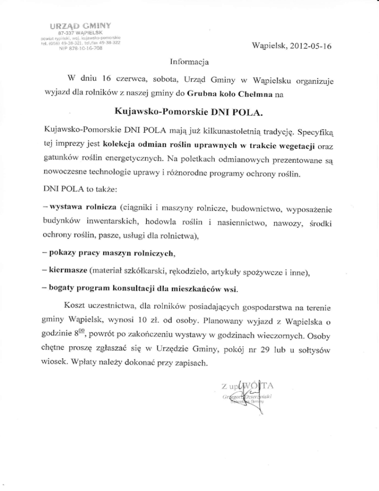 !JRzĄD GMlNY 87-337 WĄPlELsK pow]at ryp]ński' W!j. kUjawsko_pomorskie telJlat 49'33 322 N!P 878-10-16-708 tel. (056) 49'38 321, Wąpielsk, 2012-05-I6 Informacj a W dniu 16 czerwca, sobota, Urząd Gminy wyjazd' dla ro1ników znaszej gminy do w Wąpielsku organizuje Grubna koło Chełmna na Kujawsko-pomorskie DNI POLA. Kujawsko-Pomorskie DNI POLA mają juz kilkunastoletnią tradycję. Specyfiką tej imprezy jest kolekcja odmian roślinuprawnych w trakcie wegetacji oraz gatunków roślinenergetycznych' Na poletkach odmianowych prezentowane są nowoczesne technologie uplawy i róznorodne programy ocfuony roślin. DNI POLA totakże: - wystawa rolnicza (ciągniki i maszyny rolnicze, budownictwo, wyposażenie budynków inwentarskich, hodowla roślini nasierrnictwo, nawozy, środki ochrony roślin, pasze, usługi dla rolnictwa), - pokazy pracy maszyn rolniczych, - kiermasze (materiał szkółkarski, rękodzieło, artykuły spożywcze i inne), - bogaĘ program konsultacji dla mieszkańców wsi. Koszt uczestnictwa, dla rolników posiadających gospodarstwa na tęrenie gminy Wąpielsk, wynosi 10 zł. od osoby. P1anowaty wyjazd, z Wąpielska o godzinie 8@, powrót po zakoitczeniu wystawy w godzinach wieczomych' osoby chętne proszę zgłaszaÓ się w Urzędzie Gminy, pokój nr 29 ltft u sołtysów wiosek' Wpłaty nalezy dokonać przy zaplsach.