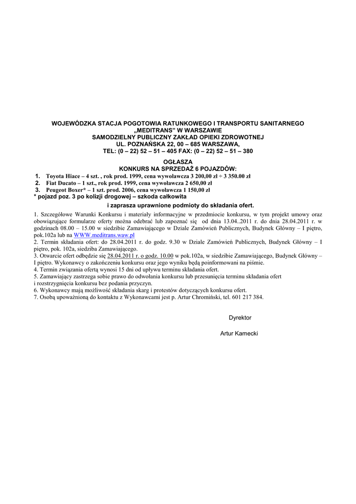 WOJEWÓDZKA STACJA POGOTOWIA RATUNKOWEGO I TRANSPORTU SANITARNEGO „MEDITRANS” W WARSZAWIE SAMODZIELNY PUBLICZNY ZAKŁAD OPIEKI ZDROWOTNEJ UL. POZNAŃSKA 22, 00 – 685 WARSZAWA, TEL: (0 – 22) 52 – 51 – 405 FAX: (0 – 22) 52 – 51 – 380 OGŁASZA KONKURS NA SPRZEDAś 6 POJAZDÓW: 1. Toyota Hiace – 4 szt. , rok prod. 1999, cena wywoławcza 3 200,00 zł ÷ 3 350.00 zł 2. Fiat Ducato – 1 szt., rok prod. 1999, cena wywoławcza 2 650,00 zł 3. Peugeot Boxer* – 1 szt. prod. 2006, cena wywoławcza 1 150,00 zł * pojazd poz. 3 po kolizji drogowej – szkoda całkowita i zaprasza uprawnione podmioty do składania ofert. 1. Szczegółowe Warunki Konkursu i materiały informacyjne w przedmiocie konkursu, w tym projekt umowy oraz obowiązujące formularze oferty moŜna odebrać lub zapoznać się od dnia 13.04..2011 r. do dnia 28.04.2011 r. w godzinach 08.00 – 15.00 w siedzibie Zamawiającego w Dziale Zamówień Publicznych, Budynek Główny – I piętro, pok.102a lub na WWW.meditrans.waw.pl 2. Termin składania ofert: do 28.04.2011 r. do godz. 9.30 w Dziale Zamówień Publicznych, Budynek Główny – I piętro, pok. 102a, siedziba Zamawiającego. 3. Otwarcie ofert odbędzie się 28.04.2011 r. o godz. 10.00 w pok.102a, w siedzibie Zamawiającego, Budynek Główny – I piętro. Wykonawcy o zakończeniu konkursu oraz jego wyniku będą poinformowani na piśmie. 4. Termin związania ofertą wynosi 15 dni od upływu terminu składania ofert. 5. Zamawiający zastrzega sobie prawo do odwołania konkursu lub przesunięcia terminu składania ofert i rozstrzygnięcia konkursu bez podania przyczyn. 6. Wykonawcy mają moŜliwość składania skarg i protestów dotyczących konkursu ofert. 7. Osobą upowaŜnioną do kontaktu z Wykonawcami jest p. Artur Chromiński, tel. 601 217 384. Dyrektor Artur Kamecki