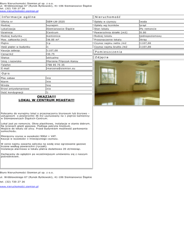 Biuro Nieruchomości Siemion.pl sp. z o.o. ul. Wróblewskiego 67 (Rynek Bytkowski), 41-106 Siemianowice Śląskie tel. (32) 720 27 26 www.nieruchomości.siemion.pl Informacje ogólne Nieruchomość Oferta nr SEM-LW-2525 Opłaty w czynszu woda Rodzaj wynajem Opłaty wg liczników prąd Lokalizacja Siemianowice Śląskie Stan lokalu Po remoncie Dzielnica Centrum Powierzchnia działki [m2] 0.00 Rodzaj budynku kamienica Rodzaj lokalu jednopoziomowy Pow. całkowita [m2] 36.00 m² Przeznaczenie lokalu Array Piętro 1p Czynsz najmu netto /m2 1107,00 Ilość pięter w budynku 1 Czynsz najmu brutto /m2 1107,00 Kaucja zabezp. 1107,00 Cena/m2 30.75 Status aktualna Imię i nazwisko Marzena Filipczyk-Kansy Telefon 798 95 75 35 E-mail [email protected] Opis Plac zabaw nie Alarm nie Winda nie Drzwi antywłamaniowe nie Ilość kondygnacji 1 OKAZJA!!! LOKAL W CENTRUM MIASTA!!! Polecamy do wynajmu lokal o przeznaczeniu biurowym lub biurowo – usługowym o powierzchni 36 m2 usytuowany na 1 piętrze kamienicy w Siemianowicach Śląskich-Centrum. Lokal jest po remoncie. Okna plastikowe, instalacje w stanie dobrym. Na ścianach gładź gipsowa. Podłoga pokryta linoleum. Wejście do lokalu od ulicy. Przed budynkiem możliwość parkowania samochodu. Miesięczny czynsz w wysokości 900zł + VAT. Kaucja w wysokości 1-miesięcznego czynszu. W cenie najmu zawarta zaliczka na wodę oraz ogrzewanie gazowe liczone według powierzchni (ryczałt). Instalacja alarmowa w lokalu płatna dodatkowo 20 zł/miesiąc. Zachęcamy do oględzin po wcześniejszym umówieniu się z naszym pośrednikiem. Biuro Nieruchomości Siemion.pl sp. z o.o. ul. Wróblewskiego 67 (Rynek Bytkowski), 41-106 Siemianowice Śląskie tel. (32) 720 27 26 www.nieruchomości.siemion.pl Pomieszczenia Zdjęcia