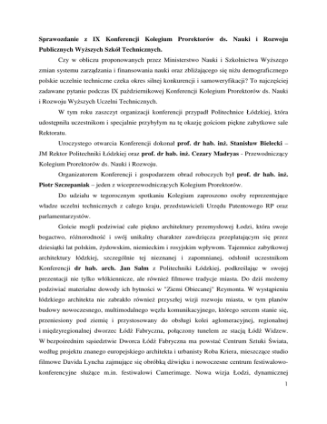 Sprawozdanie z IX Konferencji Kolegium Prorektorów ds. Nauki i Rozwoju Publicznych Wyższych Szkół Technicznych. Czy w obliczu proponowanych przez Ministerstwo Nauki i Szkolnictwa Wyższego zmian systemu zarządzania i finansowania nauki oraz zbliżającego się niżu demograficznego polskie uczelnie techniczne czeka okres silnej konkurencji i samoweryfikacji? To najczęściej zadawane pytanie podczas IX październikowej Konferencji Kolegium Prorektorów ds. Nauki i Rozwoju Wyższych Uczelni Technicznych. W tym roku zaszczyt organizacji konferencji przypadł Politechnice Łódzkiej, która udostępniła uczestnikom i specjalnie przybyłym na tę okazję gościom piękne zabytkowe sale Rektoratu. Uroczystego otwarcia Konferencji dokonał prof. dr hab. inż. Stanisław Bielecki – JM Rektor Politechniki Łódzkiej oraz prof. dr hab. inż. Cezary Madryas - Przewodniczący Kolegium Prorektorów ds. Nauki i Rozwoju. Organizatorem Konferencji i gospodarzem obrad roboczych był prof. dr hab. inż. Piotr Szczepaniak – jeden z wiceprzewodniczących Kolegium Prorektorów. Do udziału w tegorocznym spotkaniu Kolegium zaproszono osoby reprezentujące władze uczelni technicznych z całego kraju, przedstawicieli Urzędu Patentowego RP oraz parlamentarzystów. Goście mogli podziwiać całe piękno architektury przemysłowej Łodzi, która swoje bogactwo, różnorodność i swój unikalny charakter zawdzięcza przeplatającym się przez dziesiątki lat polskim, żydowskim, niemieckim i rosyjskim wpływom. Tajemnice zabytkowej architektury łódzkiej, szczególnie tej nieznanej i zapomnianej, odsłonił uczestnikom Konferencji dr hab. arch. Jan Salm z Politechniki Łódzkiej, podkreślając w swojej prezentacji nie tylko włókiennicze, ale również filmowe tradycje miasta. Do dziś możemy podziwiać materialne dowody ich bytności w "Ziemi Obiecanej" Reymonta. W wystąpieniu łódzkiego architekta nie zabrakło również przyszłej wizji rozwoju miasta, w tym planów budowy nowoczesnego, multimodalnego węzła komunikacyjnego, którego sercem stanie się, przeniesiony pod ziemię i przystosowany do obsługi kolei aglomeracyjnej, regionalnej i międzyregionalnej dworzec Łódź Fabryczna, połączony tunelem ze stacją Łódź Widzew. W bezpośrednim sąsiedztwie Dworca Łódź Fabryczna ma powstać Centrum Sztuki Świata, według projektu znanego europejskiego architekta i urbanisty Roba Kriera, mieszczące studio filmowe Davida Lyncha zajmujące się obróbką dźwięku i nowoczesne centrum festiwalowokonferencyjne służące m.in. festiwalowi Camerimage. Nowa wizja Łodzi, dynamicznej 1 metropolii w centrum Europy stawiającej na innowacyjny biznes i kulturę wzbudziła duże zainteresowanie wśród słuchaczy. Łódź to miasto o dużym potencjale intelektualnym, znakomite miejsce dla rozwoju powstających dzięki aktywnej współpracy świata nauki z przemysłem zaawansowanych technologii. Wybrane aspekty przedsiębiorczości akademickiej oraz współpracy z biznesem, które determinują wzrost innowacyjności i realizację założeń gospodarki opartej na wiedzy były tematem prezentacji Dyrektora Ośrodka Przetwarzania Informacji - dr inż. Olafa Gajla. Pan Dyrektor podkreślił, że w dalszym ciągu temat przedsiębiorczości akademickiej wywołuje wiele obaw i niejasności w środowisku naukowym. Przeprowadzone badania socjologiczne wskazują, że wielu naukowców nie jest zainteresowanych nawiązywaniem współpracy biznesowej i komercjalizacją wyników własnych badań naukowych. Głównym powodem takiej postawy jest zadowolenie z obecnej pracy oraz obawa przed ryzykiem i brakiem odpowiednich predyspozycji. Istnieje także przekonanie o trudności pogodzenia pracy naukowej z prowadzeniem firmy. Odpowiedź na pytanie, jak wzbudzić aktywność gospodarczą pracowników naukowych, sprowadza się głównie do odpowiedzi na pytanie, co należy zrobić, by wzrosła liczba innowacyjnych firm opartych o potencjał intelektualny uczelni. Konieczne są zmiany nawyków i przyzwyczajeń, a także istnieje potrzeba przełamywania barier mentalnych i finansowych naukowców, które utrudniają im nawiązanie aktywnej współpracy z przemysłem oraz podjęcie ryzyka związanego z komercyjnym wykorzystaniem własnych innowacyjnych rozwiązań. Z prowadzonych badań wynika, że istotny wpływ na ożywienie przedsiębiorczości akademickiej ma także postawa władz macierzystej uczelni. Zdaniem dyrektora Gajla istotnym jest zwłaszcza jej poparcie oraz pomoc finansowa i doradcza w tworzeniu nowych podmiotów gospodarczych zakładanych i prowadzonych przez osoby ze środowiska akademickiego. Zwrócił uwagę na potrzebę stworzenia w strukturze uczelni grupy menagerów świadczących profesjonalne usługi doradcze, posiadających rozległą wiedzę prawną i finansową w zakresie tworzenia, zarządzania i skutecznego ekonomicznie rozwoju firmy. Pan Dyrektor stwierdził także, że w dalszym ciągu istotną barierą w rozwoju współpracy nauki z przemysłem jest istnienie tzw. „szarej strefy”. Pewien wpływ na jej rozwój mają wysokie narzuty pobierane przez uczelnię przy realizacji wspólnych kontraktów z biznesem. Uczelniane narzuty stanowią duży problem przede wszystkim w przypadku 2 mniejszych zleceń, takich jak analizy, ekspertyzy, czy opinie, które są najczęstszą formą współpracy. Powoduje to, że wiele tych zleceń często niestety trafia do prywatnych firm pracowników naukowych, omijając udział uczelni. Dodatkowo, przedsiębiorcy często nie są zainteresowani wykazywaniem prowadzonych prac o charakterze badawczo-rozwojowym ze względów podatkowych. Pan Dyrektor podkreślił, że rozwój współpracy świata nauki z przedsiębiorstwami i zwiększenie transferu wiedzy między światem nauki a przedsiębiorstwami wymaga także zmian w ustawie o zamówieniach publicznych, zwłaszcza związanych z realizacją zamówień, których przedmiotem są usługi w zakresie badań nauko